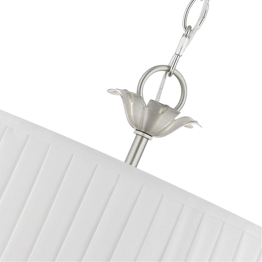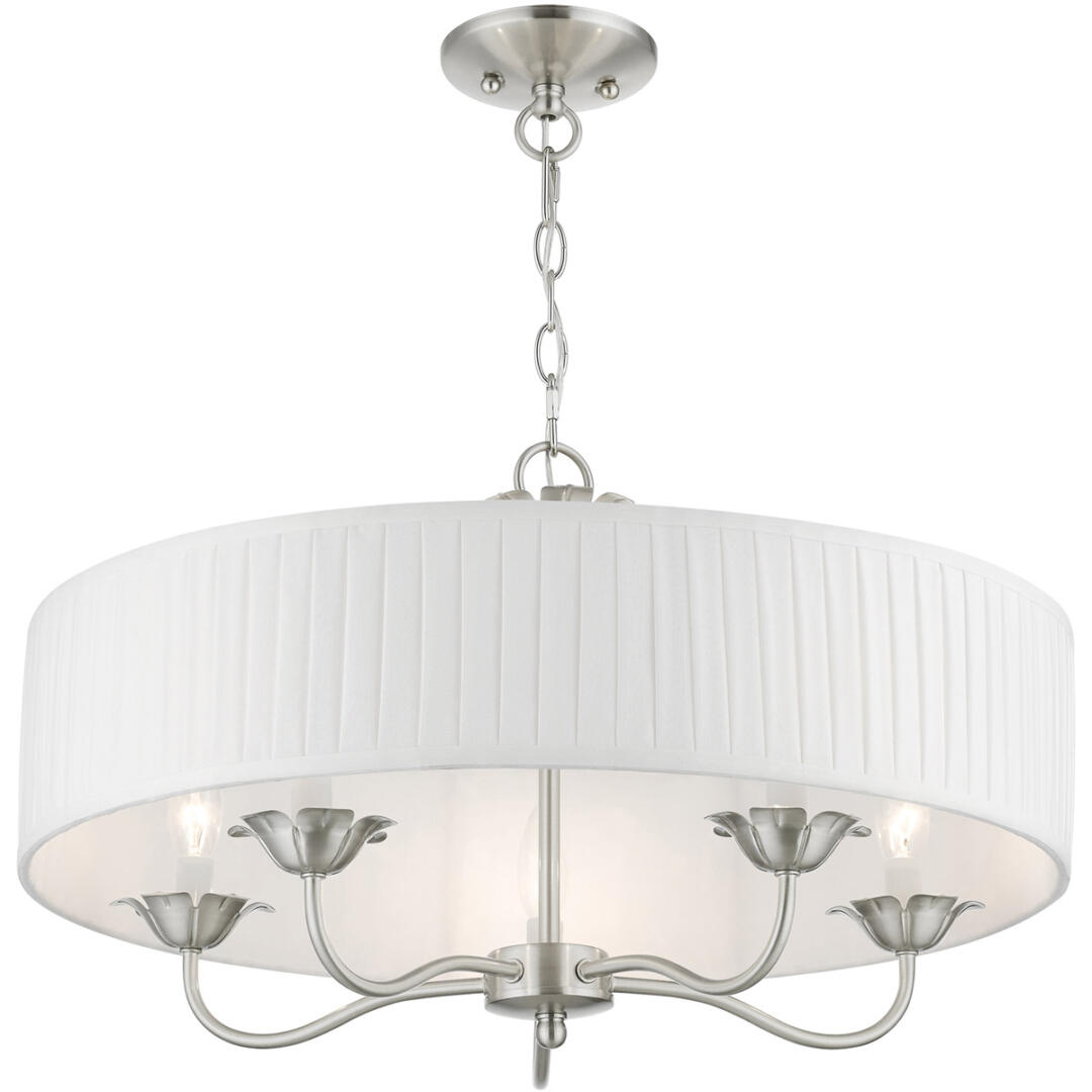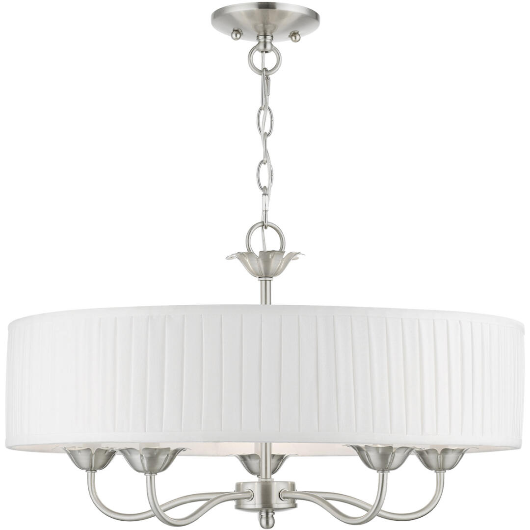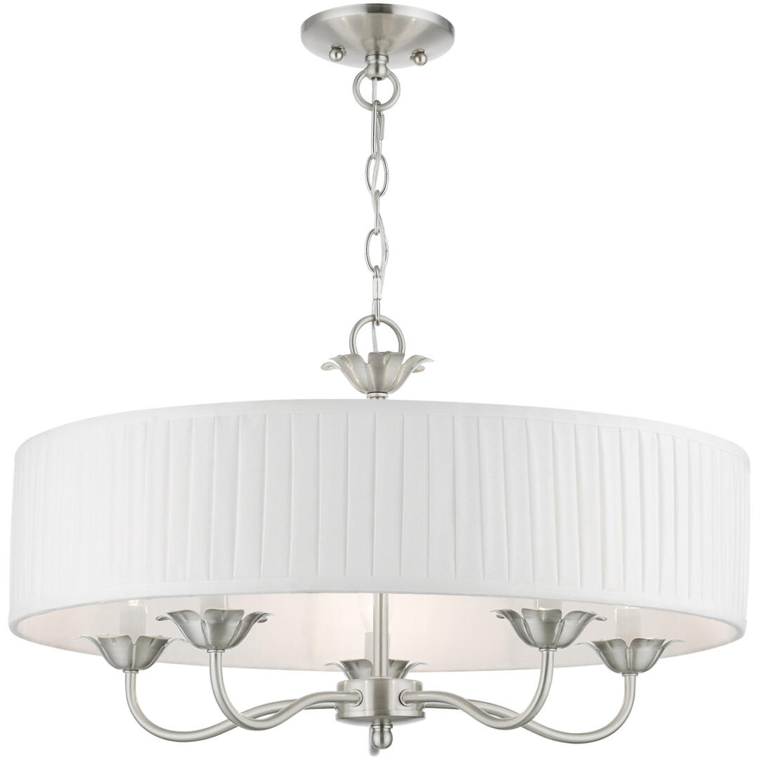 The five-light Edinburgh pendant chandelier combines floral details and casual elements to create an updated look. The hand-crafted off-white fabric hardback pleated drum shade is set off by an inner silky white fabric that combines with chandelier-like brushed nickel finish sweeping arms which creates a versatile effect. Perfect fit for the living room, dining room, kitchen or bedroom.
