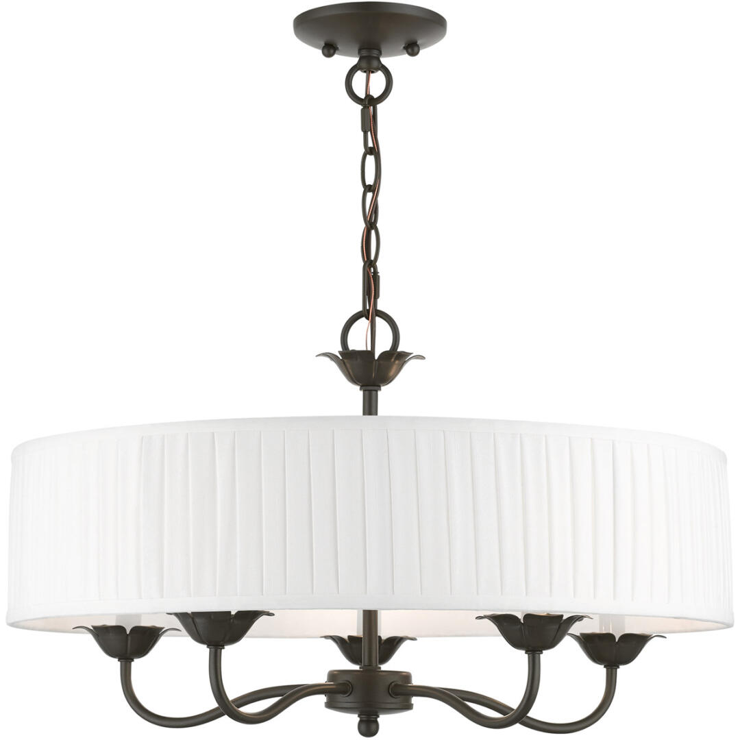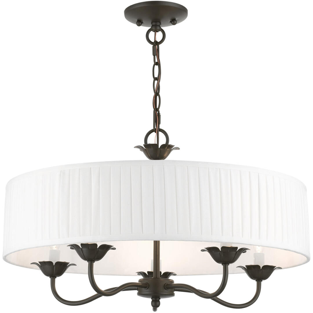 The five-light Edinburgh pendant chandelier combines floral details and casual elements to create an updated look. The hand-crafted off-white fabric hardback pleated drum shade is set off by an inner silky white fabric that combines with chandelier-like English bronze finish sweeping arms which creates a versatile effect. Perfect fit for the living room, dining room, kitchen or bedroom.