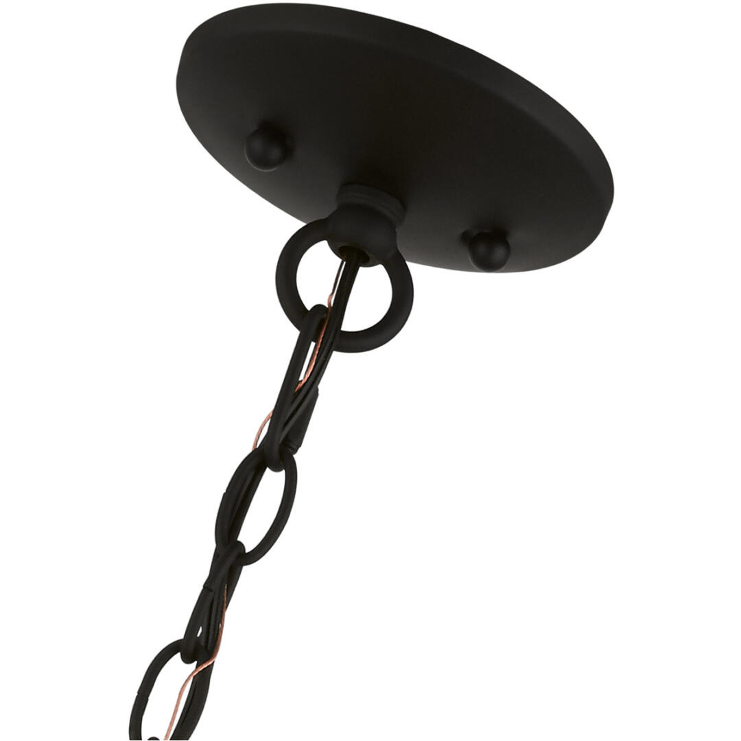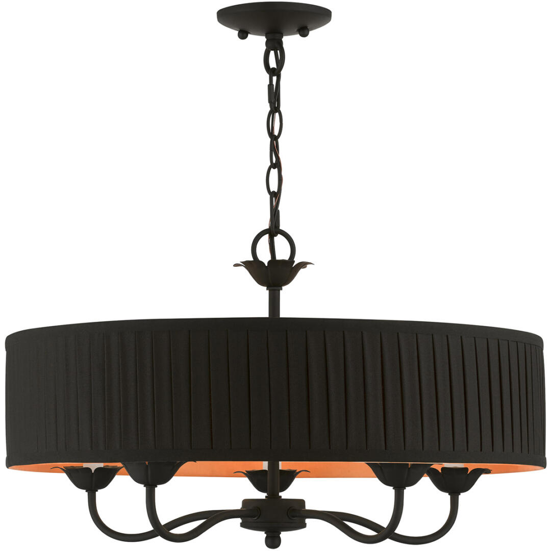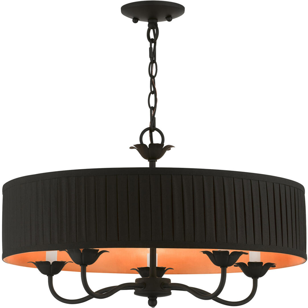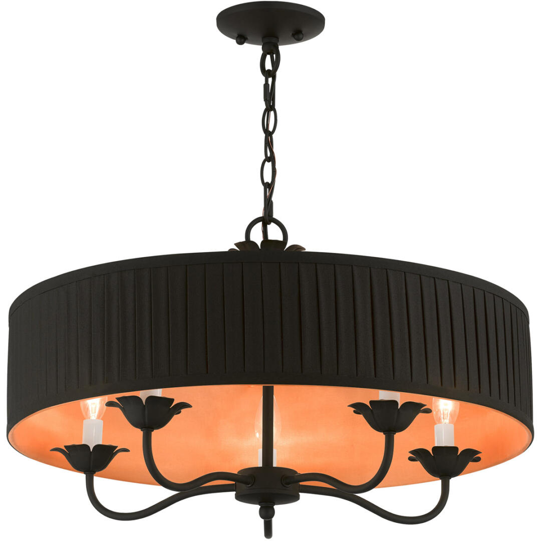 The five-light Harrington pendant chandelier combines floral details and casual elements to create an updated look. The hand-crafted black fabric hardback pleated drum shade is set off by an inner silky orange fabric that combines with chandelier-like black finish sweeping arms which creates a versatile effect. Perfect fit for the living room, dining room, kitchen or bedroom.