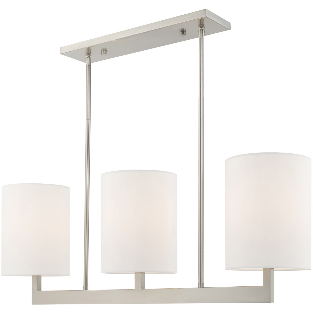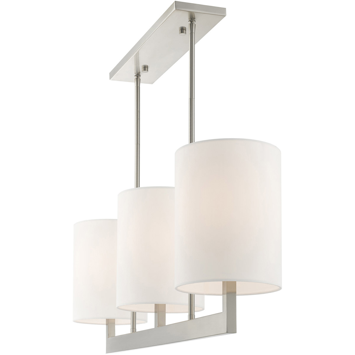 Raise the style bar with a designer linear chandelier in a handsome and versatile contemporary manner. This three light linear chandelier comes in a brushed nickel finish with round off-white fabric hardback shade.