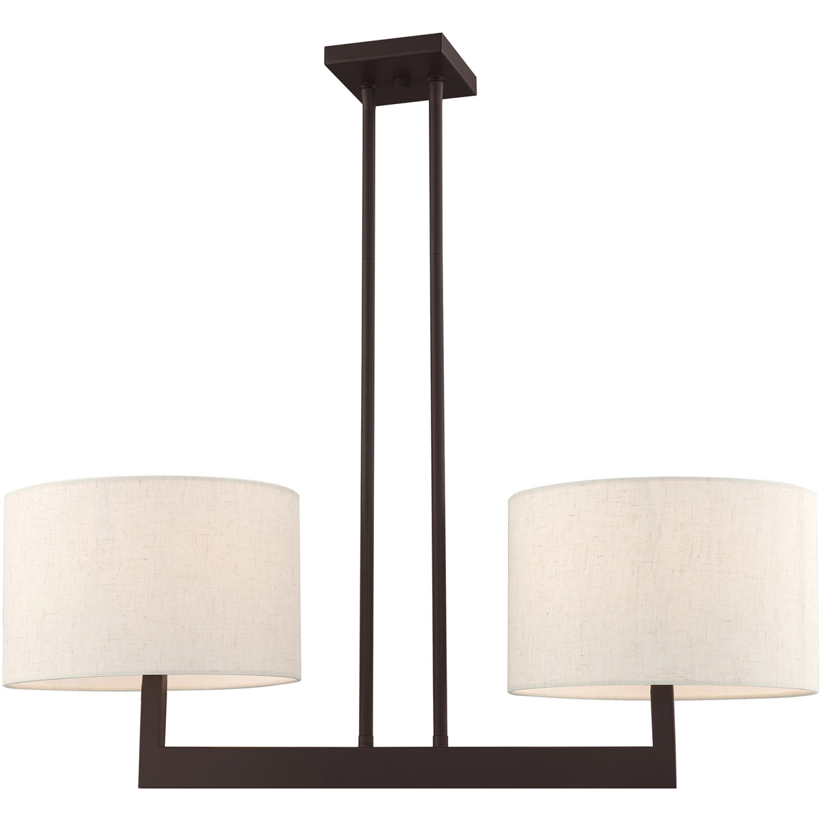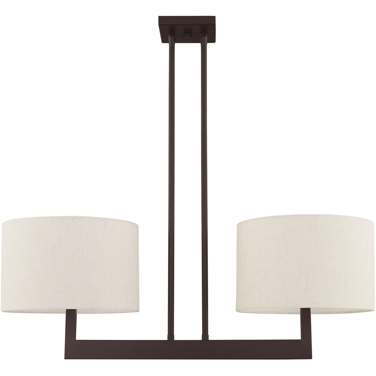 Raise the style bar with a designer linear chandelier in a handsome and versatile contemporary manner. This two light linear chandelier comes in a bronze finish with round oatmeal fabric hardback shade.