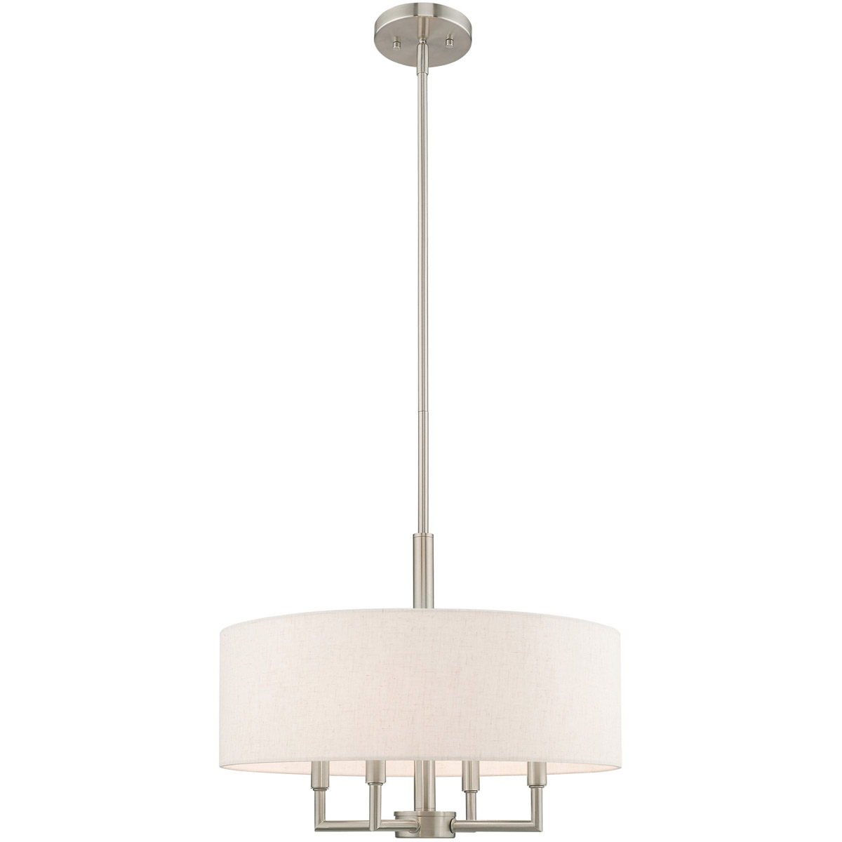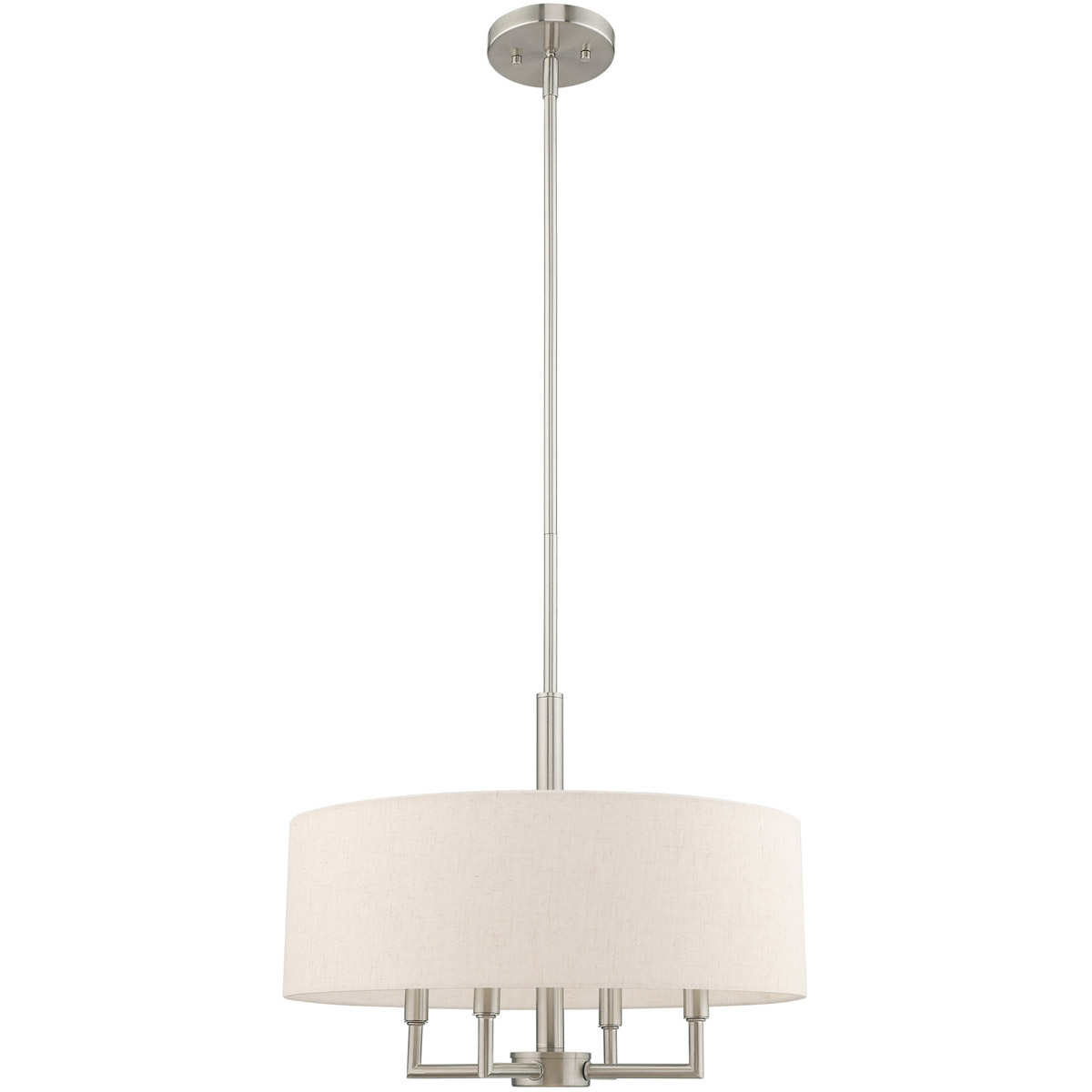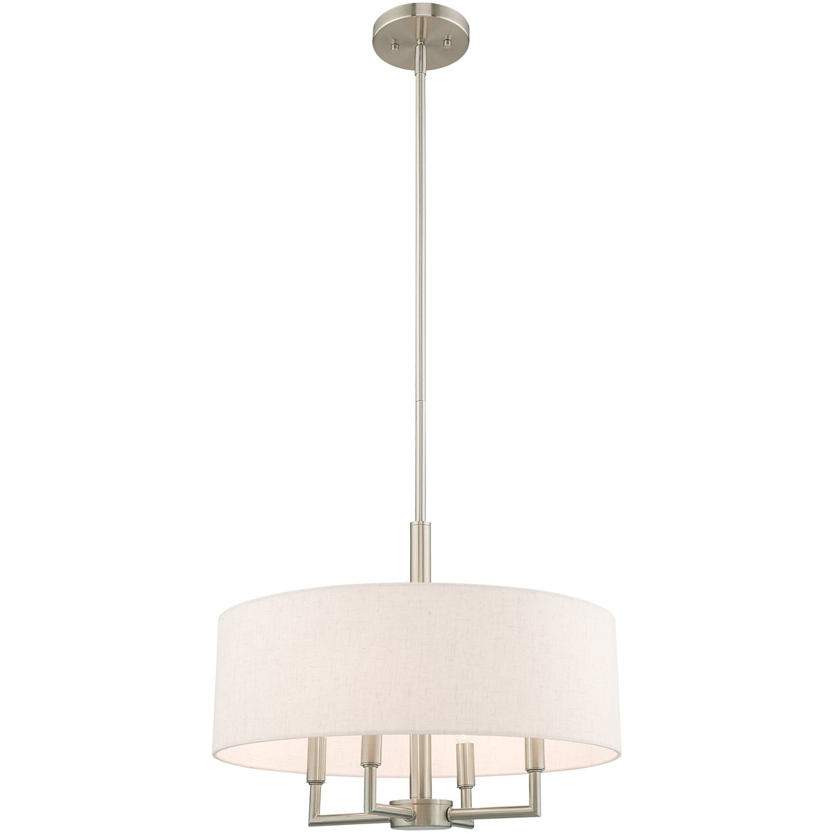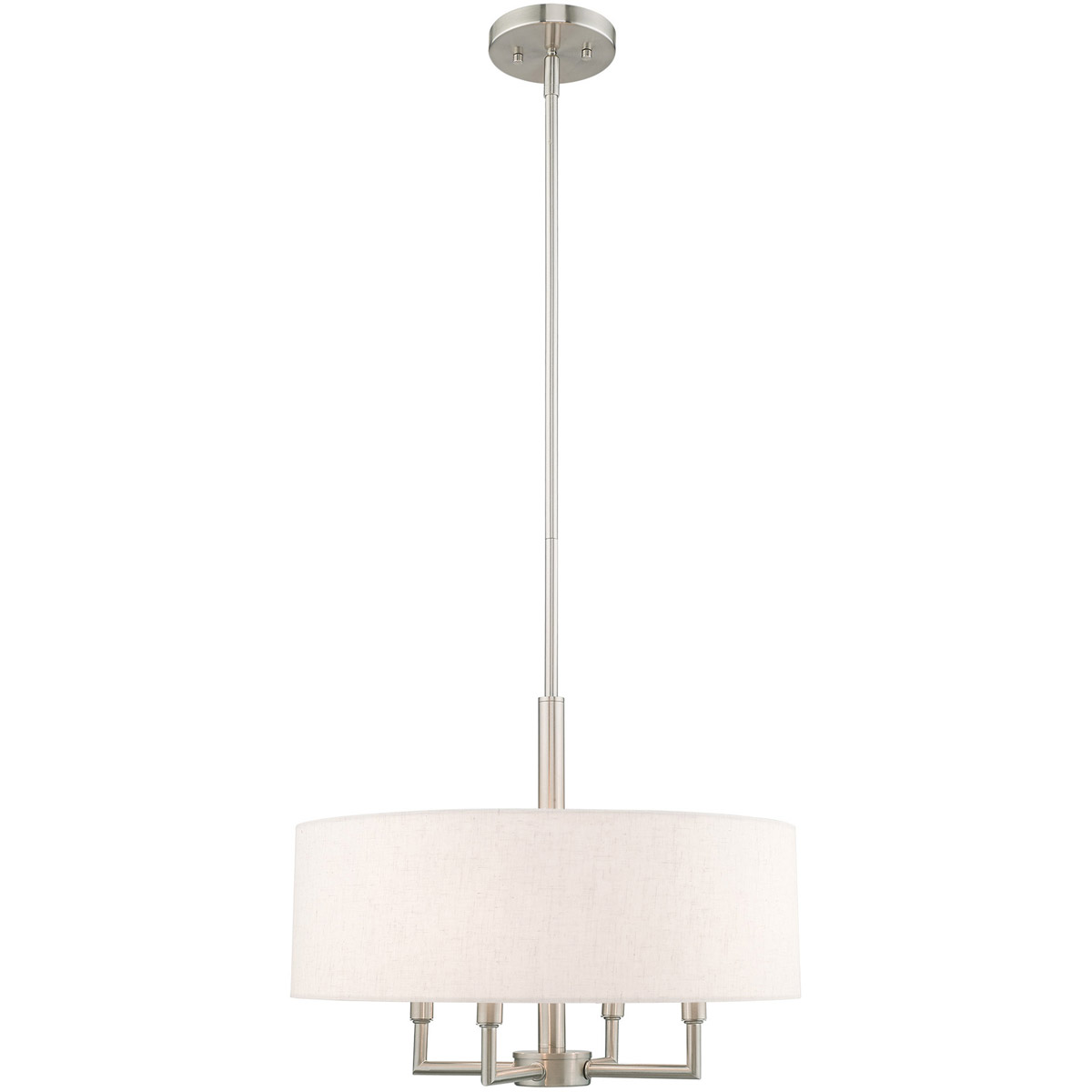 This 4 light pendant from the Meridian collection has a clean, crisp look and contemporary appeal. The sleek design and angular arm feature a brushed nickel finish. The hand crafted oatmeal fabric hardback shade offers warm light for your surroundings.