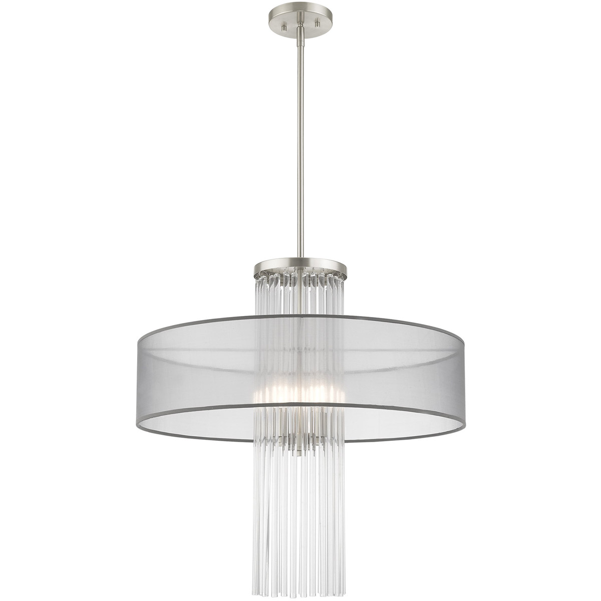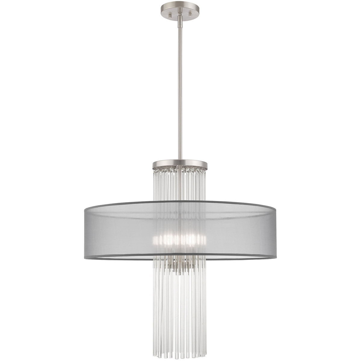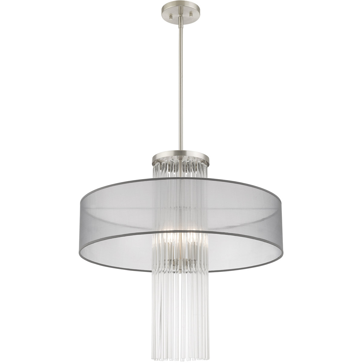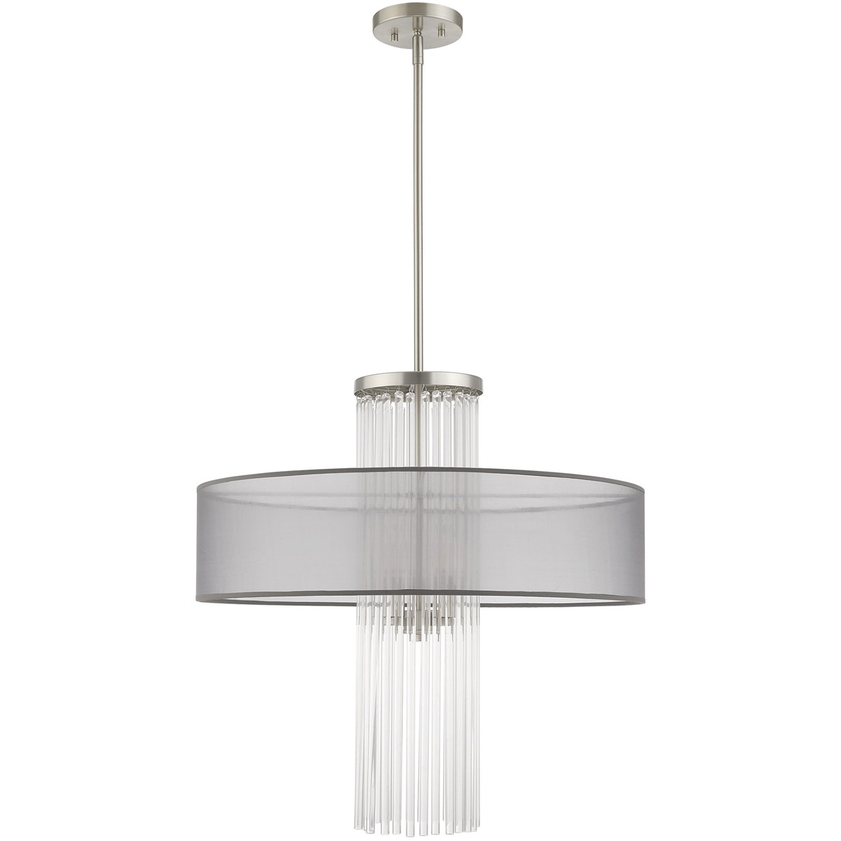 Dazzle contemporary decor schemes with the upscale feel of this pendant chandelier fixture. The Alexis fills a bling quotient with beautiful grade-A K9 crystal rods that cascades from a brushed nickel base with a hand crafted translucent gray shade.