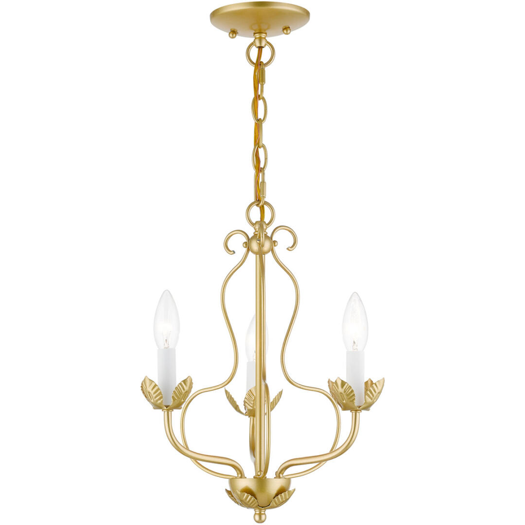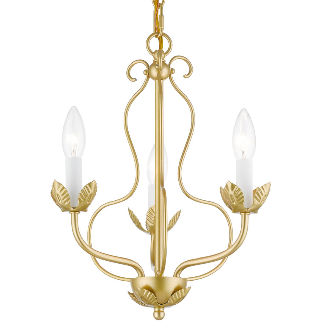 The three-light Katarina floral chandelier showcases a graceful look. The soft gold finish completes this timeless and casual design.