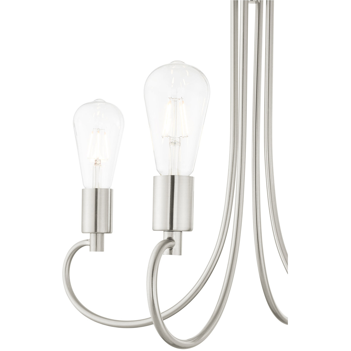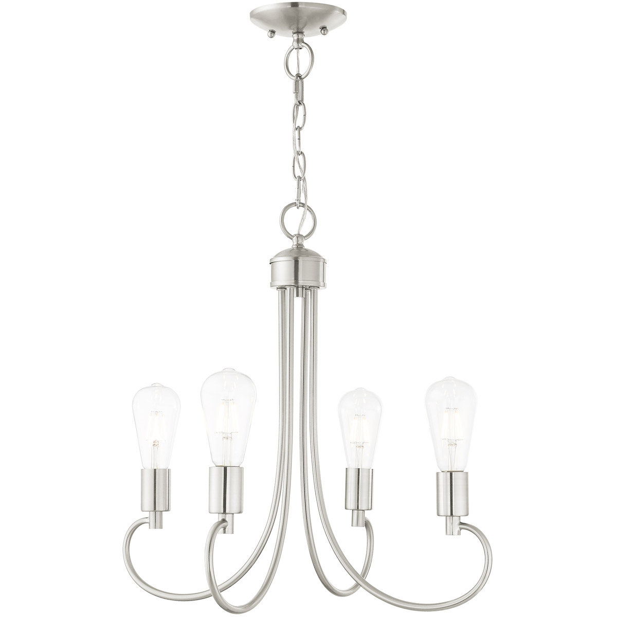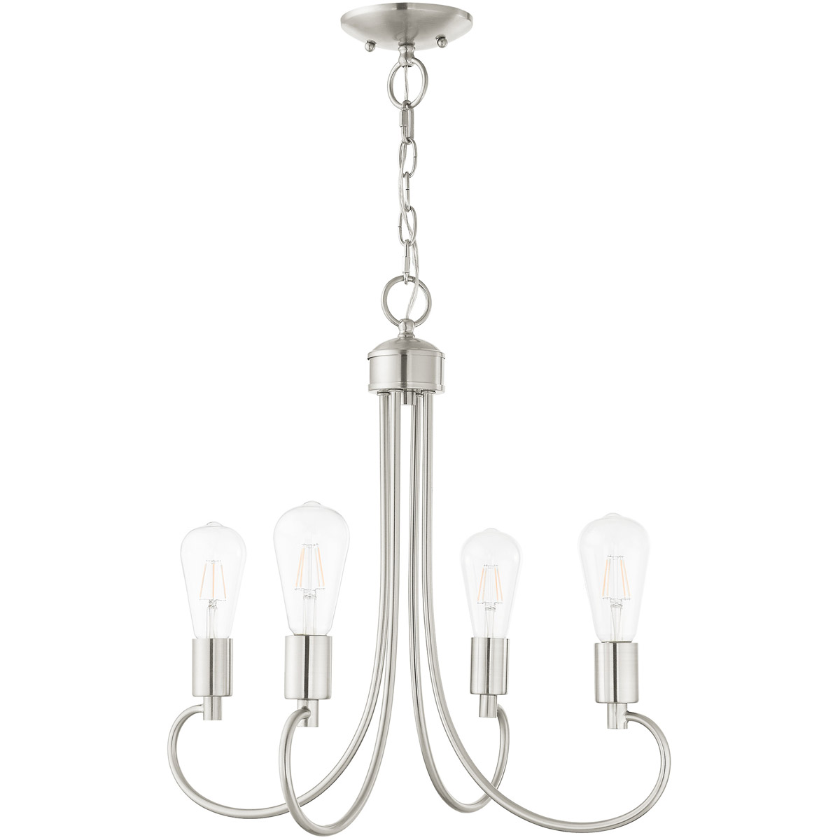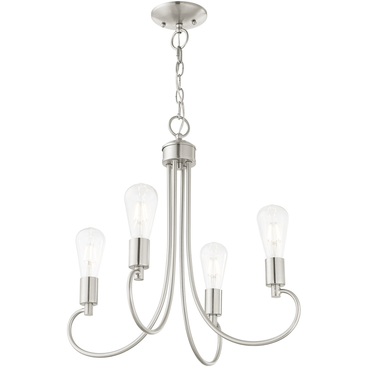 Graceful curved lines and exposed bulb sockets make the Bari collection perfect for your mid-mod or transitional home. The eclectic look is perfect for spaces wanting an urban, minimalistic or industrial touch. With superb craftsmanship and affordable price, this brushed nickel finish small four-light chandelier is sure to tastefully indulge your extravagant side.