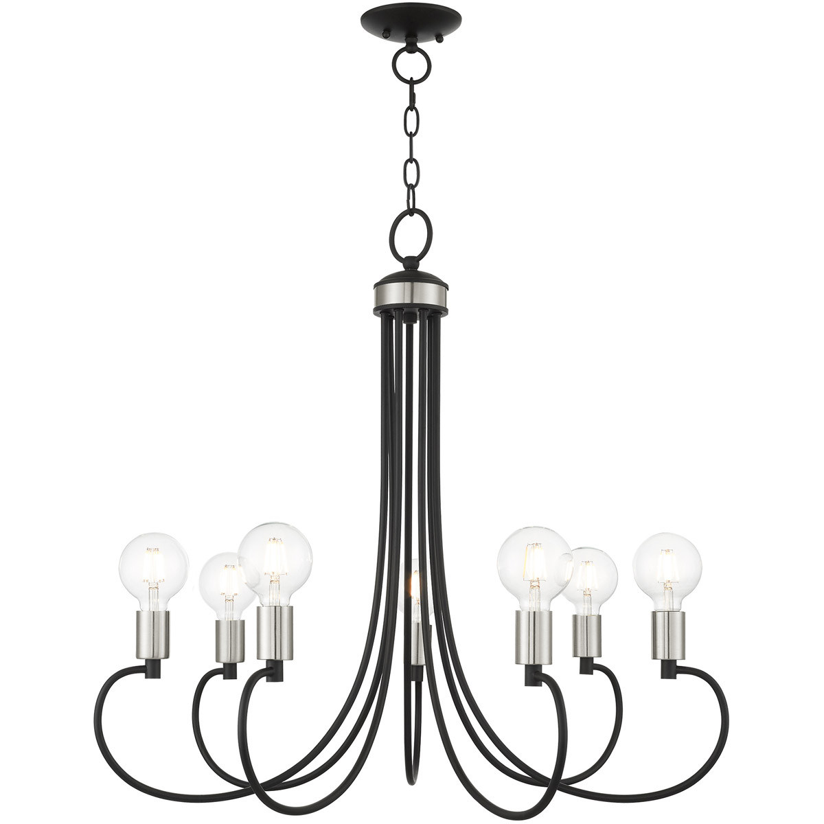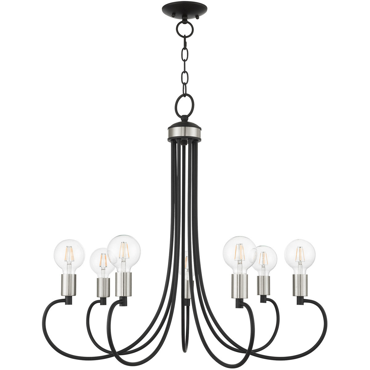Graceful curved lines and exposed bulb sockets make the Bari collection perfect for your mid-mod or transitional home. The eclectic look is perfect for spaces wanting an urban, minimalistic or industrial touch. With superb craftsmanship and affordable price, this black finish with brushed nickel finish accents seven-light chandelier is sure to tastefully indulge your extravagant side.