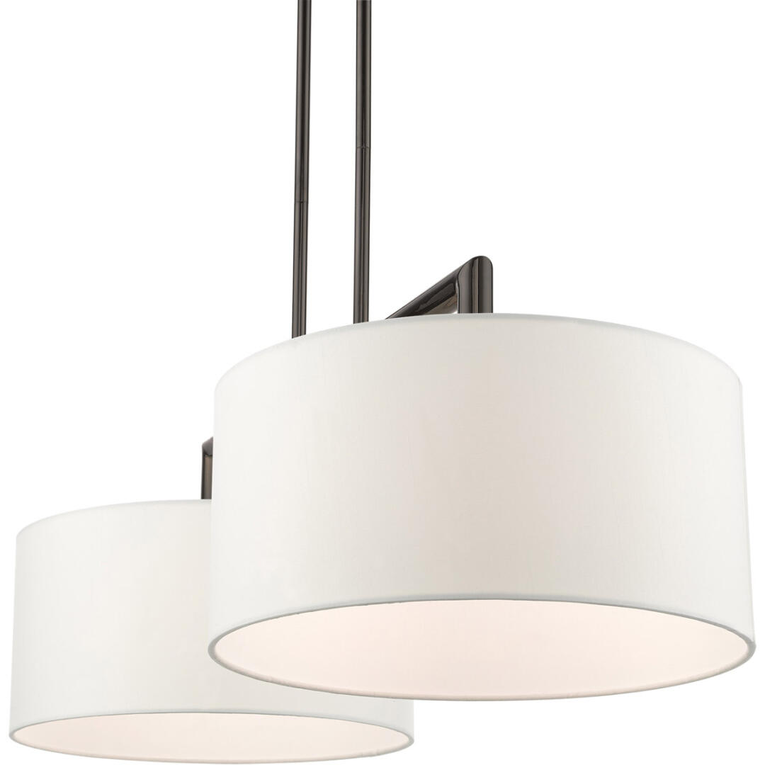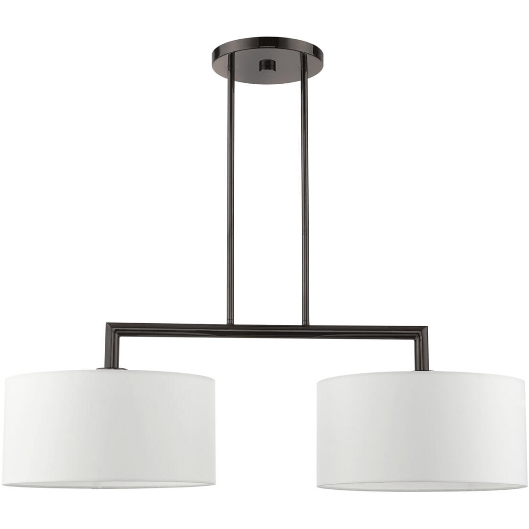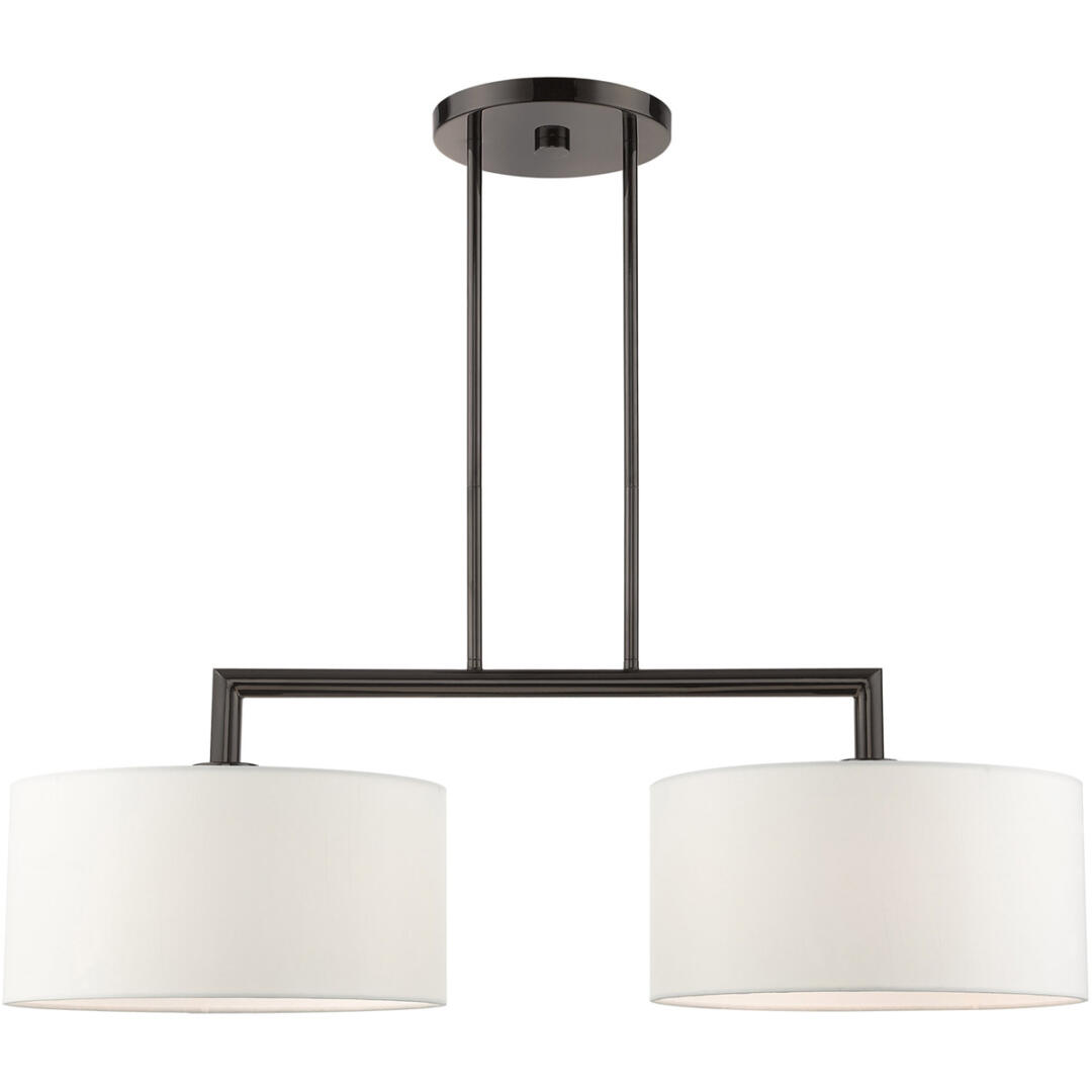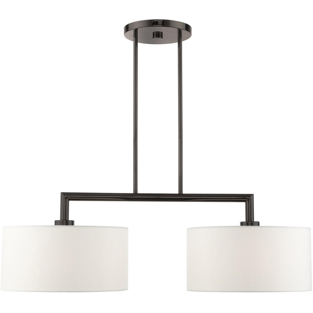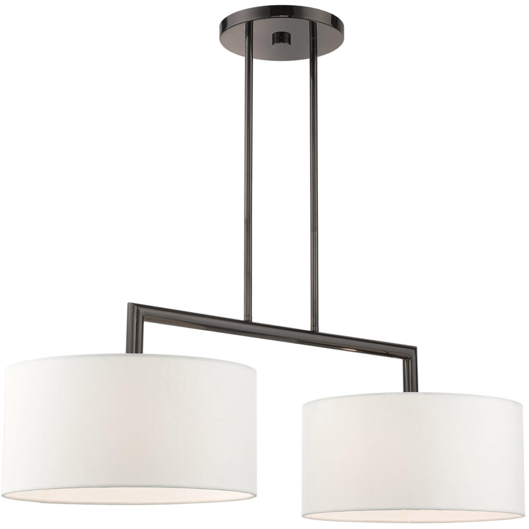 The Meridian collection has a clean, crisp look and contemporary appeal. The hand-crafted off-white fabric hardback shades offer a diffused warm light. This two-light linear chandelier has a sleek upper frame over the shades. Will adapt well in the living room, dining room and over the kitchen island tastefully elevating your style. This sleek design is shown in a black chrome finish.