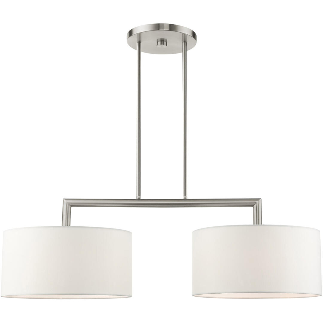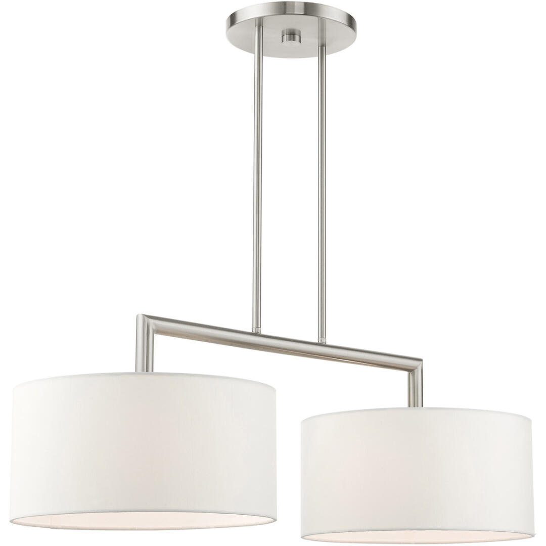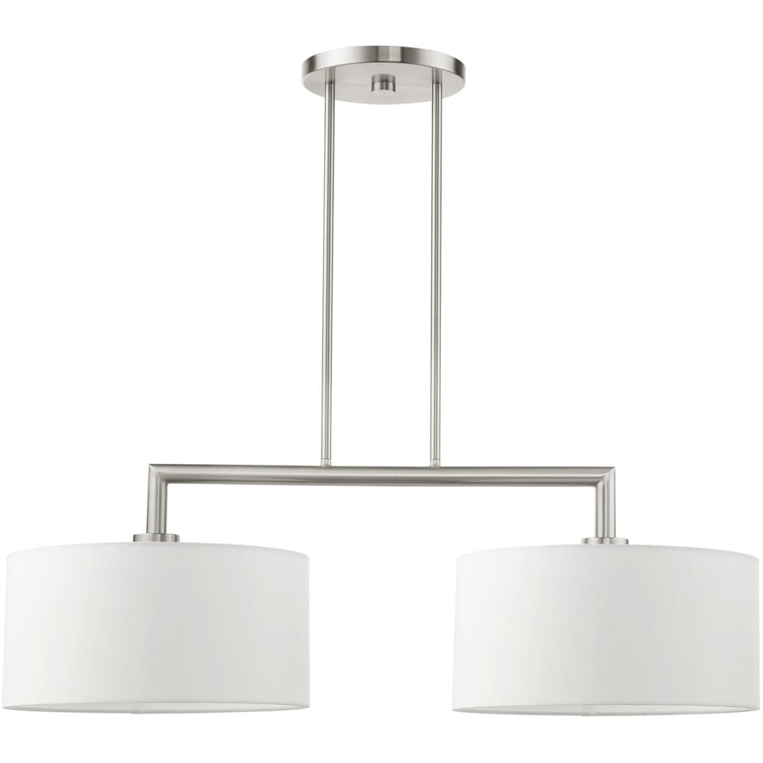 The Meridian collection has a clean, crisp look and contemporary appeal. The hand-crafted off-white fabric hardback shades offer a diffused warm light. This two-light linear chandelier has a sleek upper frame over the shades. Will adapt well in the living room, dining room and over the kitchen island tastefully elevating your style. This sleek design is shown in a brushed nickel finish.