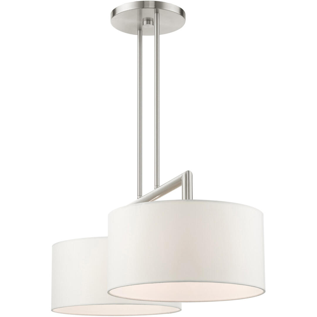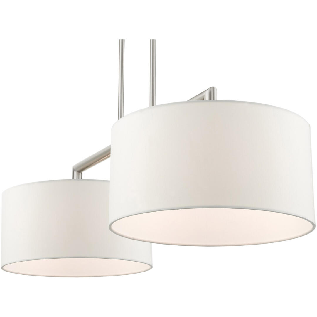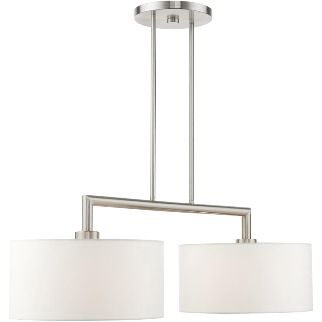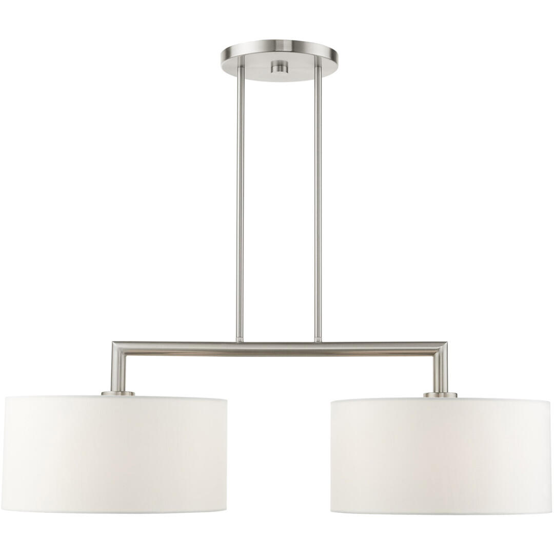 The Meridian collection has a clean, crisp look and contemporary appeal. The hand-crafted off-white fabric hardback shades offer a diffused warm light. This two-light linear chandelier has a sleek upper frame over the shades. Will adapt well in the living room, dining room and over the kitchen island tastefully elevating your style. This sleek design is shown in a brushed nickel finish.