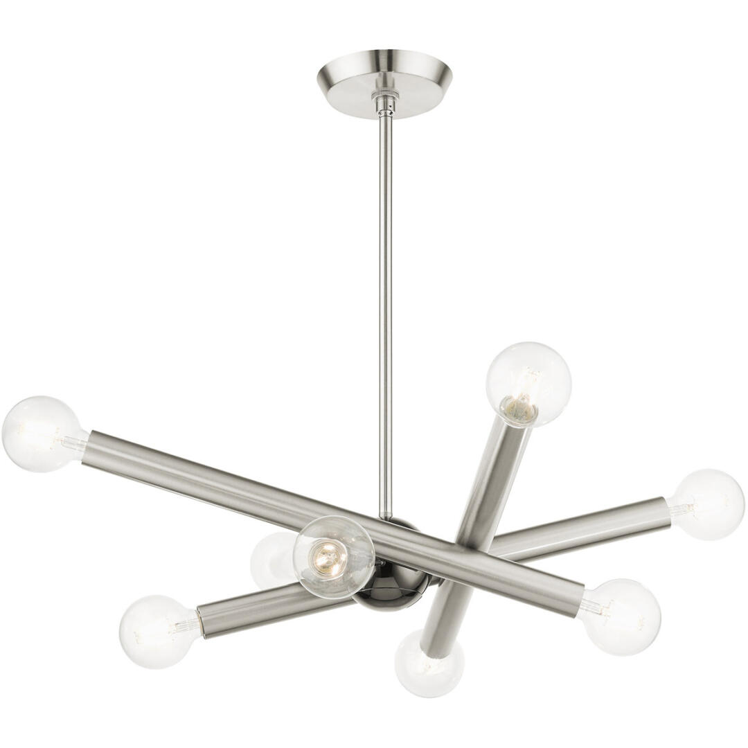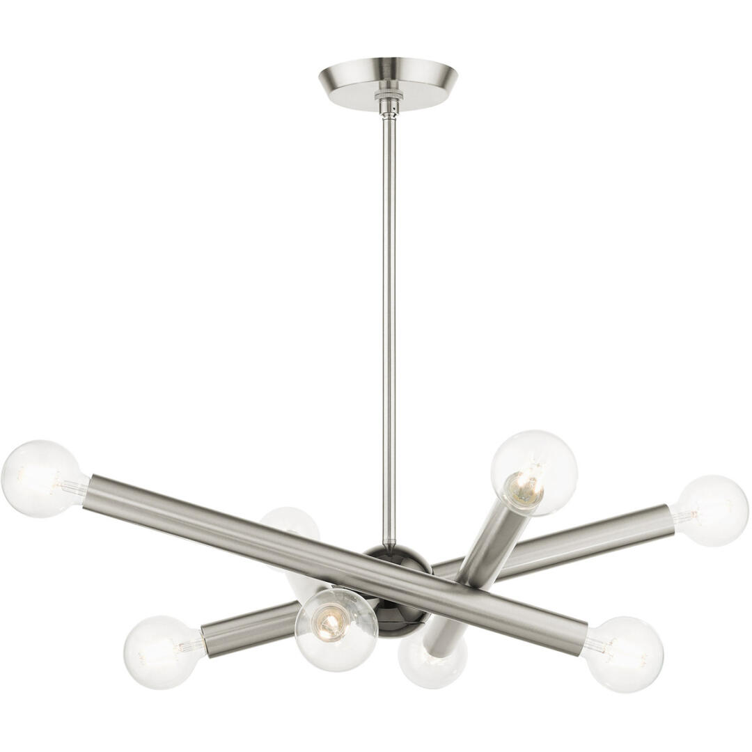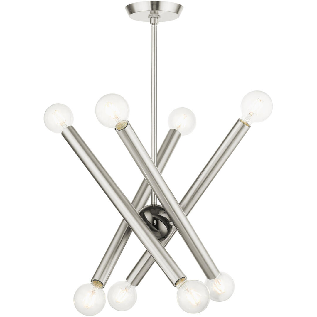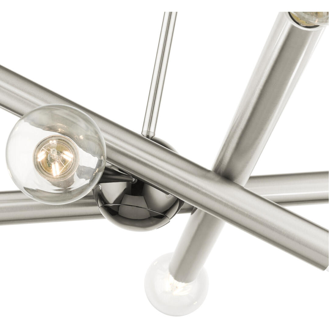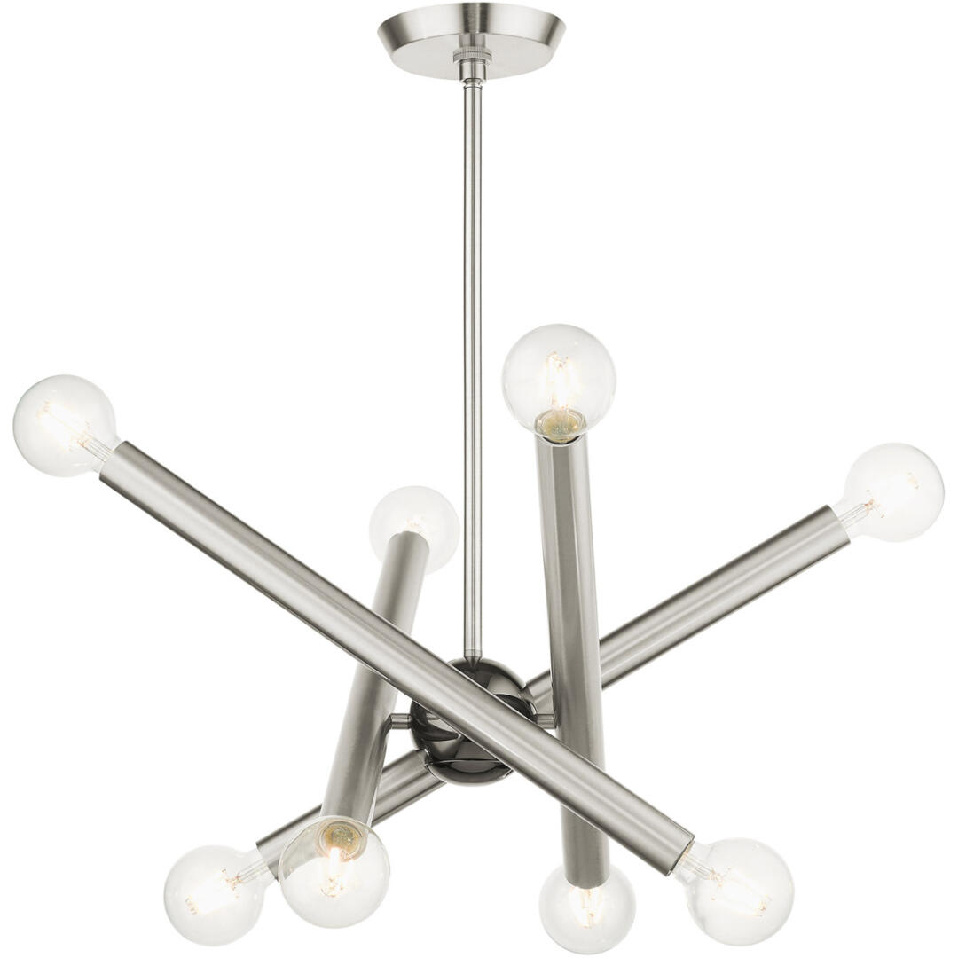 The Stafford collection inherits the multidirectional lines inspired by the Sputnik. The exposed bulbs glimmer at the end of each arm to create a movement in a modern space. The timeless design will fill any room with a playful mood. This eight-light chandelier would look great suspended in the living room, a modern dining room or over the countertop. It is presented in a brushed nickel finish with a black chrome accent.