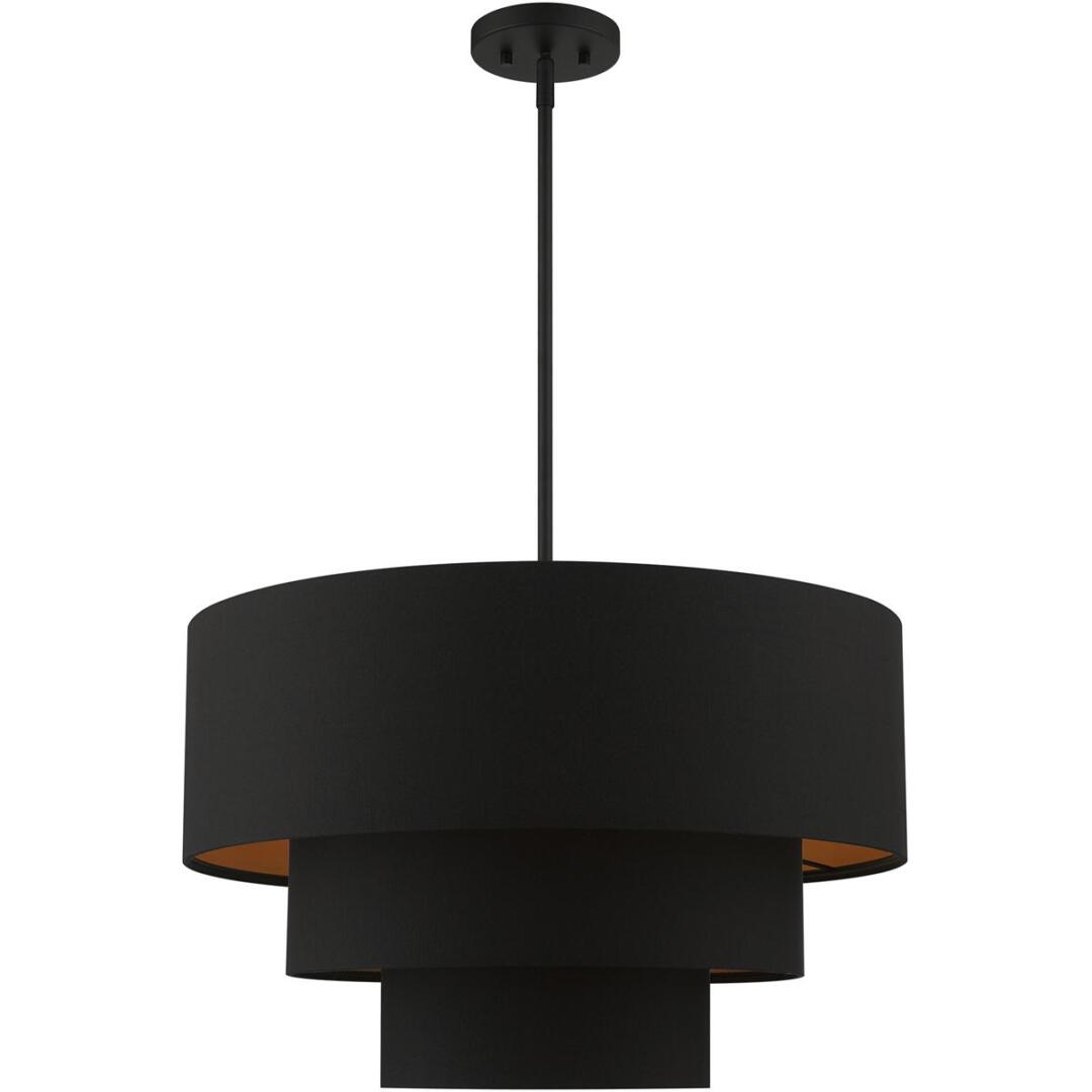 The Sentosa collection has a modern and retro appeal. The hand-crafted black fabric hardback shades are set off by the silky orange fabric on the inside creating an intriguing effect. The four-light triple drum shade adds character to this handsomely styled pendant. Perfect fit for the living room, dining room, kitchen and bedroom. This sleek design is shown in a black finish.