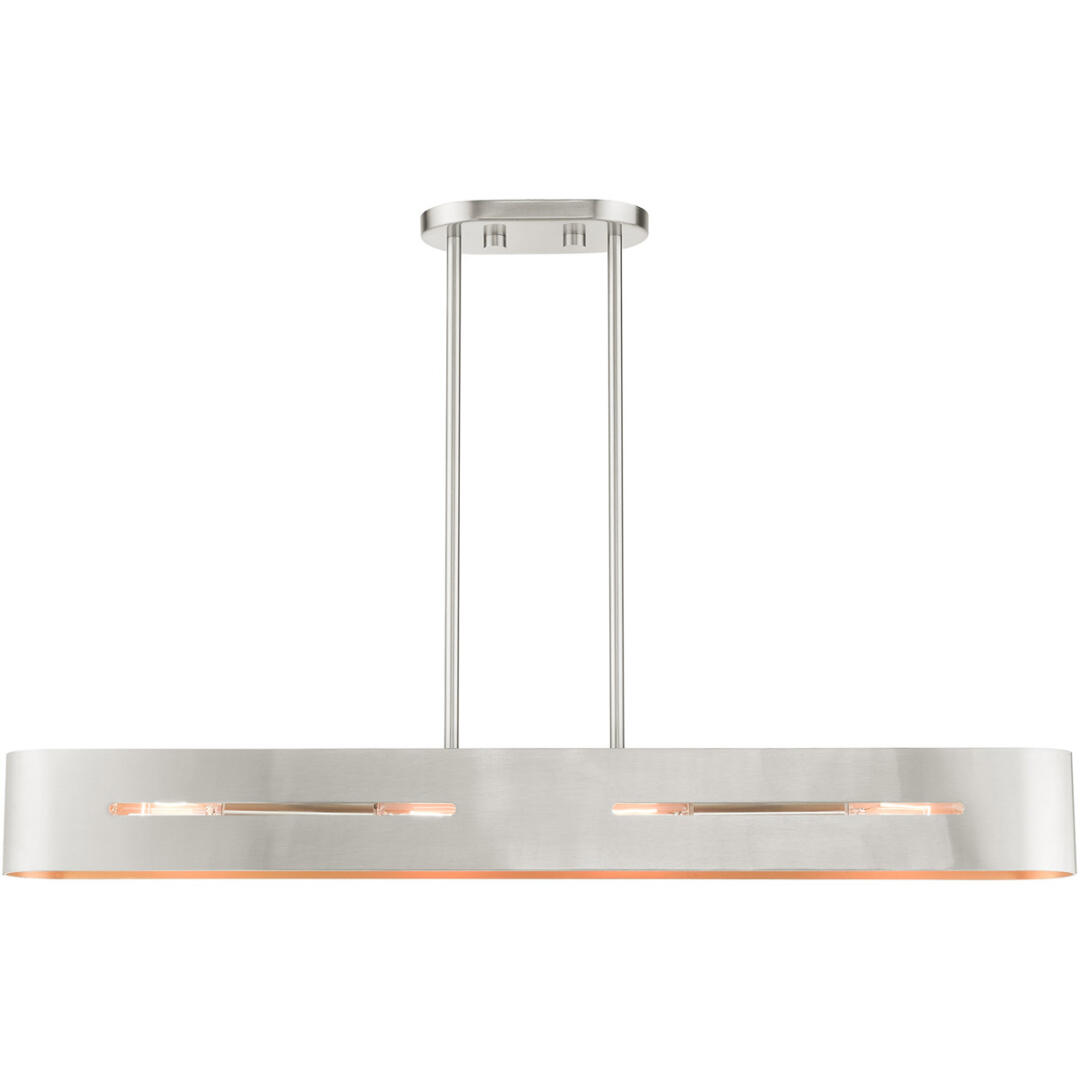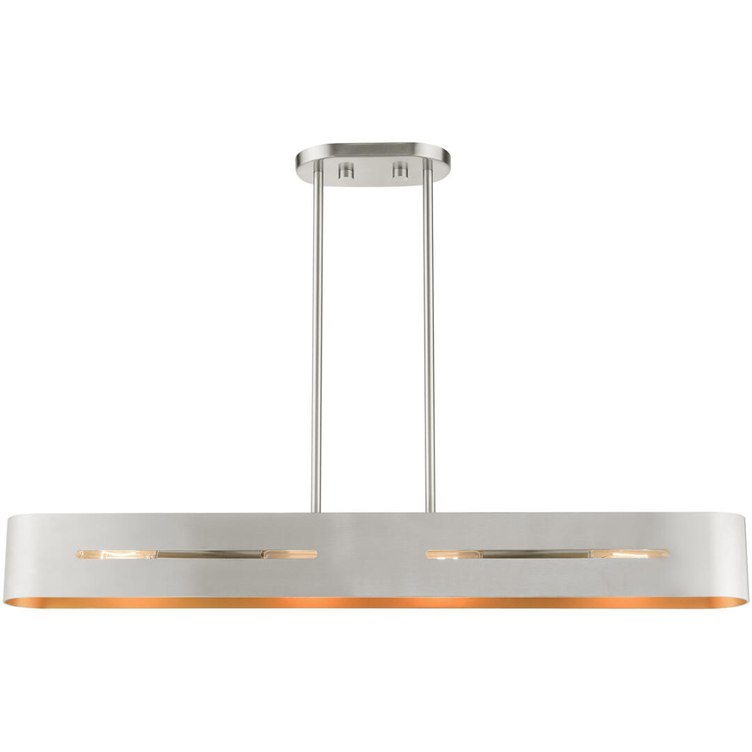 Inspired by Scandinavian design, the Ravena collection makes a definitive statement with strong silhouettes, clean lines and is a stunning focal point in a modern urban style interior. The exposed bulbs make a beautiful complement to the distinctive contrasting finishes. This stunning four light linear chandelier fits perfectly in a minimalistic modern dining room, over the kitchen countertop or in the living room and it is presented in a brushed nickel finish with gold finish inside.
