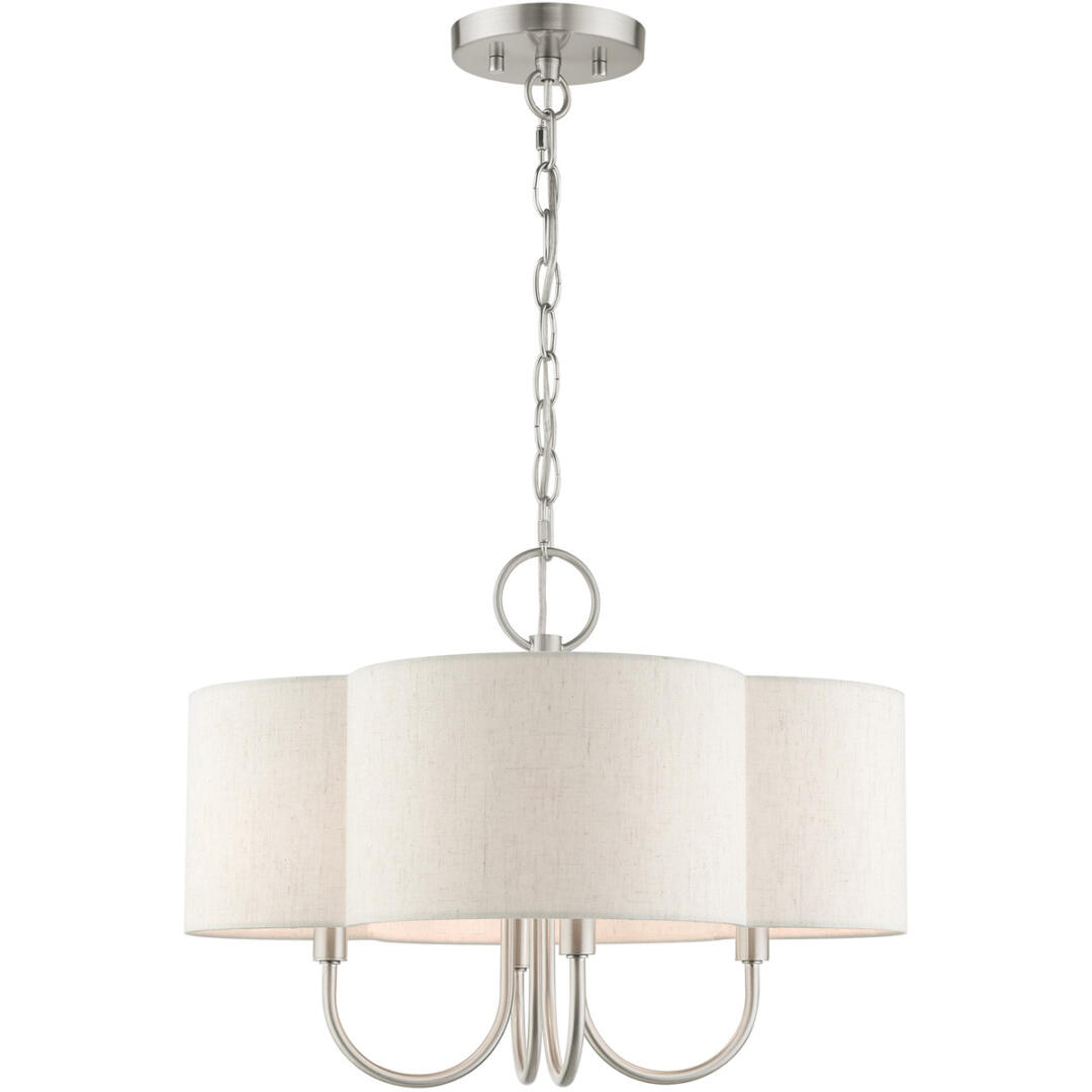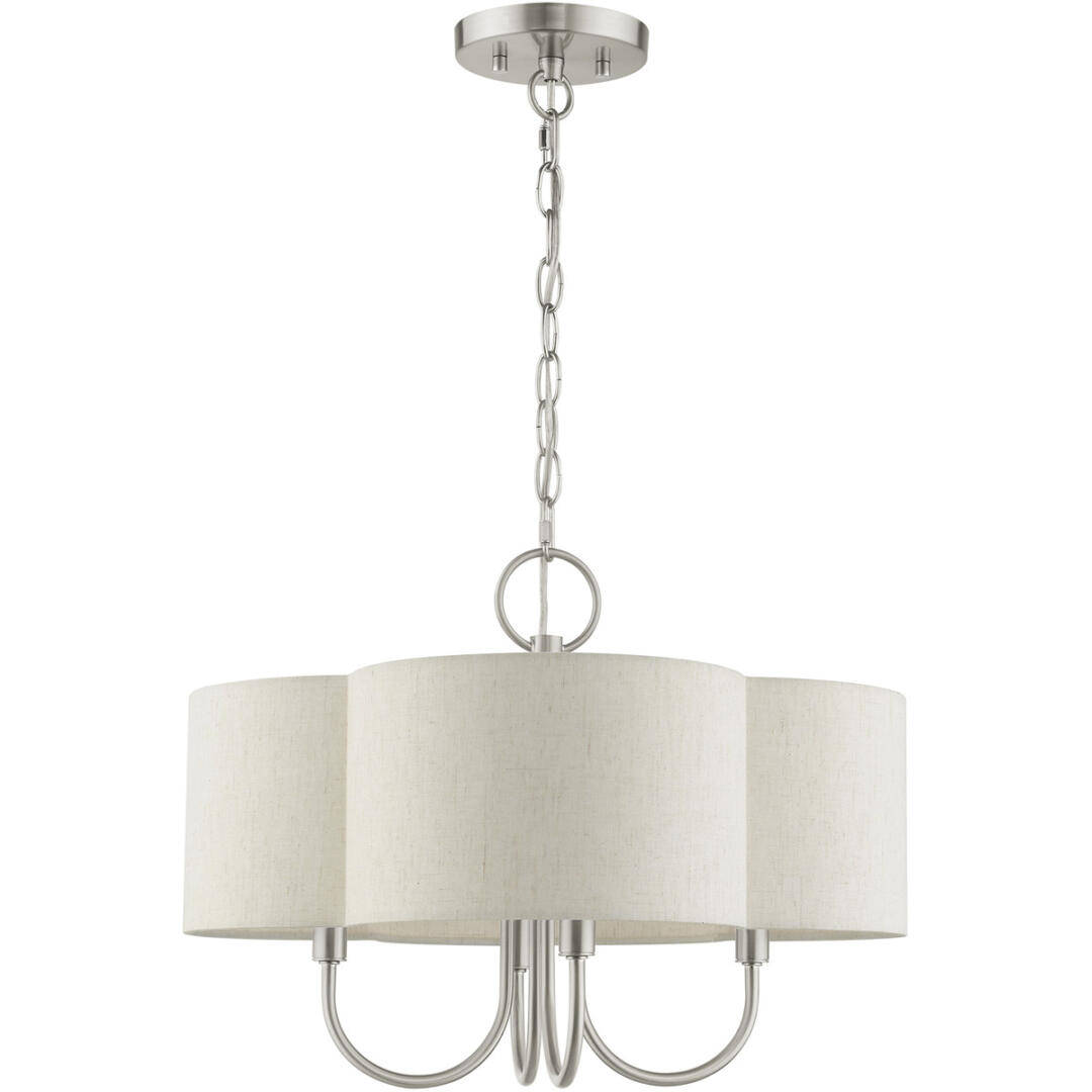 The Solstice series evokes a French country chic vibe. This four-light pendant chandelier features a beautiful hand crafted scalloped shaped, oatmeal colored hardback shade situated on an elegantly curved frame. It is shown in a brushed nickel finish and is the perfect finishing touch for a traditional, transitional or contemporary style interior. Enjoy this design in the living room, bedroom, dining room or over your kitchen island.