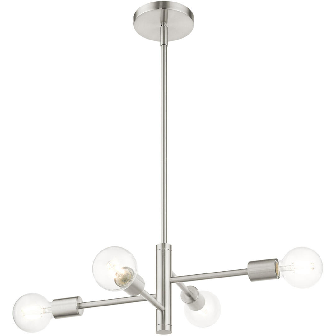 Simplicity and attention to detail are the key elements of the Bannister collection. The dimensional form, exposed bulbs and combination of finishes adds a playful mood to a contemporary or urban interior. This four-light asymmetrical chandelier design gives a new face to a kitchen, dining room, living room or a bedroom. It is shown in a brushed nickel finish.