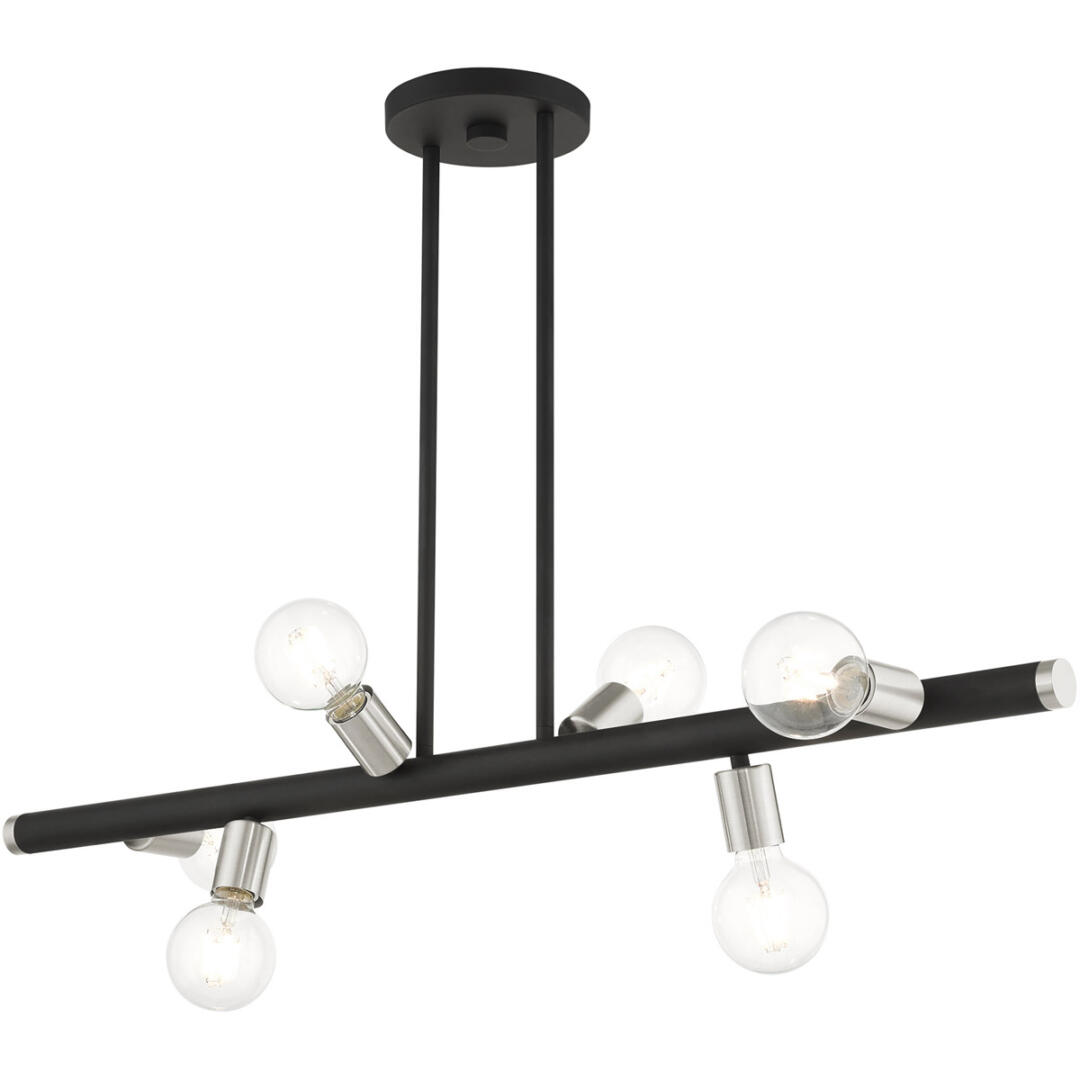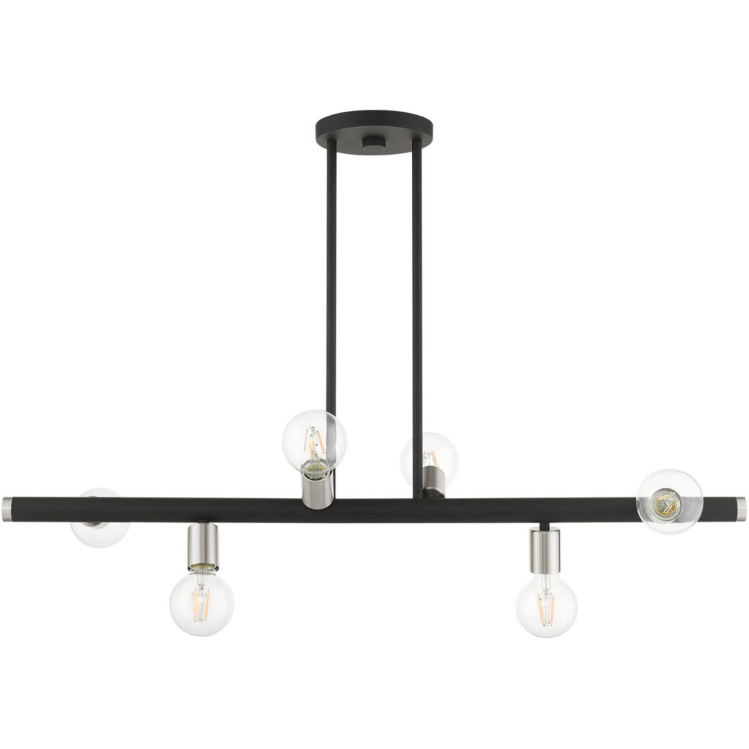 Simplicity and attention to detail are the key elements of the Bannister collection. The dimensional form, exposed bulbs and combination of finishes adds a playful mood to a contemporary or urban interior. This six-light asymmetrical linear chandelier design gives a new face to a kitchen or dining room. It is shown in a black finish with brushed nickel accents.