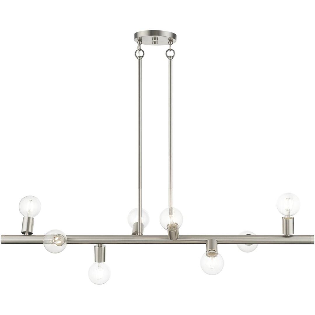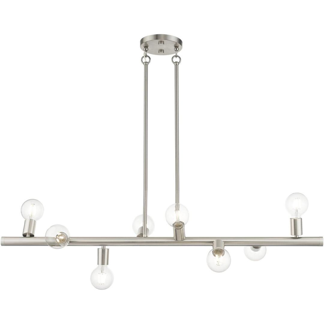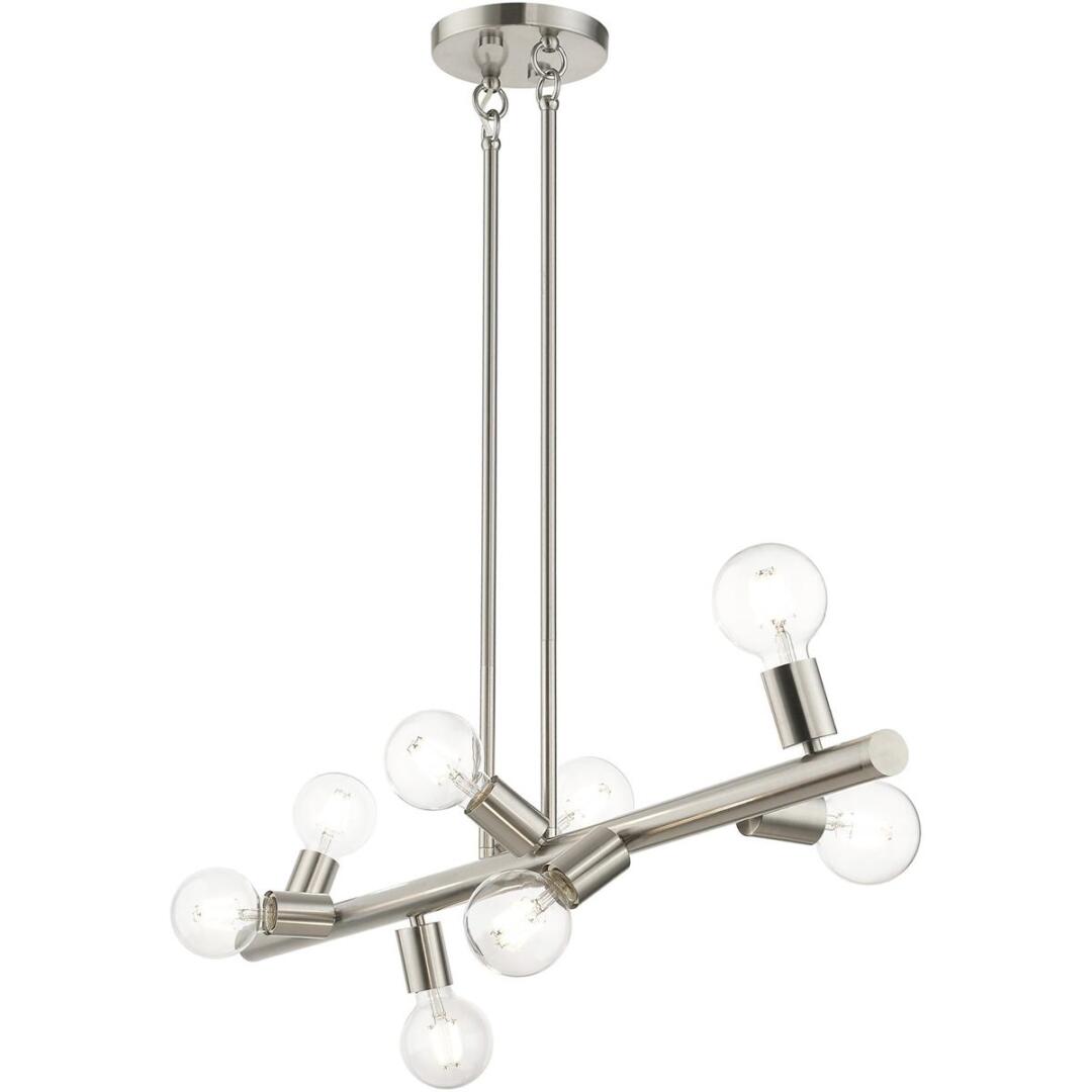 Simplicity and attention to detail are the key elements of the Bannister collection. The dimensional form, exposed bulbs and combination of finishes adds a playful mood to a contemporary or urban interior. This eight-light asymmetrical large chandelier design gives a new face to a kitchen or dining room. It is shown in a brushed nickel.