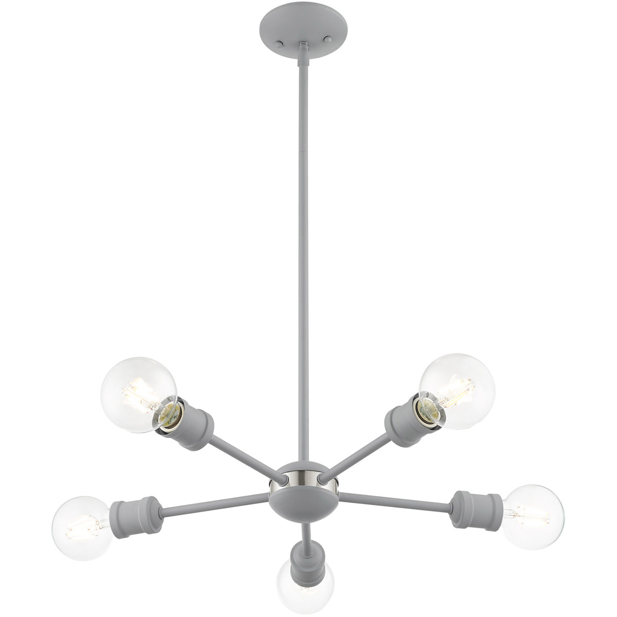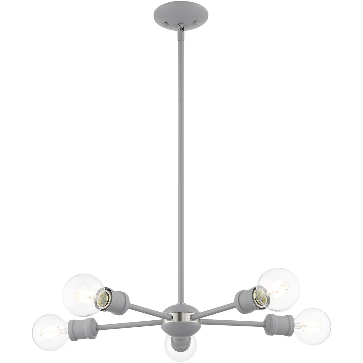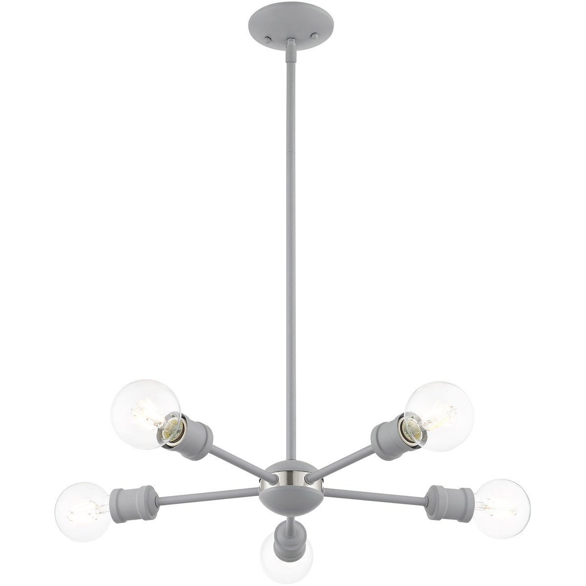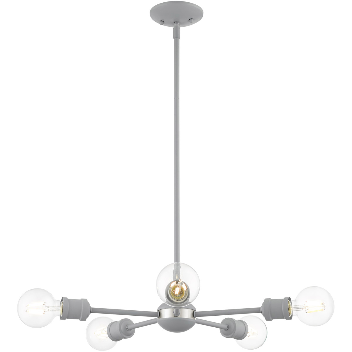 Simplicity and attention to detail are the key elements of the Lansdale collection. The dimensional form, exposed bulbs and combination of finishes adds a playful mood to a contemporary or urban interior. This five-light chandelier design gives a new face to a dining area or kitchen. It is shown in a Nordic gray finish.