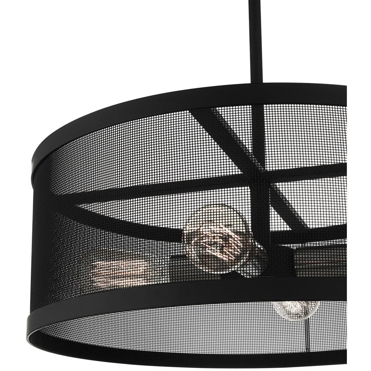 The Industro collection has a clean, crisp look and contemporary appeal. This four-light pendant chandelier has a black finish with brushed nickel finish accents and a sleek stainless steel mesh shade. Will adapt well in the living room, dining room and bedroom tastefully elevating your style.