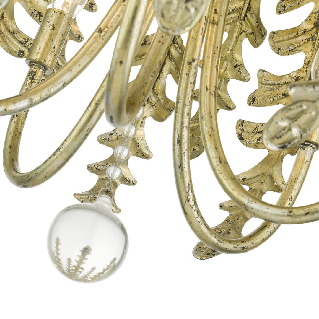 The name for the Acanthus collection is inspired by the simple beauty of the Acanthus leaf. The lights are hidden behind the graceful leaves to create a romantic warm indirect effect. Finished off in a distressed winter gold finish, this five-light shabby chic chandelier is embellished with a clear crystal ball. This strong, alluring piece will provide warm glow to your dining room, kitchen, bedroom or living room to create a casual romantic atmosphere.