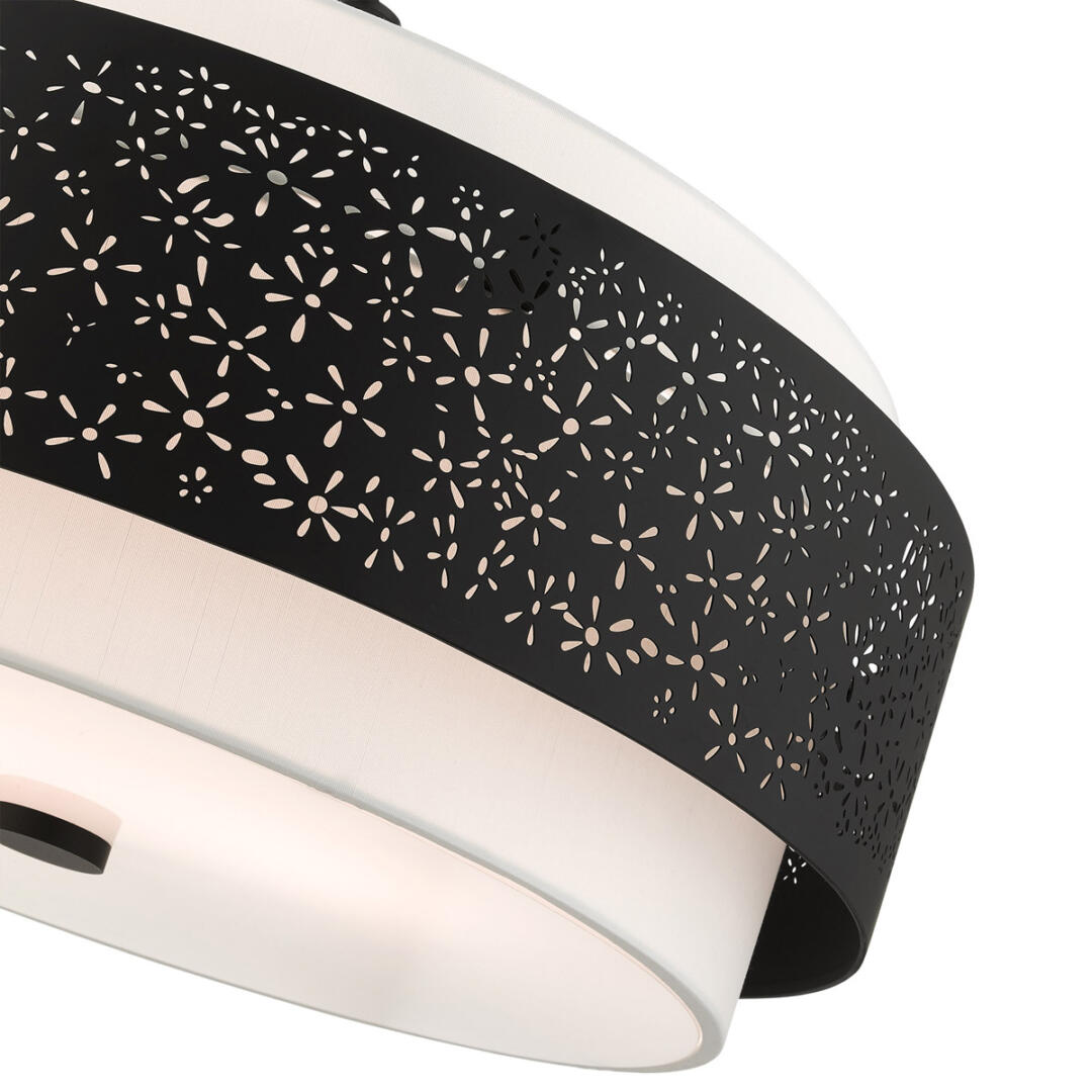 The Noria collection combines an intricate organic laser cut black finish steel frame surrounds an off-white fabric shade creating a casual warm light with a touch of nature vibe. This large five-light drum pendant will have a commanding presence in many areas of your home. You can suspend it in the living room, over the dining table or bedroom.