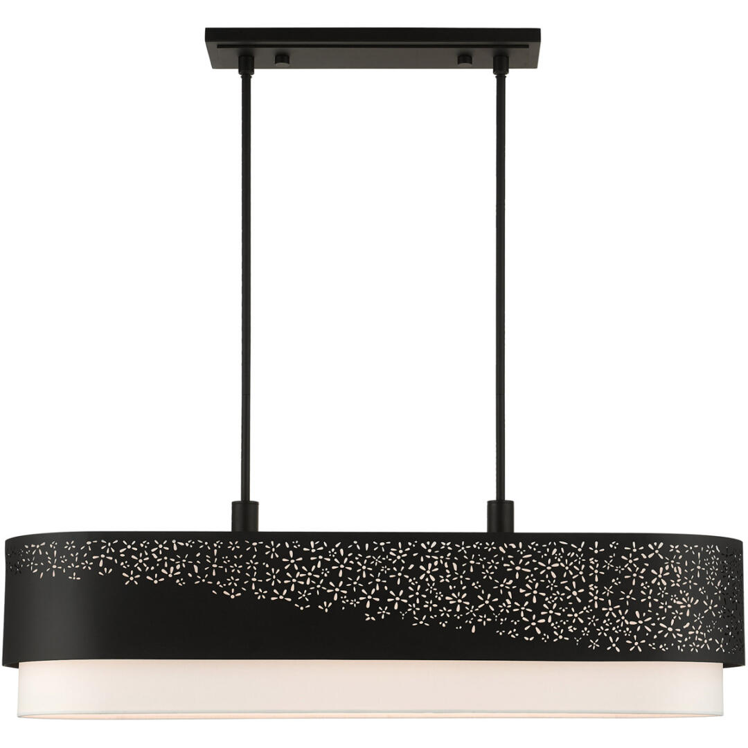 The Noria collection combines an intricate organic laser cut black finish steel frame surrounds an off-white fabric shade creating a casual warm light with a touch of nature vibe. This six-light linear chandelier will have a commanding presence in your home. Suspend it over a dining table, kitchen island or bar counter.
