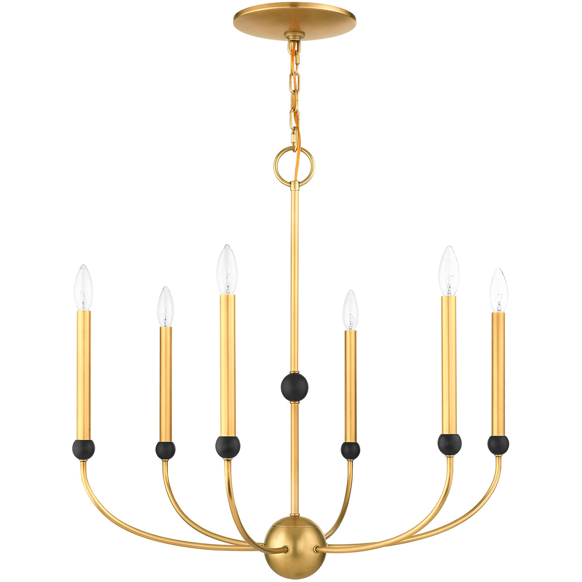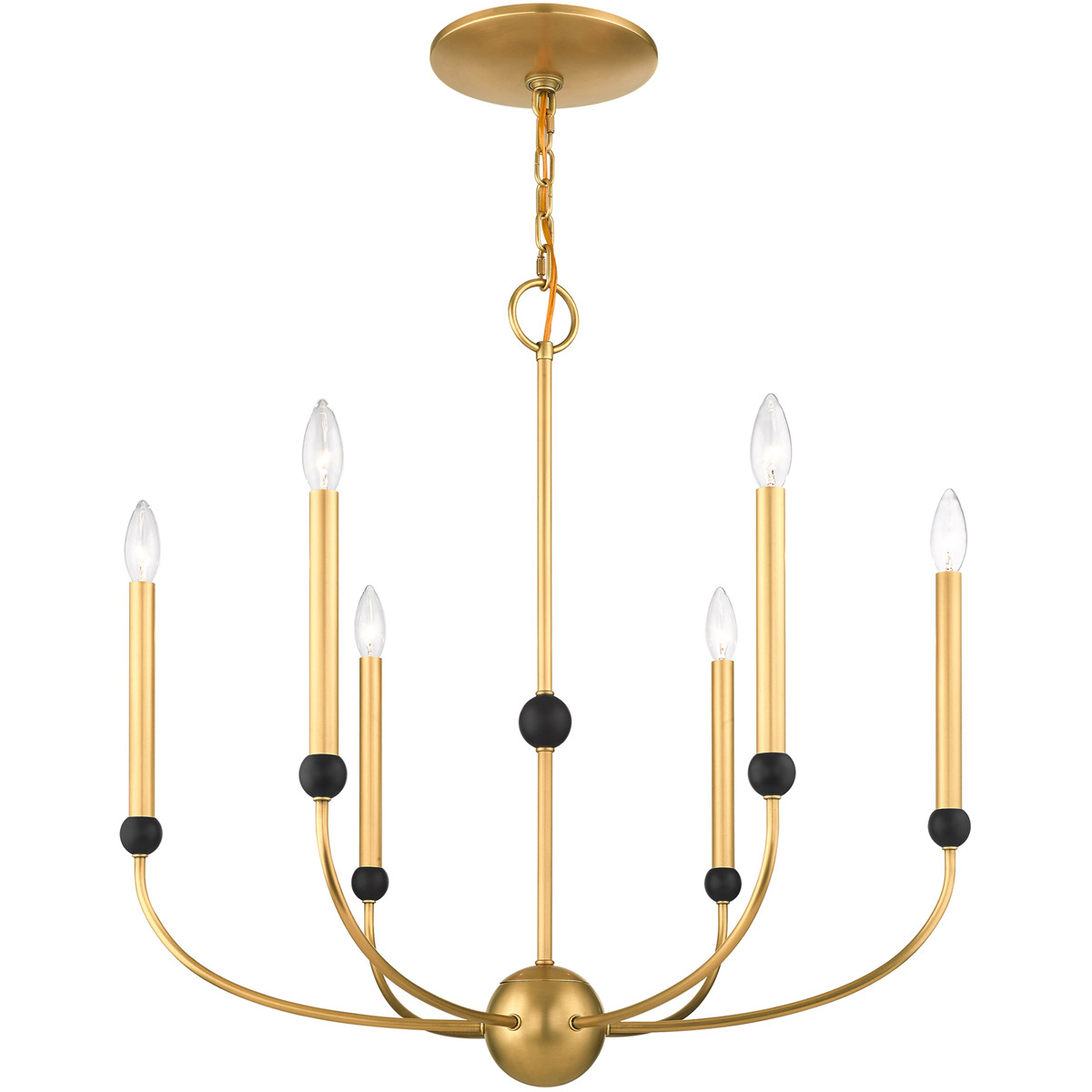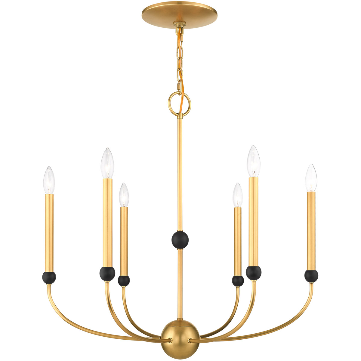 Illuminate your home with bright designs inspired by the atomic age. The six light chandelier emulates a mid-century modern style made popular in the 50s and 60s. The natural brass frame is accented with bronze spherical accents.