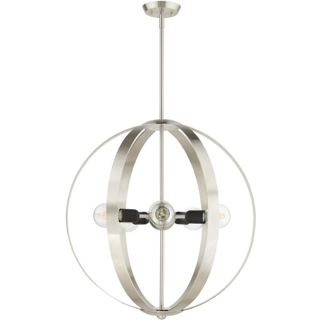 The Modesto collection hints at a casual mid-century modern vibe. It features steel straps that form beautiful circular shapes. The exposed bulbs and two-toned combination of finishes create a fashionable statement for today’s interiors. This five-light globe pendant chandelier is shown in a brushed nickel finish with black accents. It will look fantastic in your mid-century modern loft living room, dining room, kitchen or any contemporary style interior.