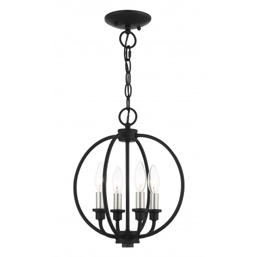 Add fresh style to an entryway, dining room and more. Clean, elegant curves define this handsome Milania pendant design. Inspired by classic cottage and continental style lighting, it comes in a black finish on the orb shaped frame and canopy with brushed nickel finish candles.