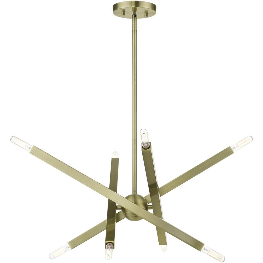 The Monaco collection inherits the multidirectional lines inspired by the Sputnik. The exposed bulbs glimmer at the end of each rectangular arm to create a touch of understated glamour for today’s modern spaces. The timeless design will add a sense of airiness and motion to any room. This eight-light chandelier would look great suspended in a living room, a modern dining room, a kitchen or a bedroom. It is presented in an antique brass finish.