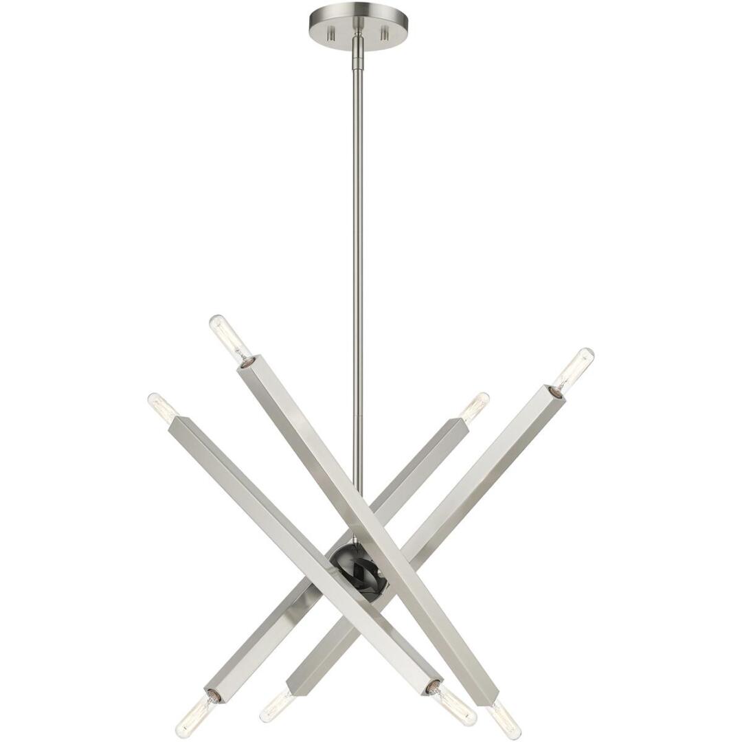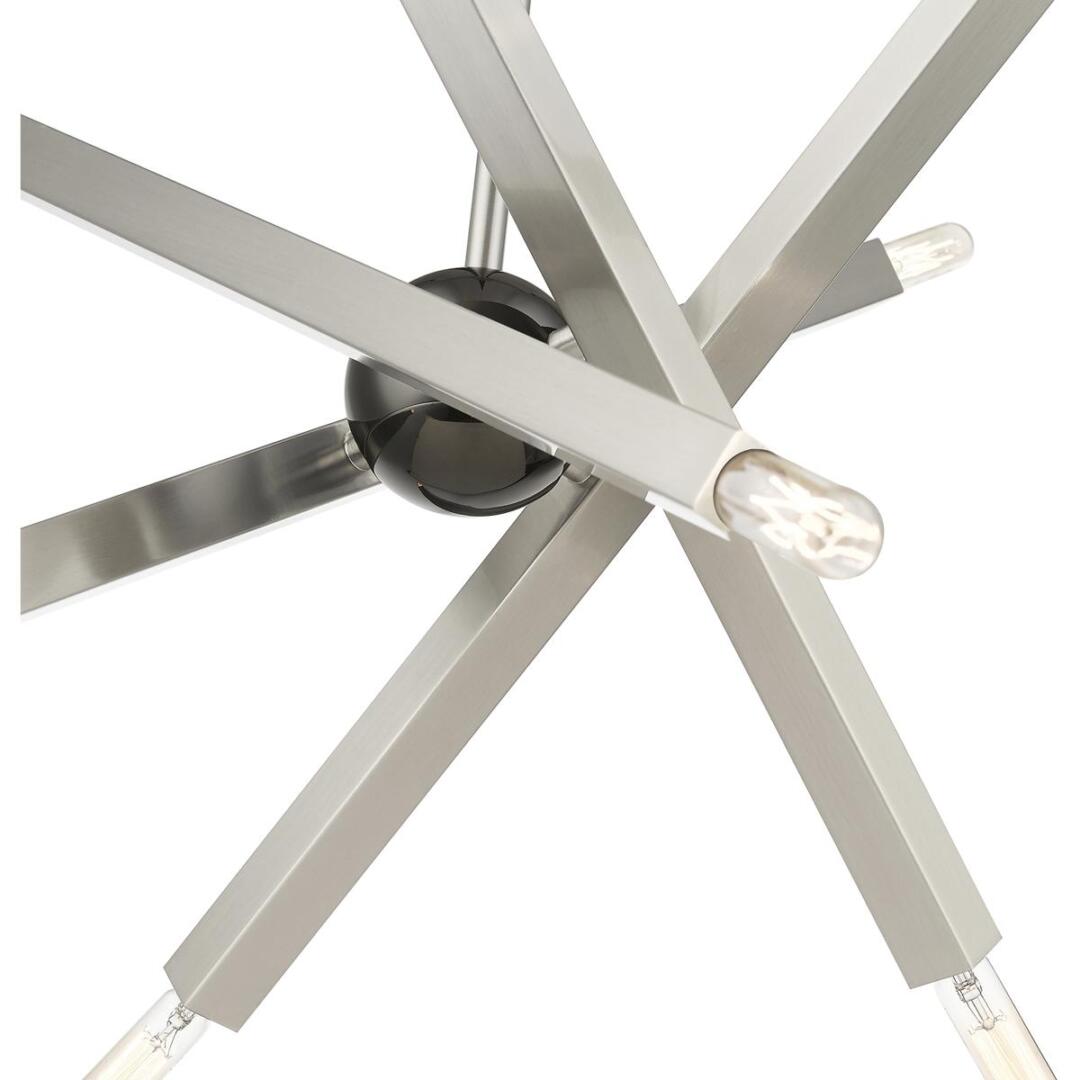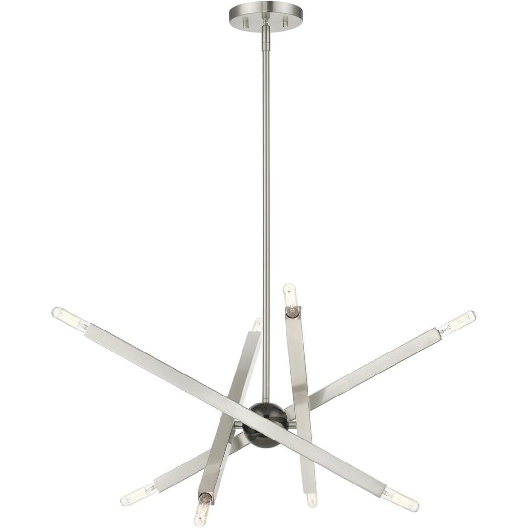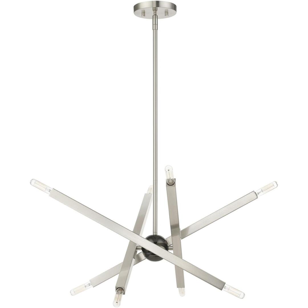 The Monaco collection inherits the multidirectional lines inspired by the Sputnik. The exposed bulbs glimmer at the end of each rectangular arm to create a touch of understated glamour for today’s modern spaces. The timeless design will add a sense of airiness and motion to any room. This eight-light chandelier would look great suspended in a living room, a modern dining room, a kitchen or a bedroom. It is presented in a brushed nickel finish with a black chrome finish accent.