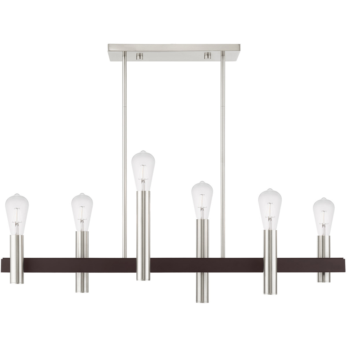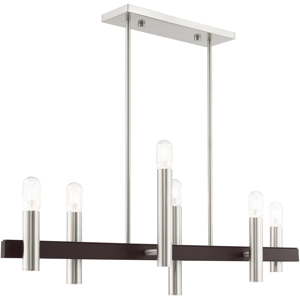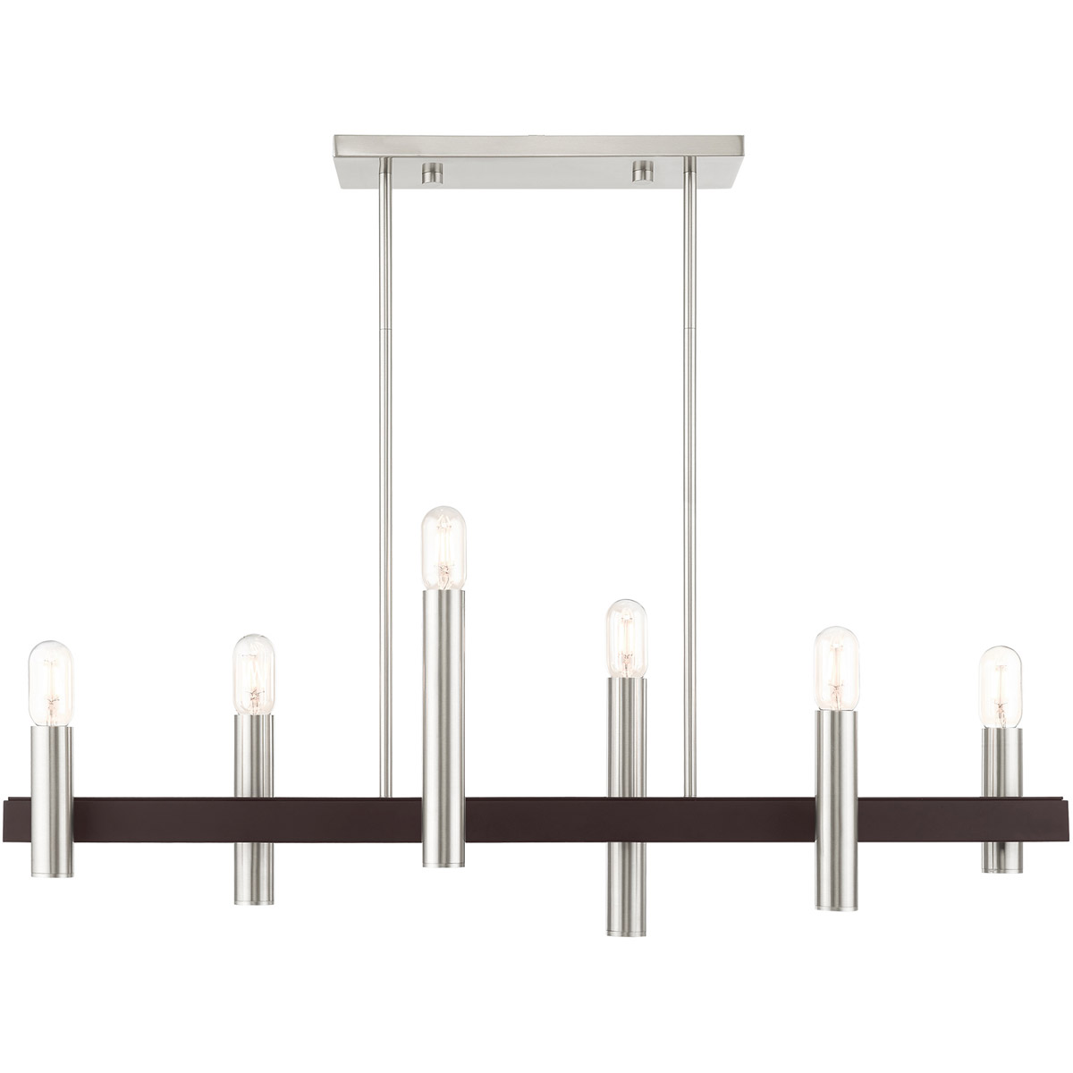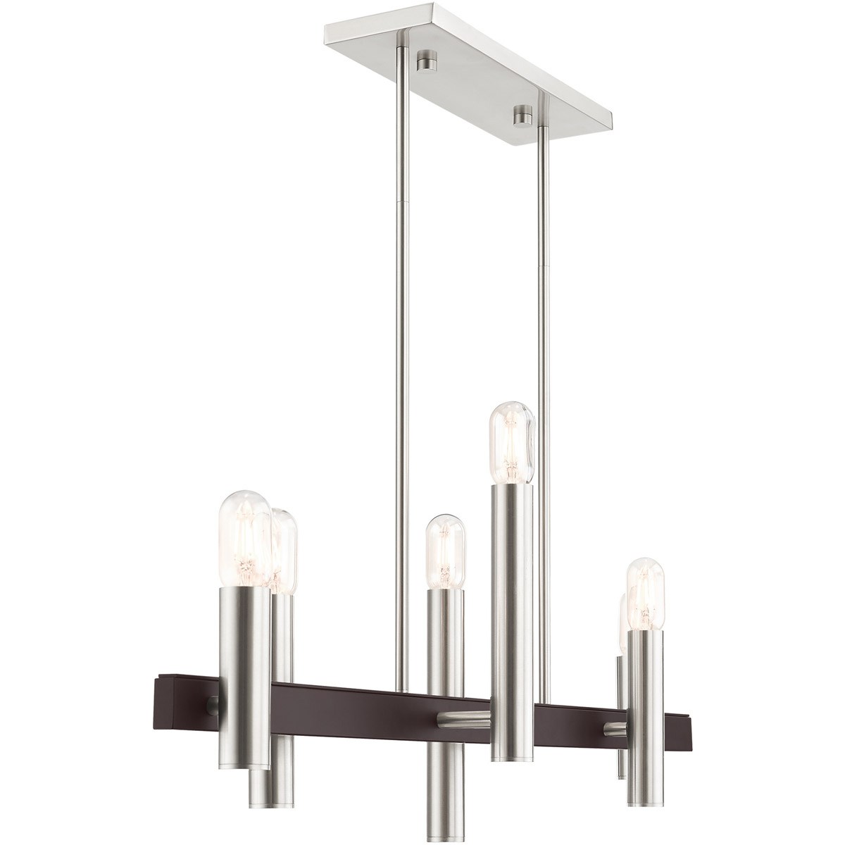 Adding to the eclectic and nostalgic feel, this funky linear chandelier is a traditional complement to many styles. An open linear form celebrates geometric interplay with clean, straight lines. Finished in brushed nickel with bronze accents, the Helsinki collection is ideal for modern or traditional homes.