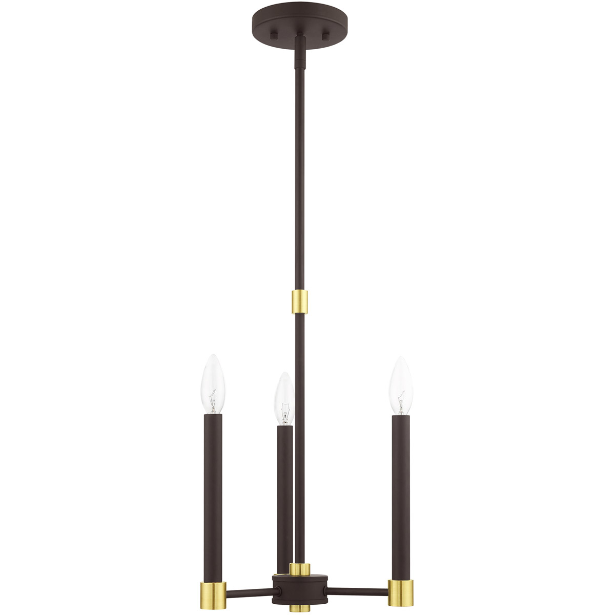 Simplicity and attention to detail are the key elements of the Karlstad collection. The dimensional form, exposed bulbs and two-tone finishes add a playful mood to a contemporary or urban interior. This three-light petite chandelier design gives a new face to a kitchen, bedroom or a bathroom vanity. It is shown in a bronze finish with satin brass finish accents.
