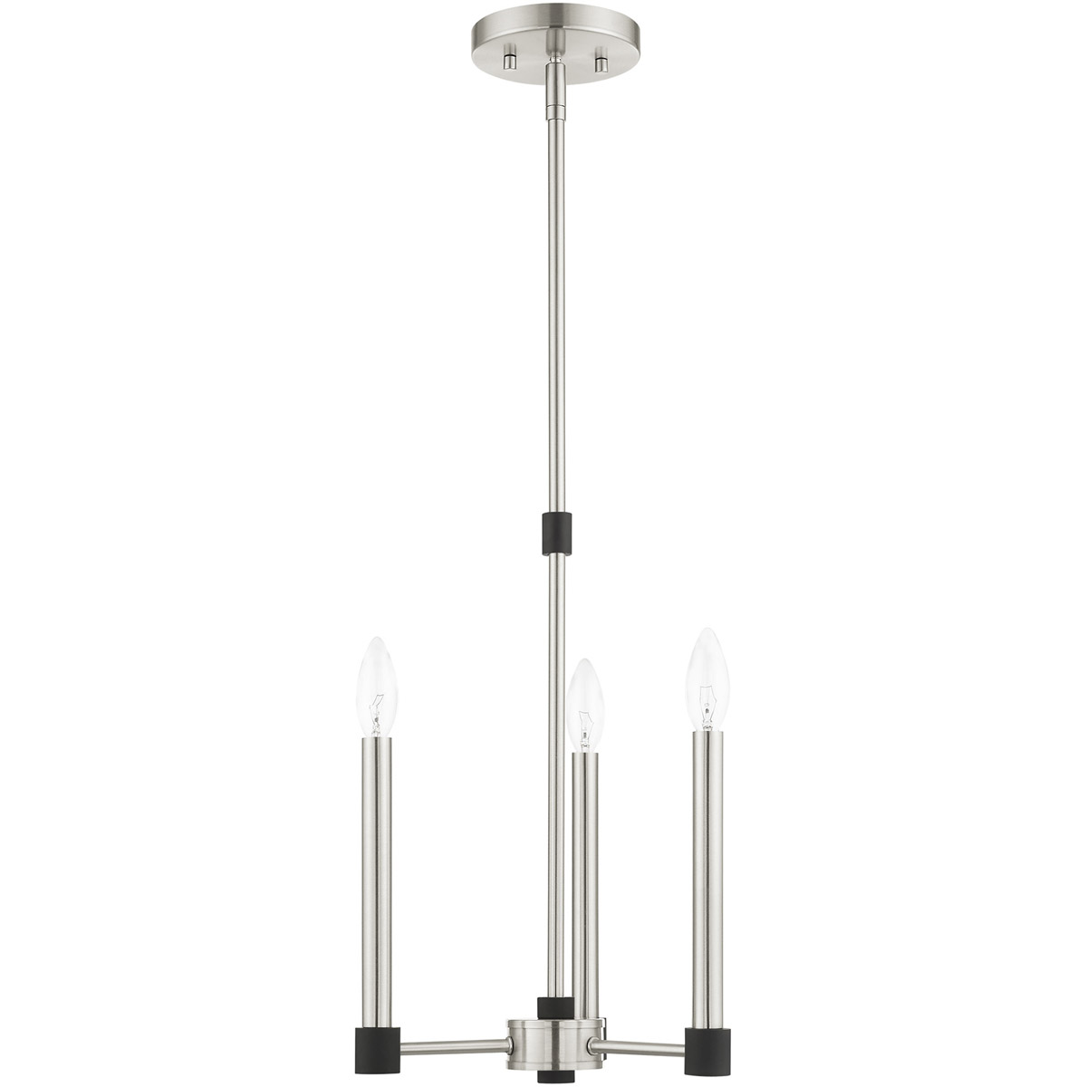 Simplicity and attention to detail are the key elements of the Karlstad collection. The dimensional form, exposed bulbs and two-tone finishes add a playful mood to a contemporary or urban interior. This three-light petite chandelier design gives a new face to a kitchen, bedroom or a bathroom vanity. It is shown in a brushed nickel finish with black finish accents.