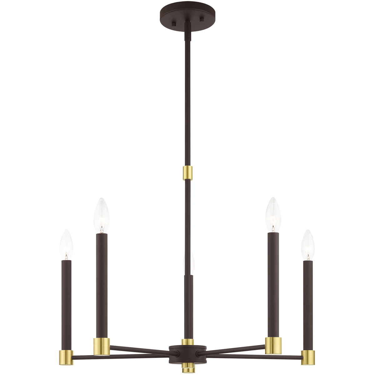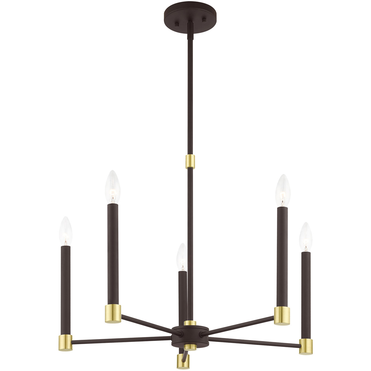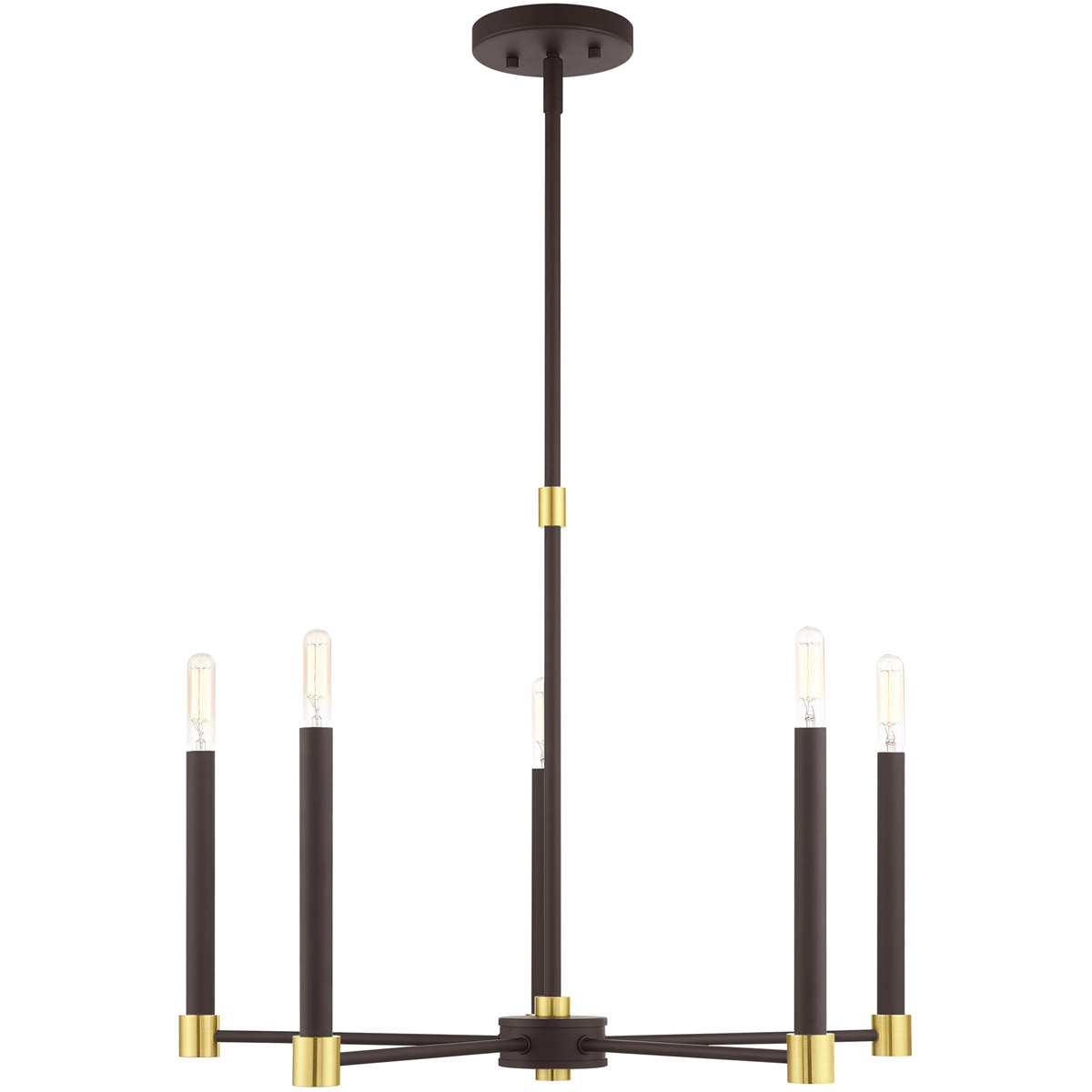 Simplicity and attention to detail are the key elements of the Karlstad collection. The dimensional form, exposed bulbs and two-tone finishes add a playful mood to a contemporary or urban interior. This five-light chandelier design gives a new face to a kitchen, bedroom or a bathroom vanity. It is shown in a bronze finish with satin brass finish accents.