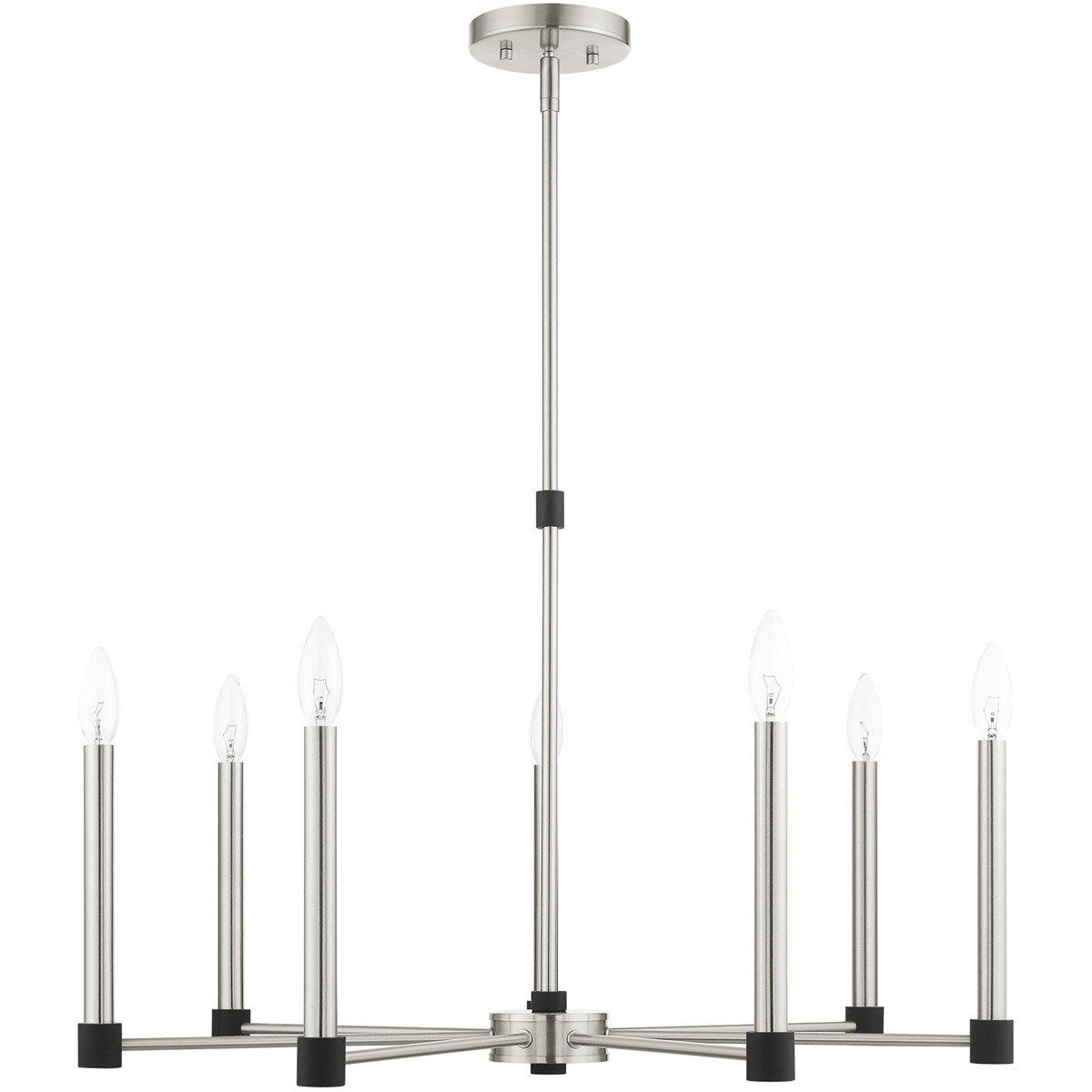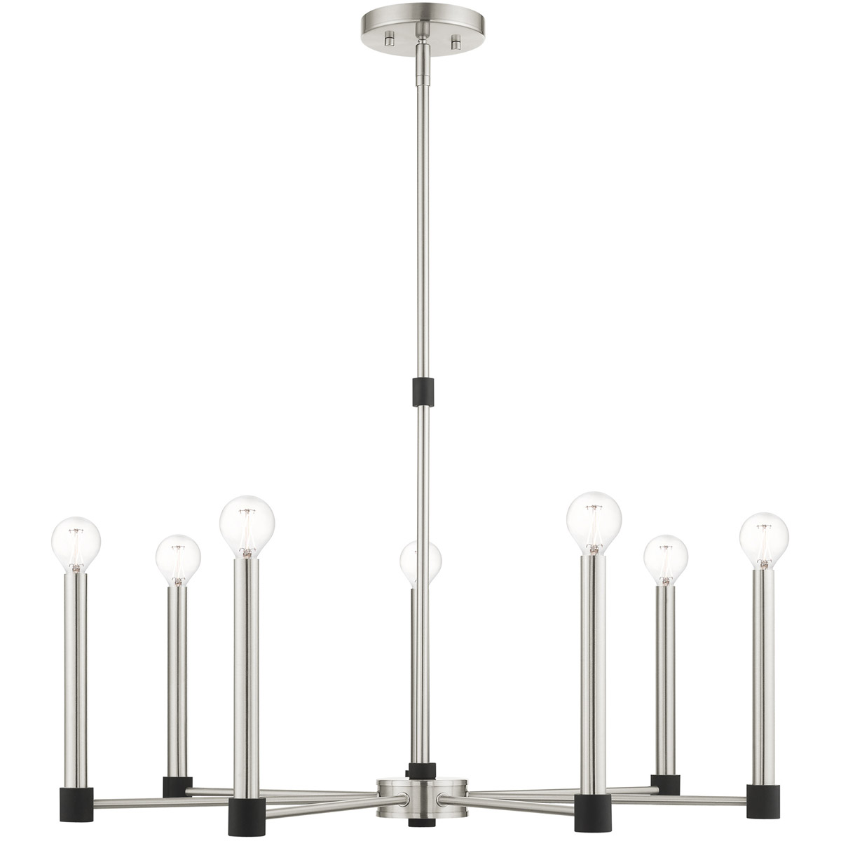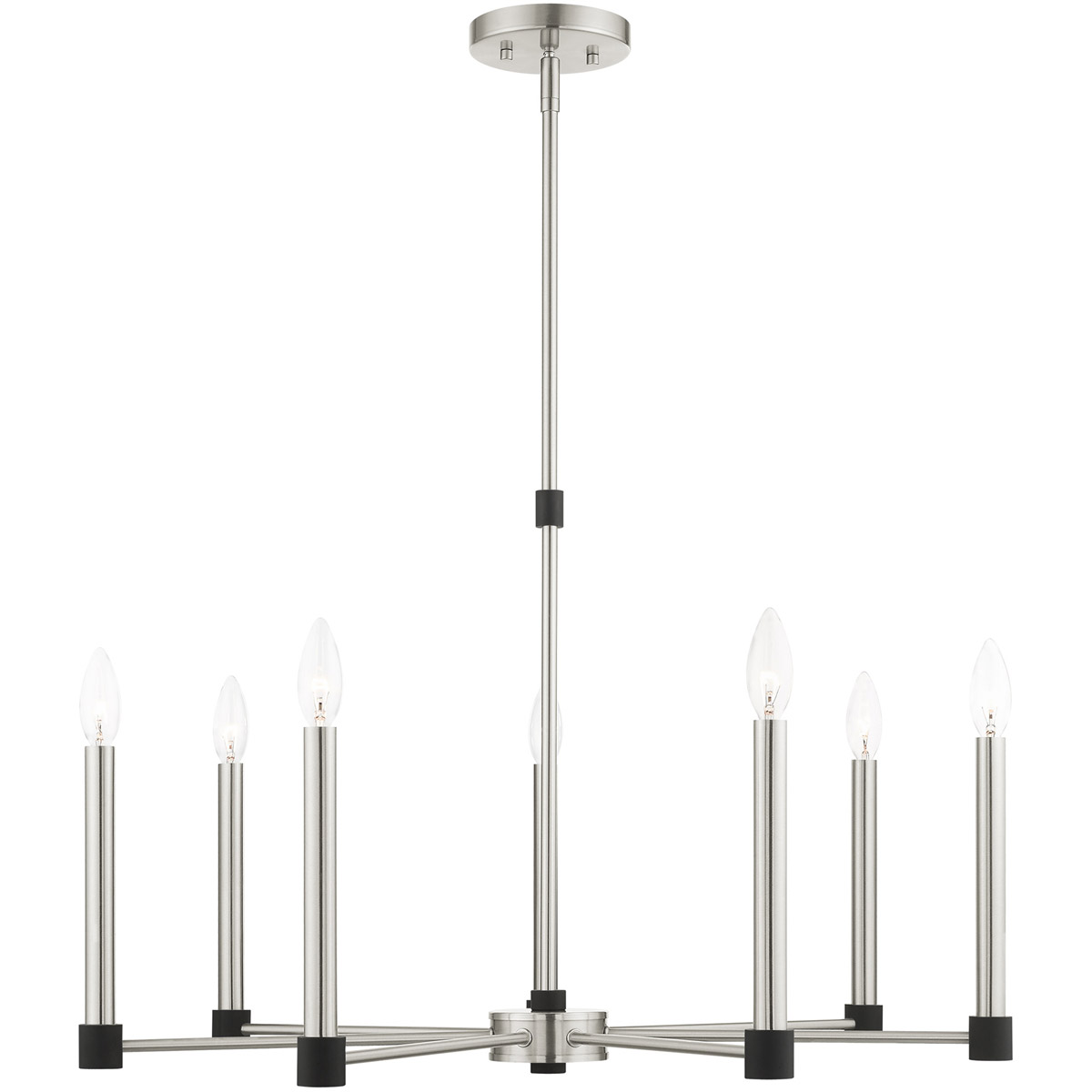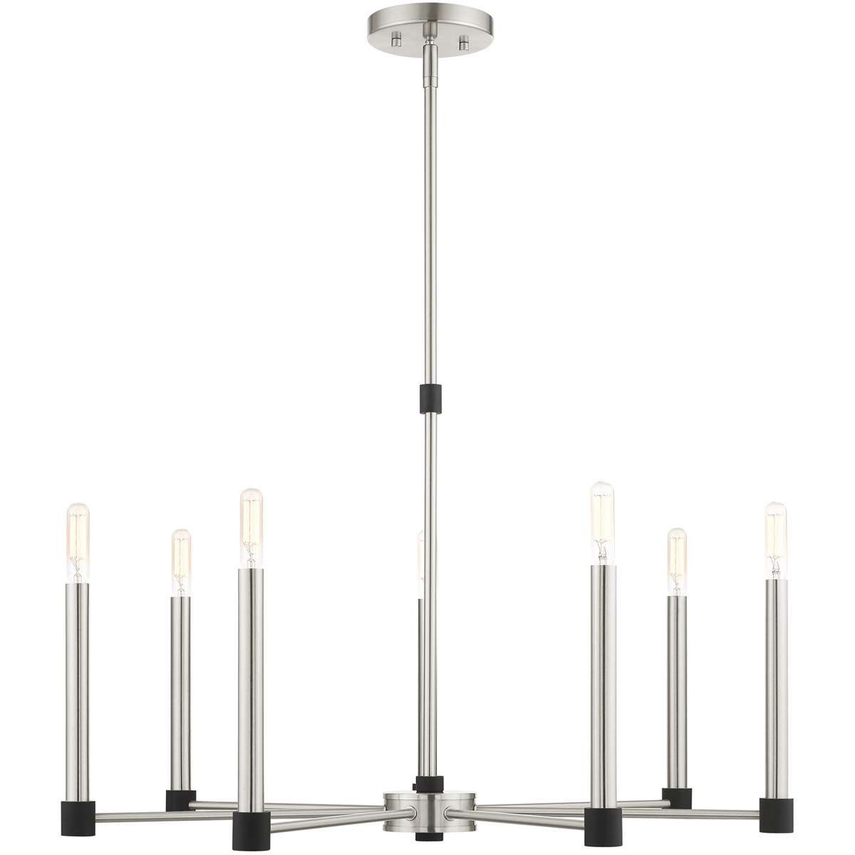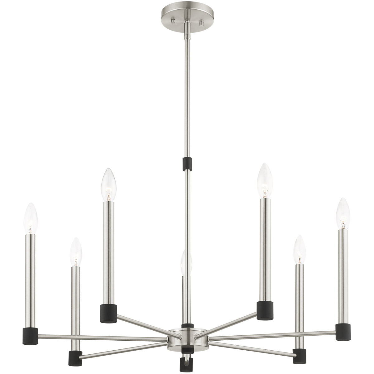 Simplicity and attention to detail are the key elements of the Karlstad collection. The dimensional form, exposed bulbs and two-tone finishes add a playful mood to a contemporary or urban interior. This seven-light chandelier design gives a new face to a kitchen, bedroom or a bathroom vanity. It is shown in a brushed nickel finish with black finish accents.