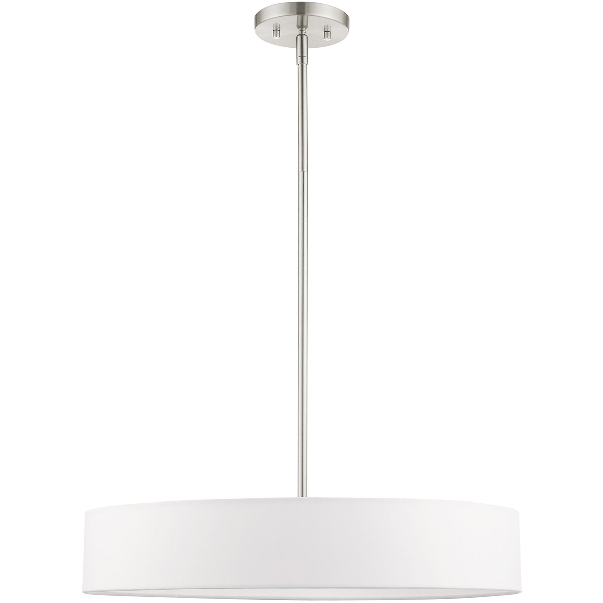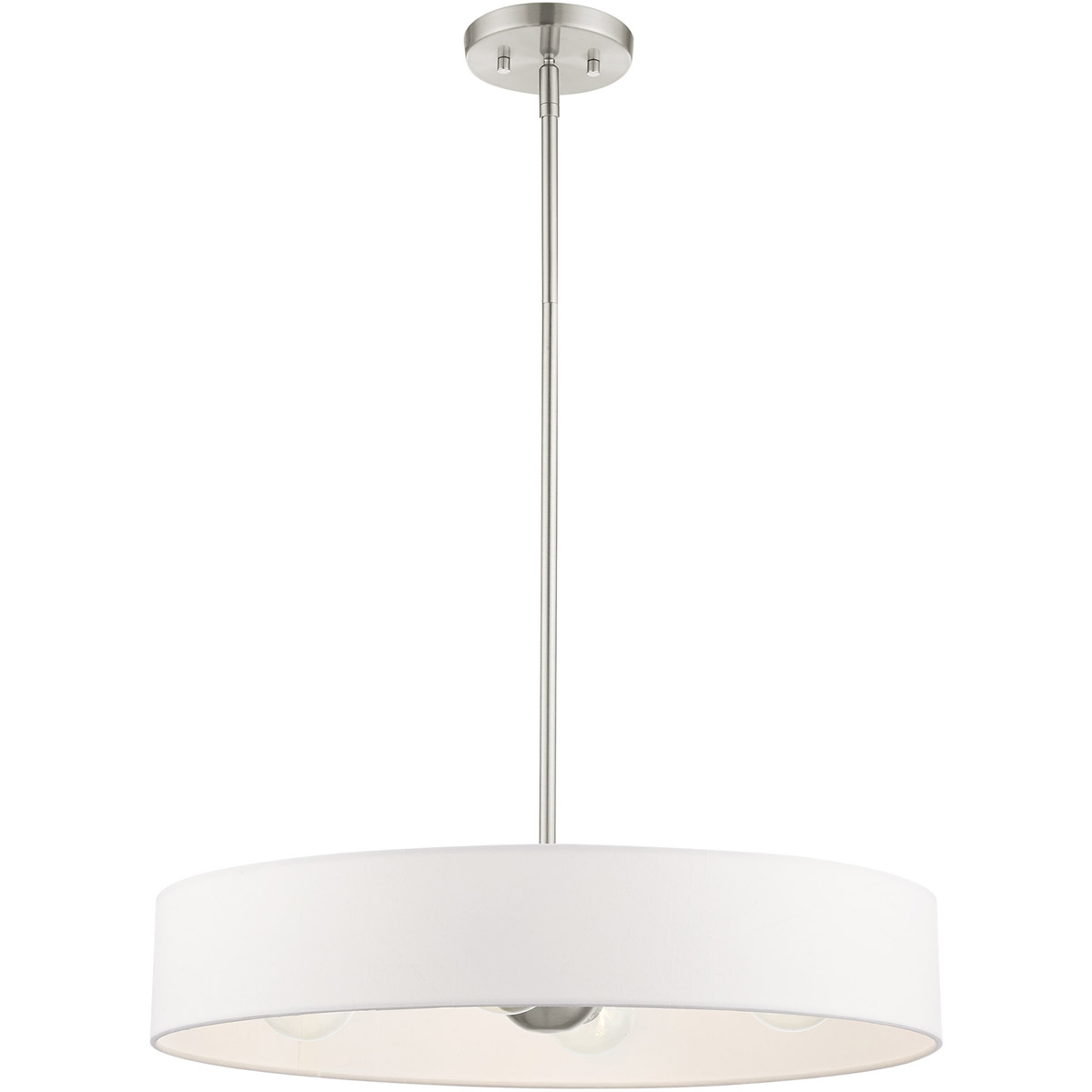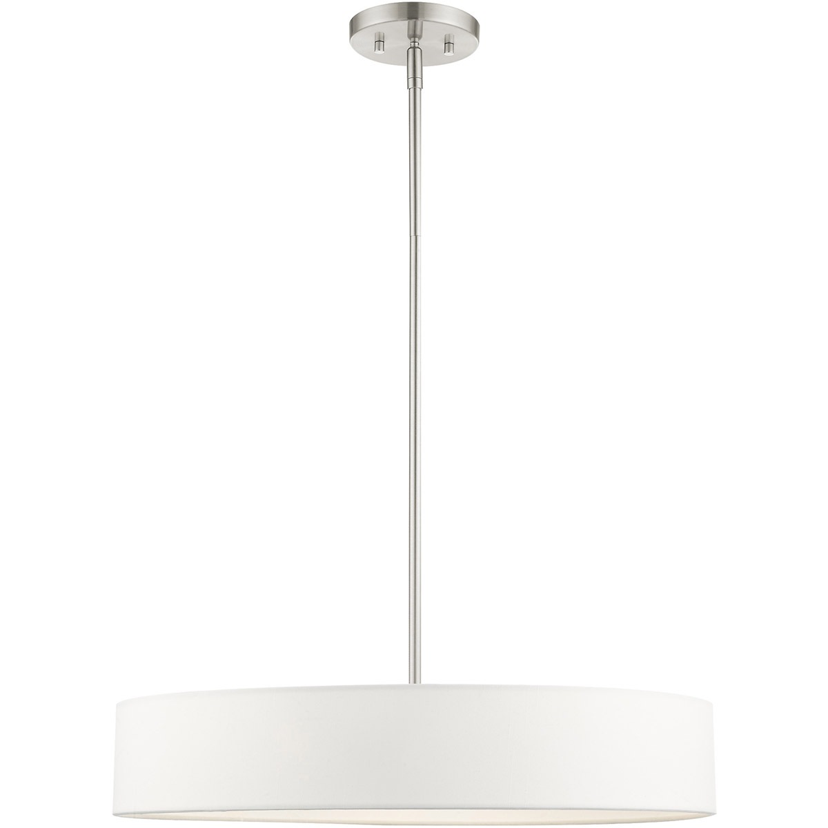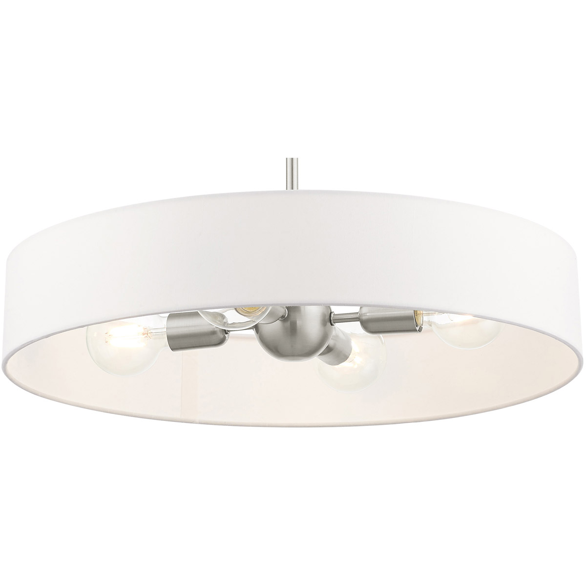 The Venlo collection is both modern and versatile. The brushed nickel finish and hand-crafted off-white colored fabric hardback shade sets a pleasant mood. This sleek medium four-light drum pendant is a perfect fit for the living room, dining room, kitchen and bedroom.