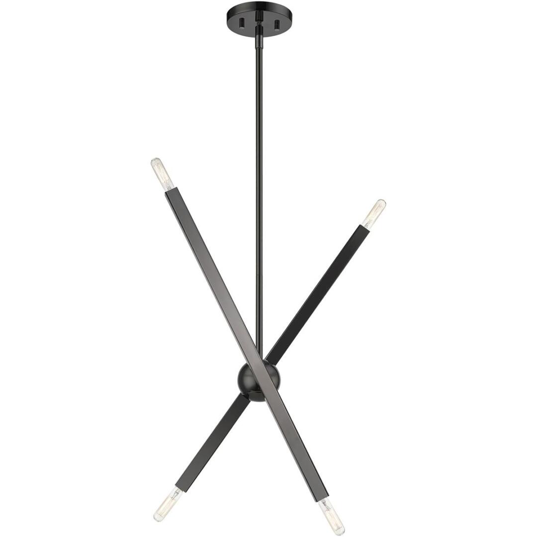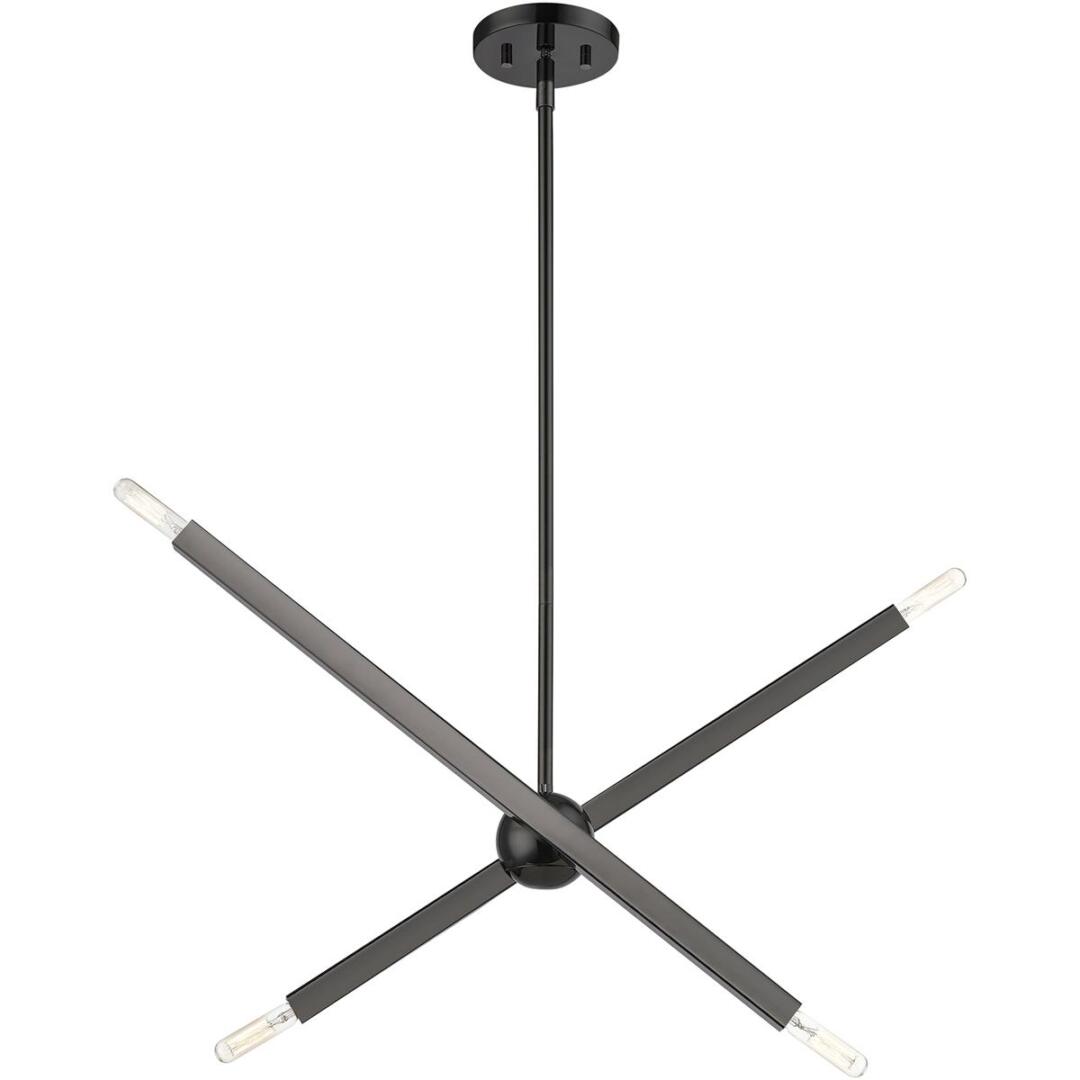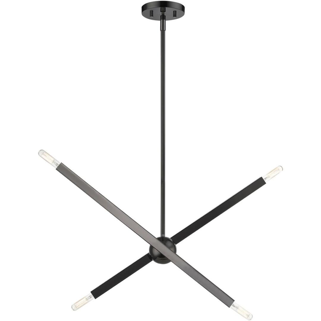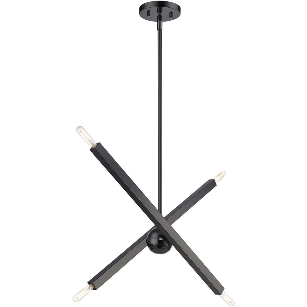 The Monaco collection inherits the multidirectional lines inspired by the Sputnik. The exposed bulbs glimmer at the end of each rectangular arm to create a touch of understated glamour for today’s modern spaces. The timeless design will add a sense of airiness and motion to any room. This four-light chandelier would look great suspended in a living room, a modern dining room, a kitchen or a bedroom. It is presented in a black chrome finish.