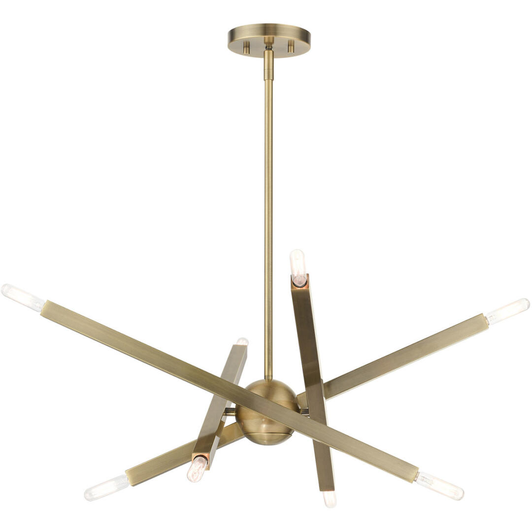 The Monaco collection inherits the multidirectional lines inspired by the Sputnik. The exposed bulbs glimmer at the end of each rectangular arm to create a touch of understated glamour for today’s modern spaces. The timeless design of will add a sense of airiness and motion to any room. This eight-light chandelier would look great suspended in a living room, a modern dining room, a kitchen or a bedroom. It is presented in an antique brass finish.