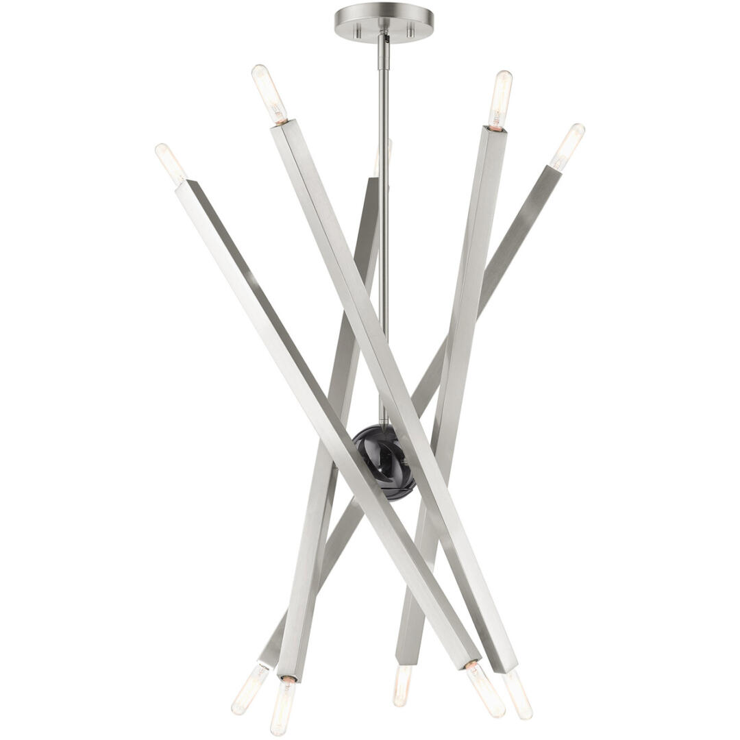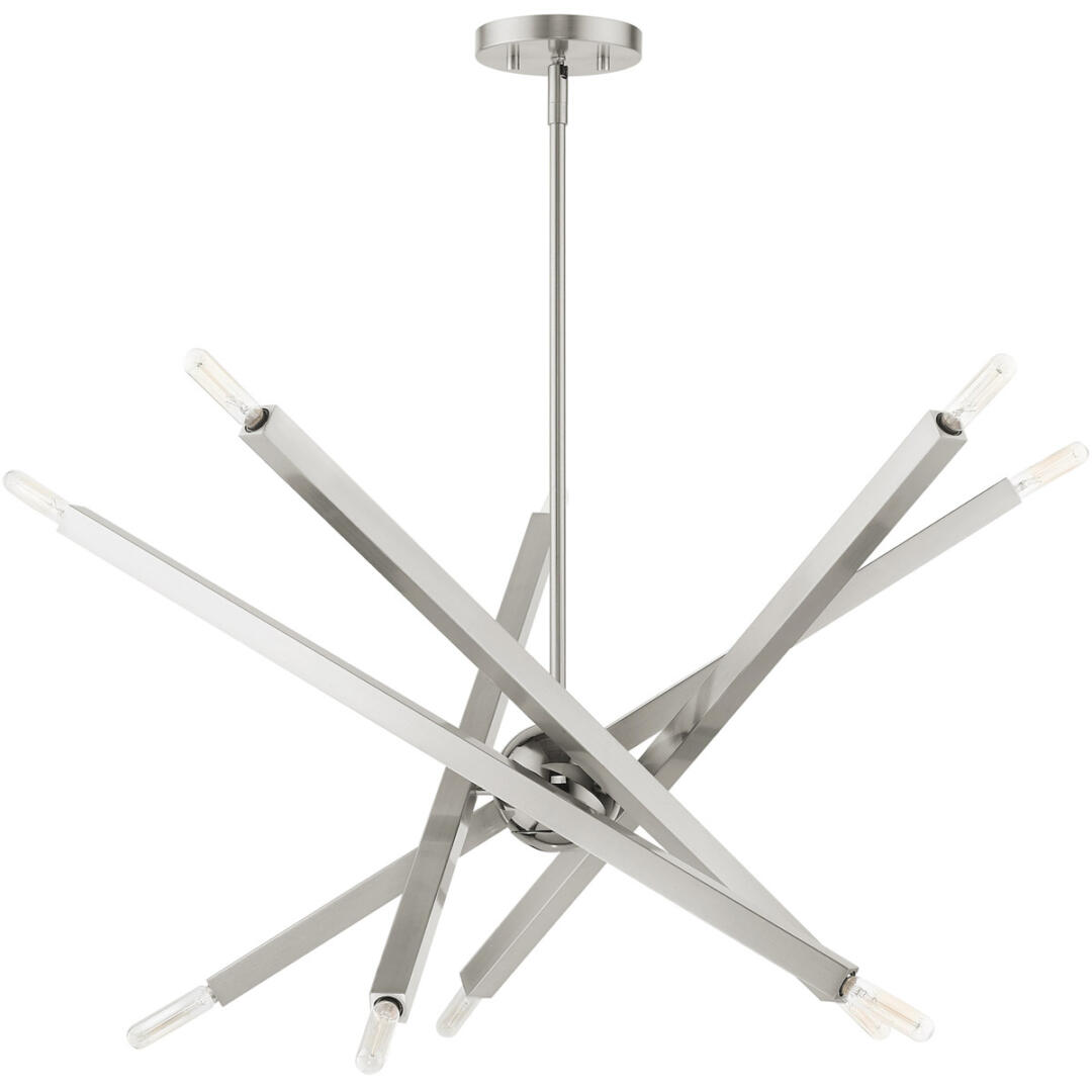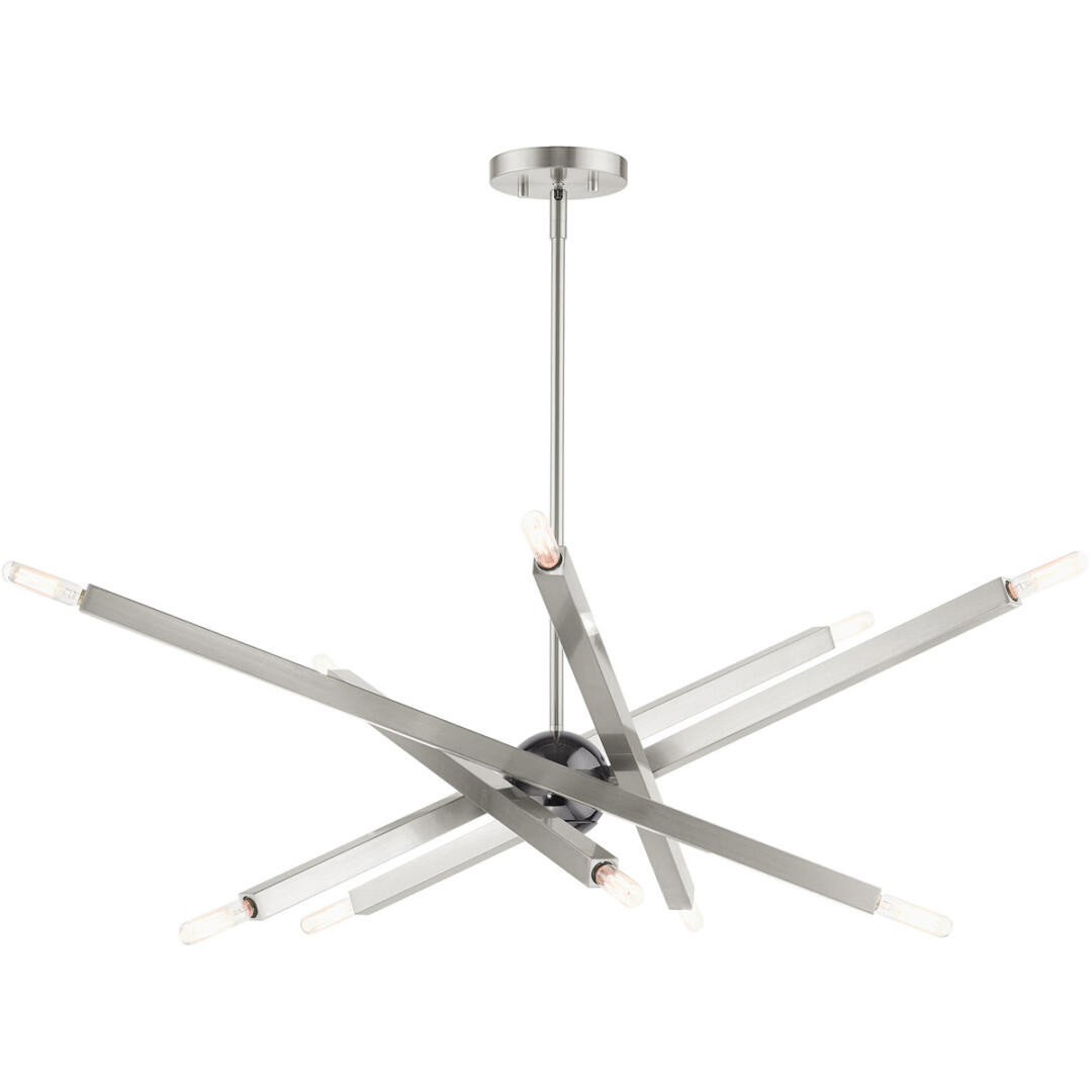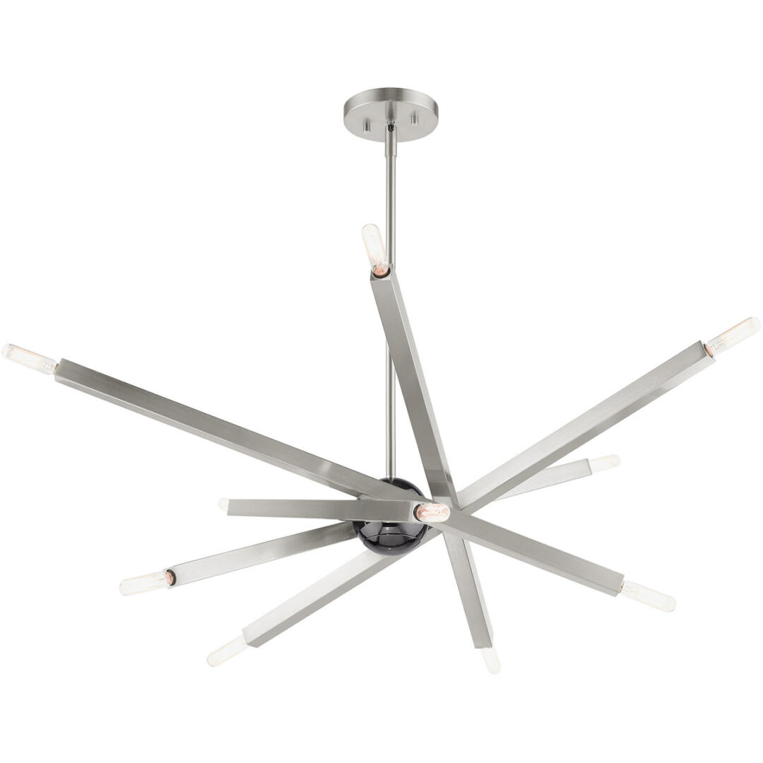The Monaco collection inherits the multidirectional lines inspired by the Sputnik. The exposed bulbs glimmer at the end of each rectangular arm to create a touch of understated glamour for today’s modern spaces. The timeless design will add a sense of airiness and motion to any room. This ten-light chandelier would look great suspended in a living room, a modern dining room, a kitchen or a bedroom. It is presented in a brushed nickel finish with a black chrome finish accent.