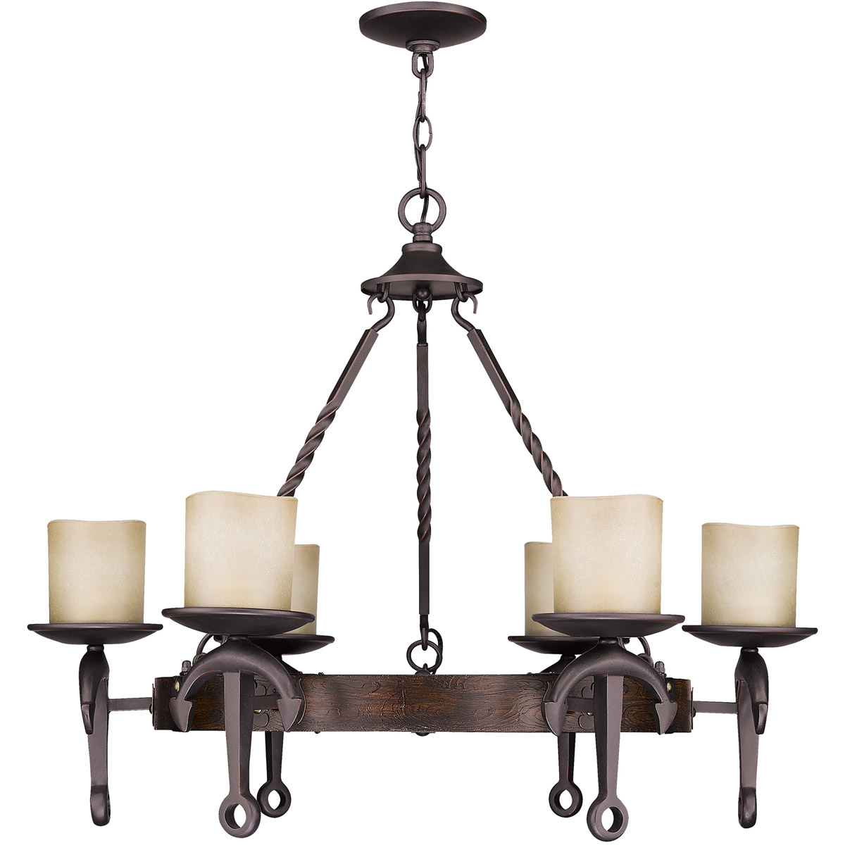 Inspired by the styling of a rustic seaside cottage, the traditional Cape May collection looks furthered by the olde bronze finish anchors and the twisted arms. With the walnut wood finish and calming vintage hand blown satin glass this chandelier should give your decor the perfect finishing touch for that old nautical inspired theme.