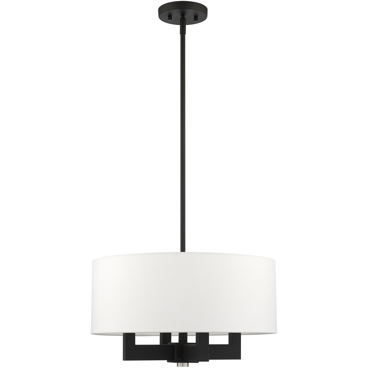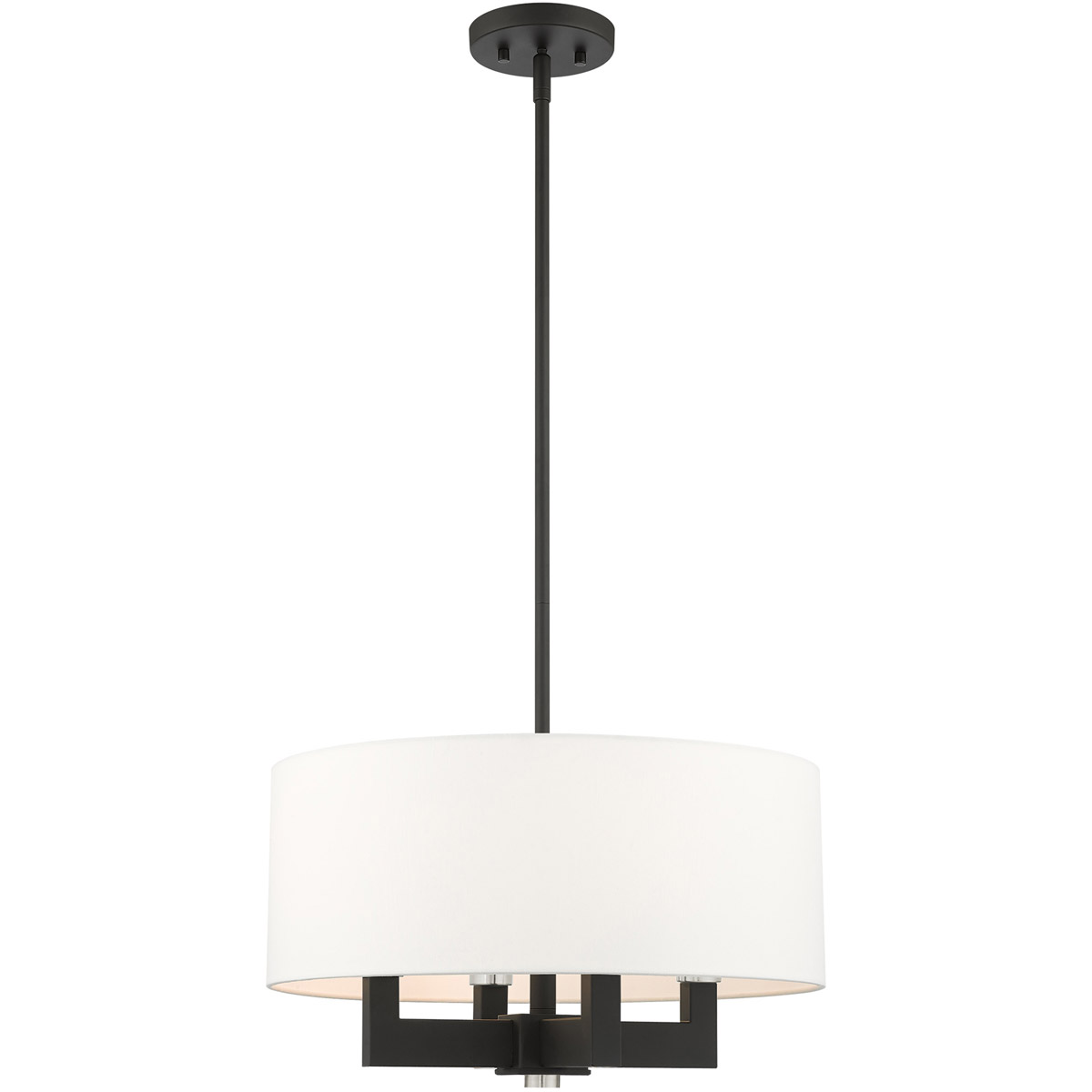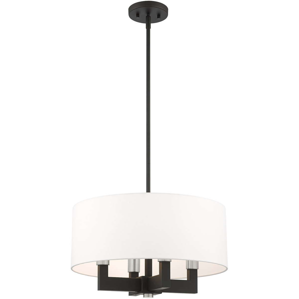The Cresthaven collection has a clean, crisp look and contemporary appeal. The hand-crafted off-white fabric hardback shade offers a diffused warm light. This black finish with brushed nickel finish accents four-light pendant chandelier has sleek exposed angular arms making it tasteful to elevate your style. Will adapt well in the living room, dining room and bedroom.