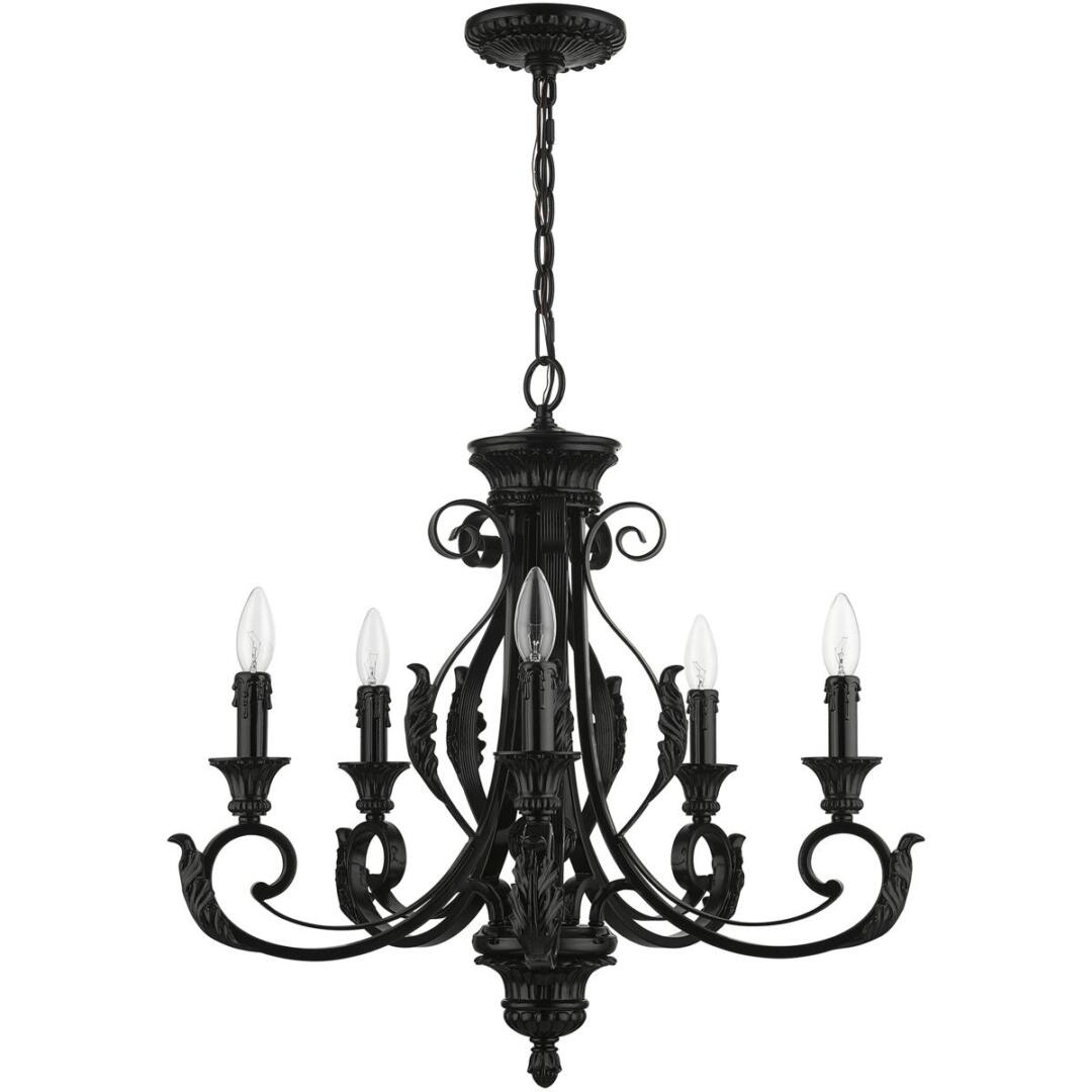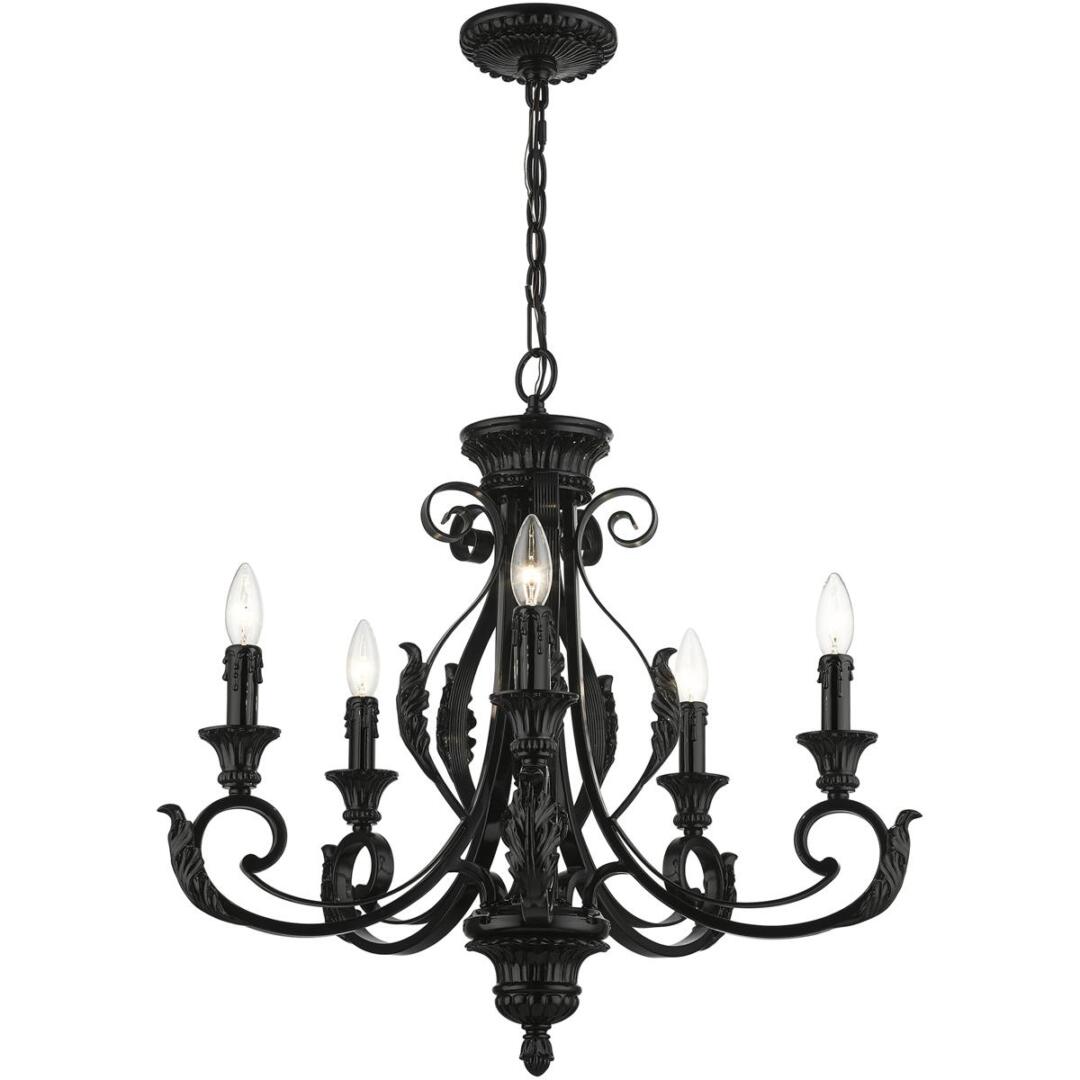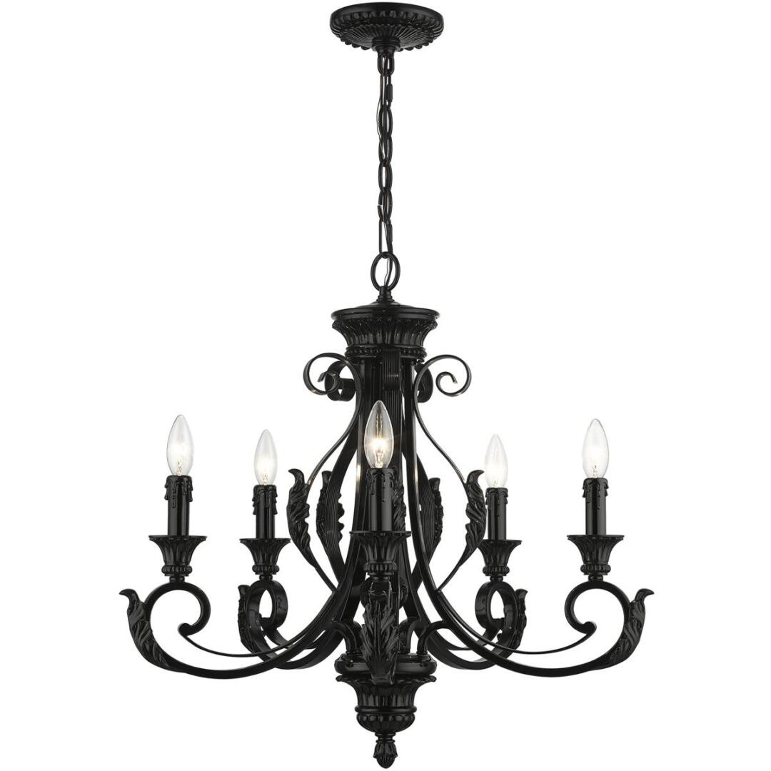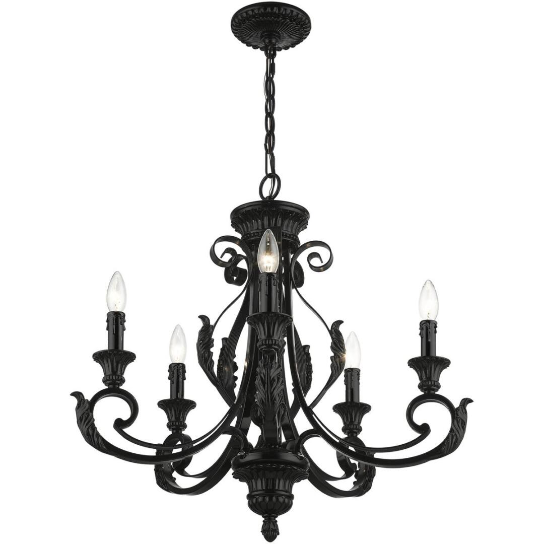 The Valencia is a classically inspired fixture with an overlapping leaf pattern and graceful curves. It is reminiscent of a European trestle though the elements of this piece are beautifully rendered in a shiny black finish, which creates a much more contemporary feeling. This five-light chandelier is perfect for any interior design style. Suspended in your living room, dining room or bedroom, this light will add glamour to your life.