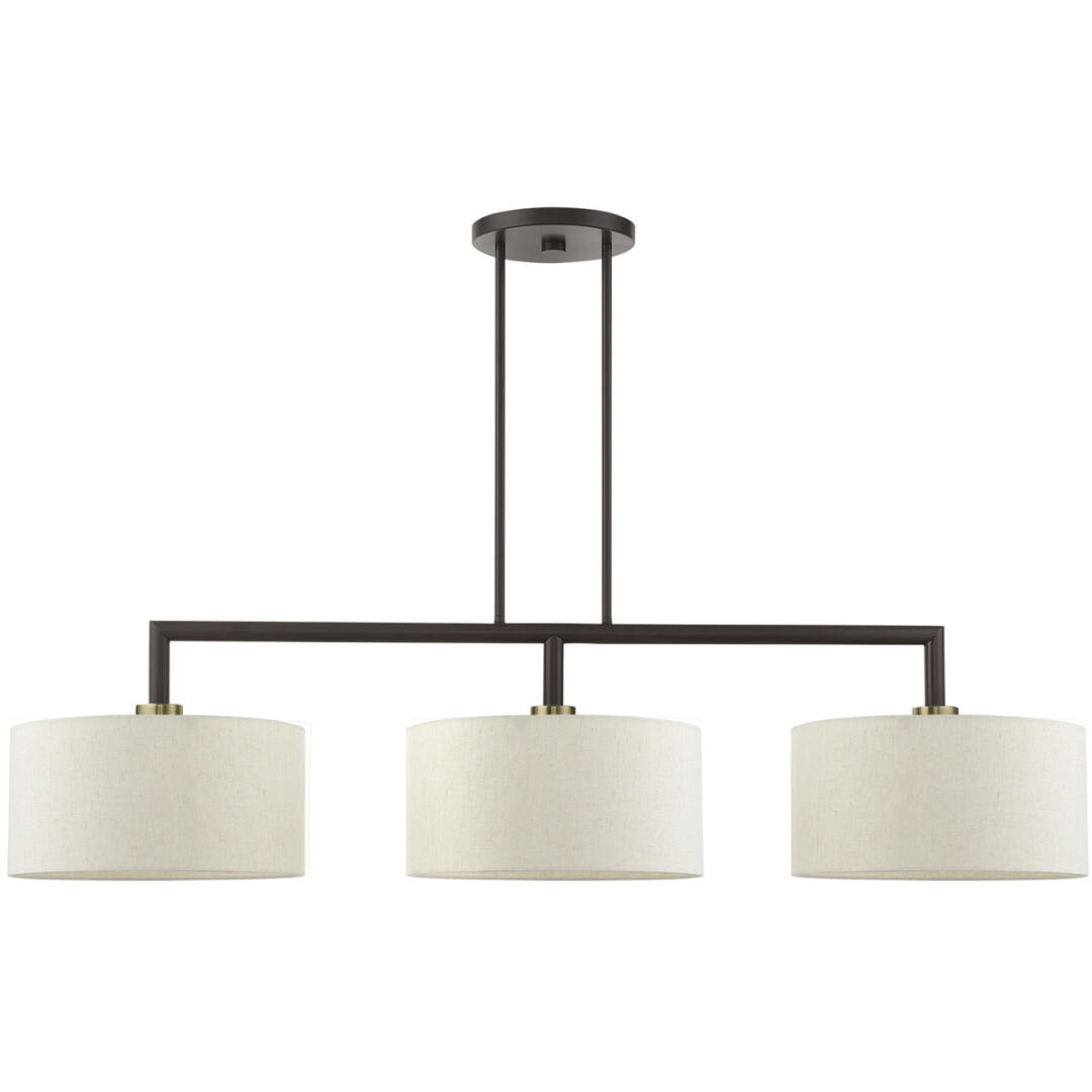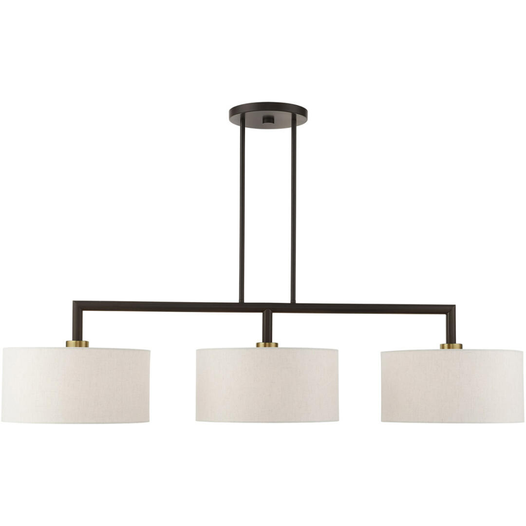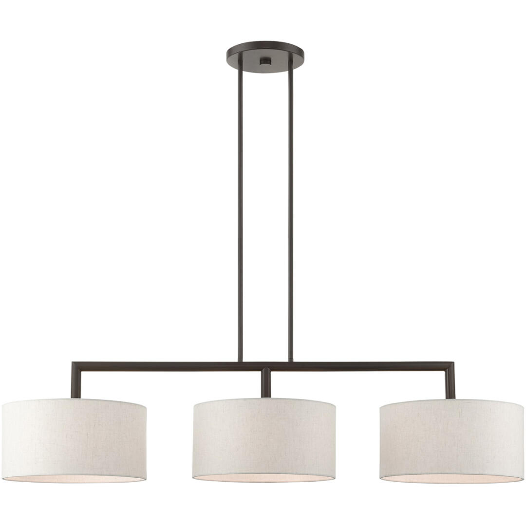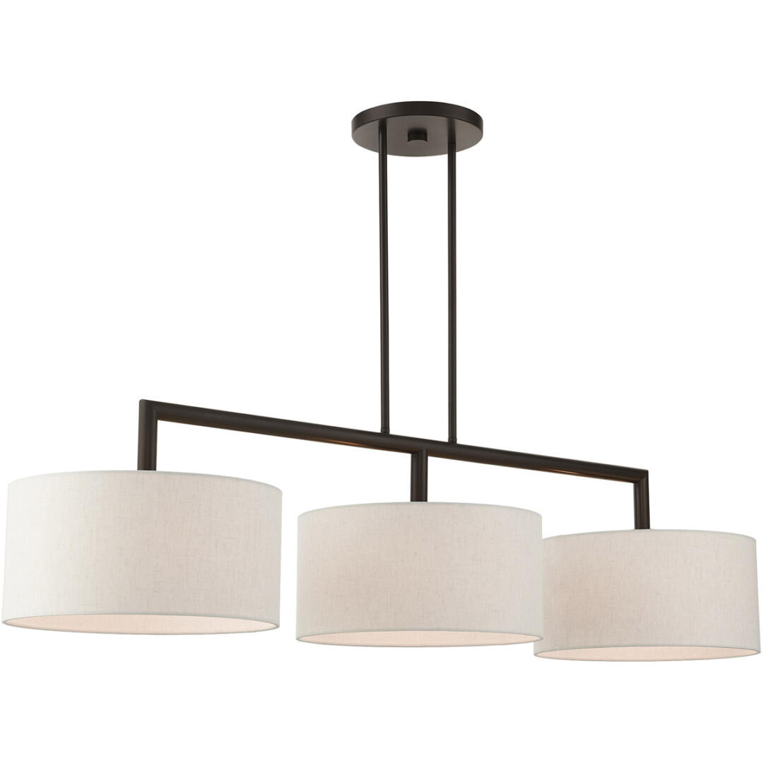 The Monroe collection has a clean, crisp look and contemporary appeal. The hand-crafted oatmeal colored fabric hardback shades offer a diffused warm light. This three-light linear chandelier has a sleek upper frame over the three shades. Will adapt well in the living room, dining room and over the kitchen island tastefully elevating your style. This sleek design is shown in an English bronze finish.