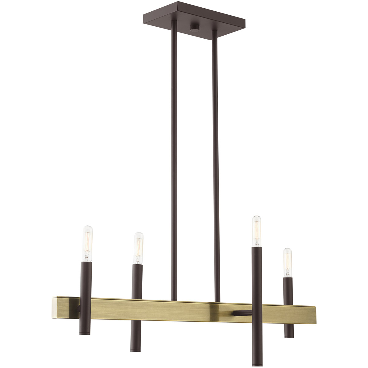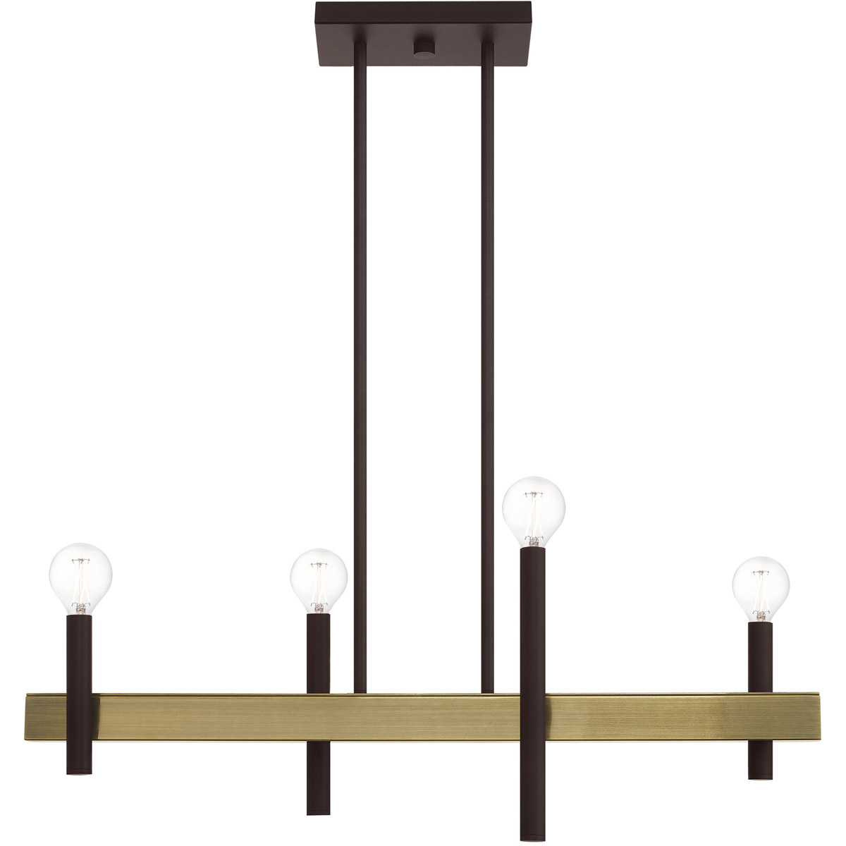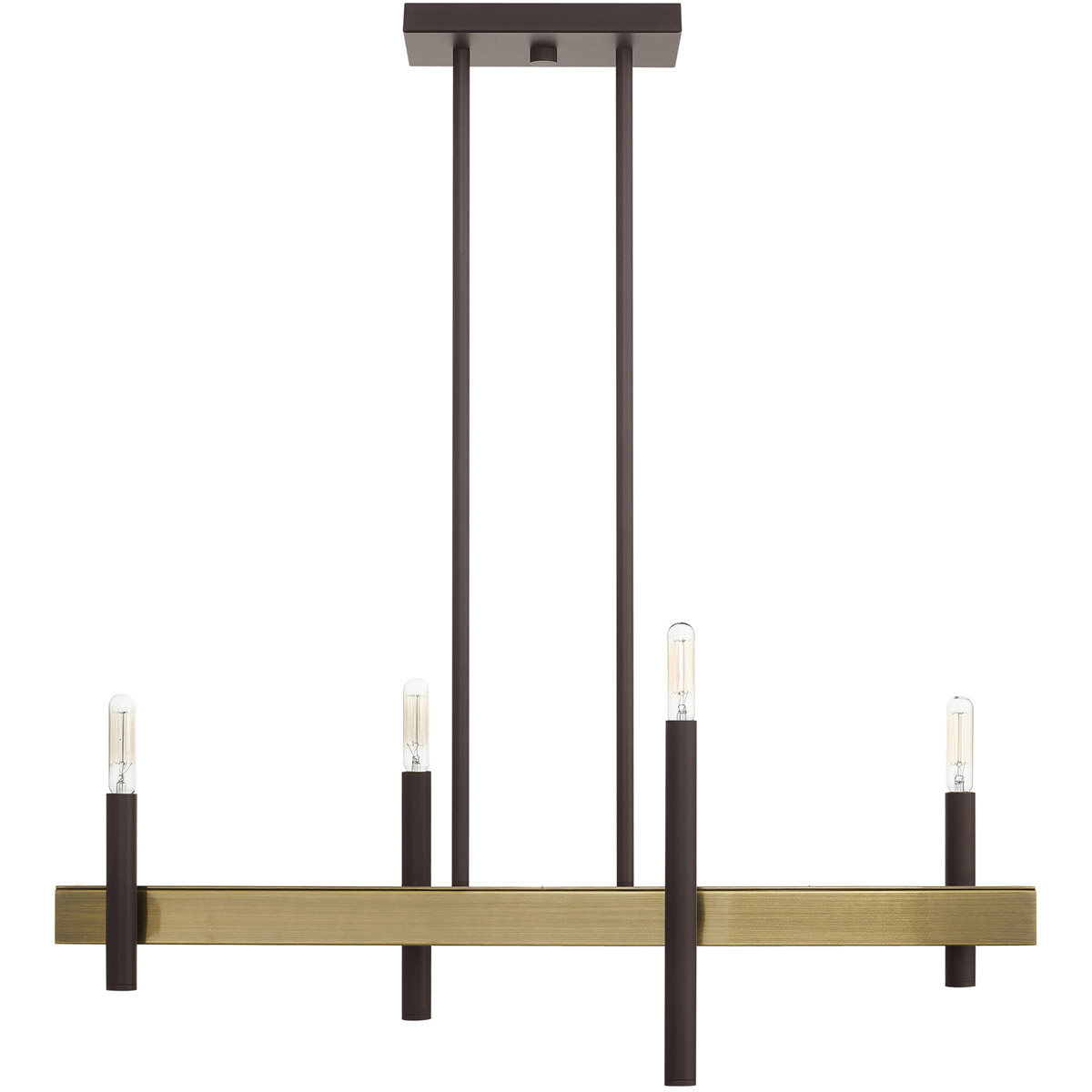 Clean lines and exposed bulb sockets make the Denmark collection perfect for your mid-mod or transitional decor. The eclectic look is perfect for spaces wanting an urban, minimalistic or industrial touch. With superb craftsmanship and affordable price, this bronze finish with antique brass finish accent four-light linear chandelier is sure to tastefully indulge your extravagant side.