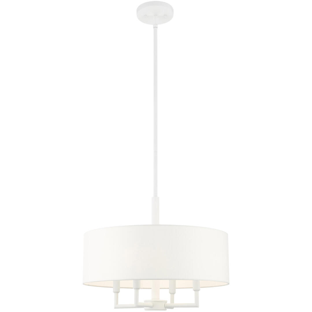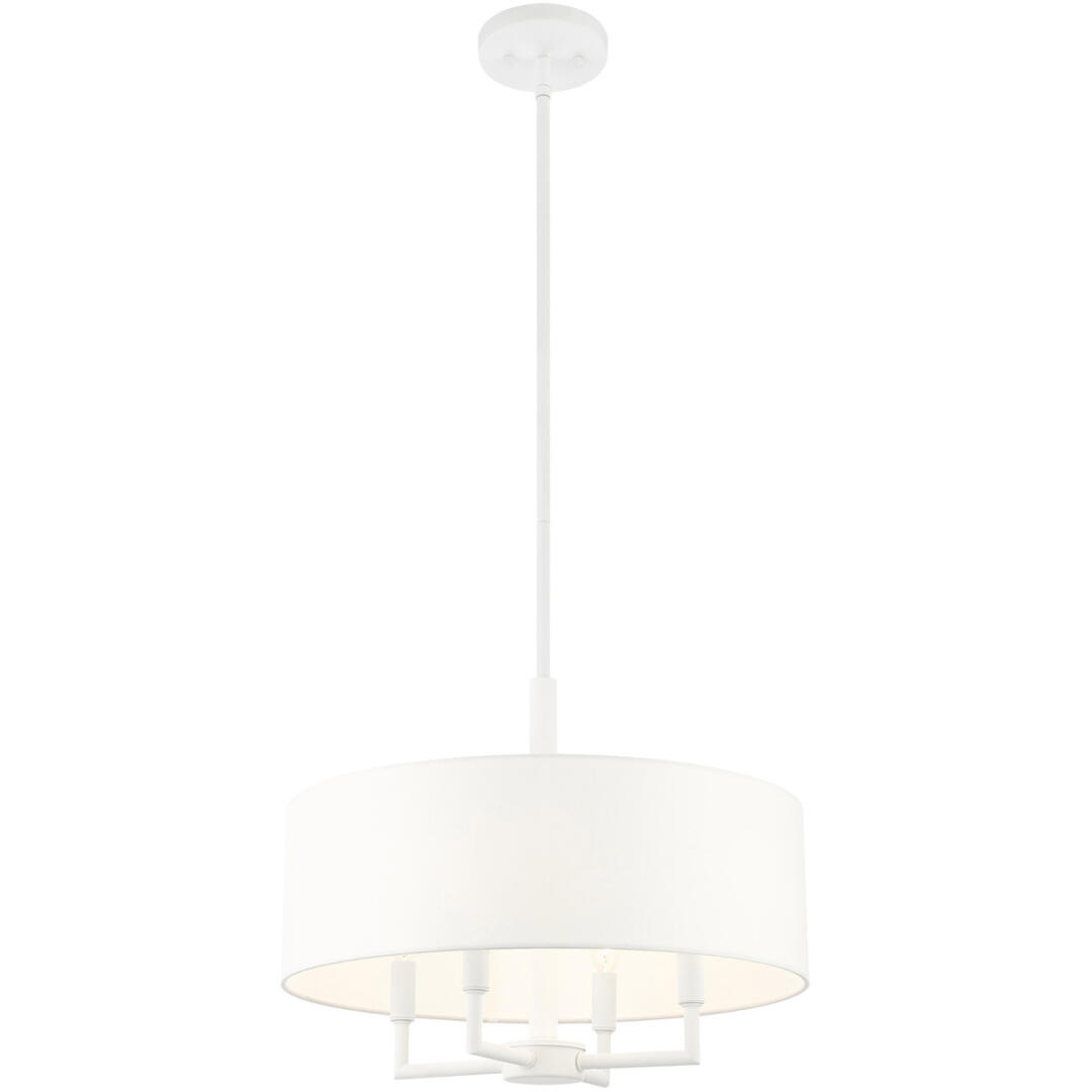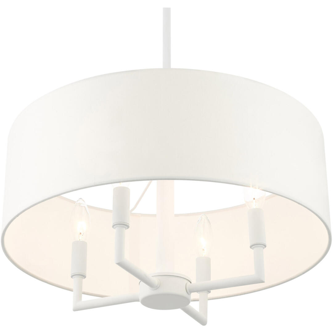 The Meridian collection has a clean, crisp look and contemporary appeal. The hand-crafted off-white fabric hardback shade offers a diffused warm light. This four-light pendant chandelier has sleek exposed angular arms making it tasteful to elevate your style. Will adapt well in the living room, dining room and bedroom. This sleek design is shown in a white finish.