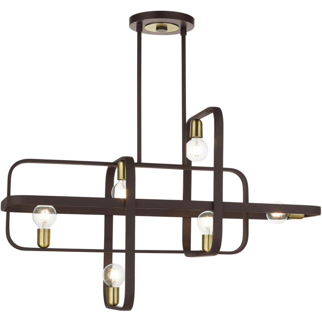 Geometric, dimensional midcentury modern describes the Bergamo collection. This wrought iron piece is finished in bronze and combines with antique brass finish accents. Bulb positions provide a playful engaging warmth and rich glow. The architectural designs of this collection give a new face to modern, loft, transitional or contemporary space. This asymmetrical six light linear chandelier will make a center piece to a large living room, dining room or over the countertop.