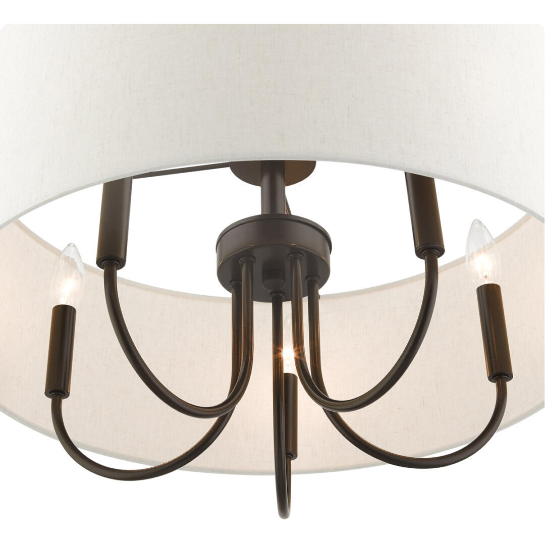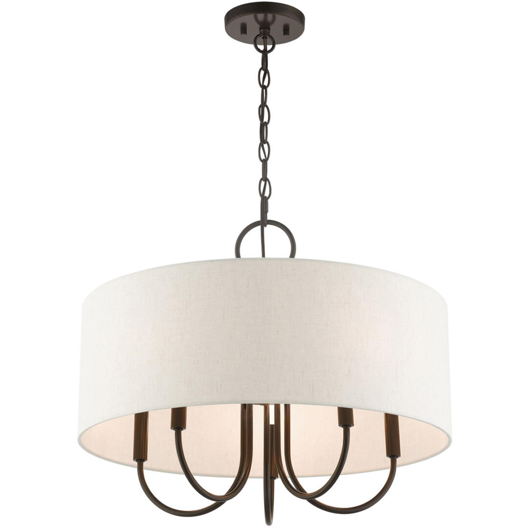 Add a touch of stylish sophistication with the Blossom series, a graceful transitional collection. Look no further if you crave to add warmth and richness to any formal or casual interior. The elegant curved arms suspended under the handcrafted hardback oatmeal colored shade will create a timeless feel to the living room, dining room or a bedroom. This meticulously crafted five-light pendant chandelier is shown in an English bronze finish.