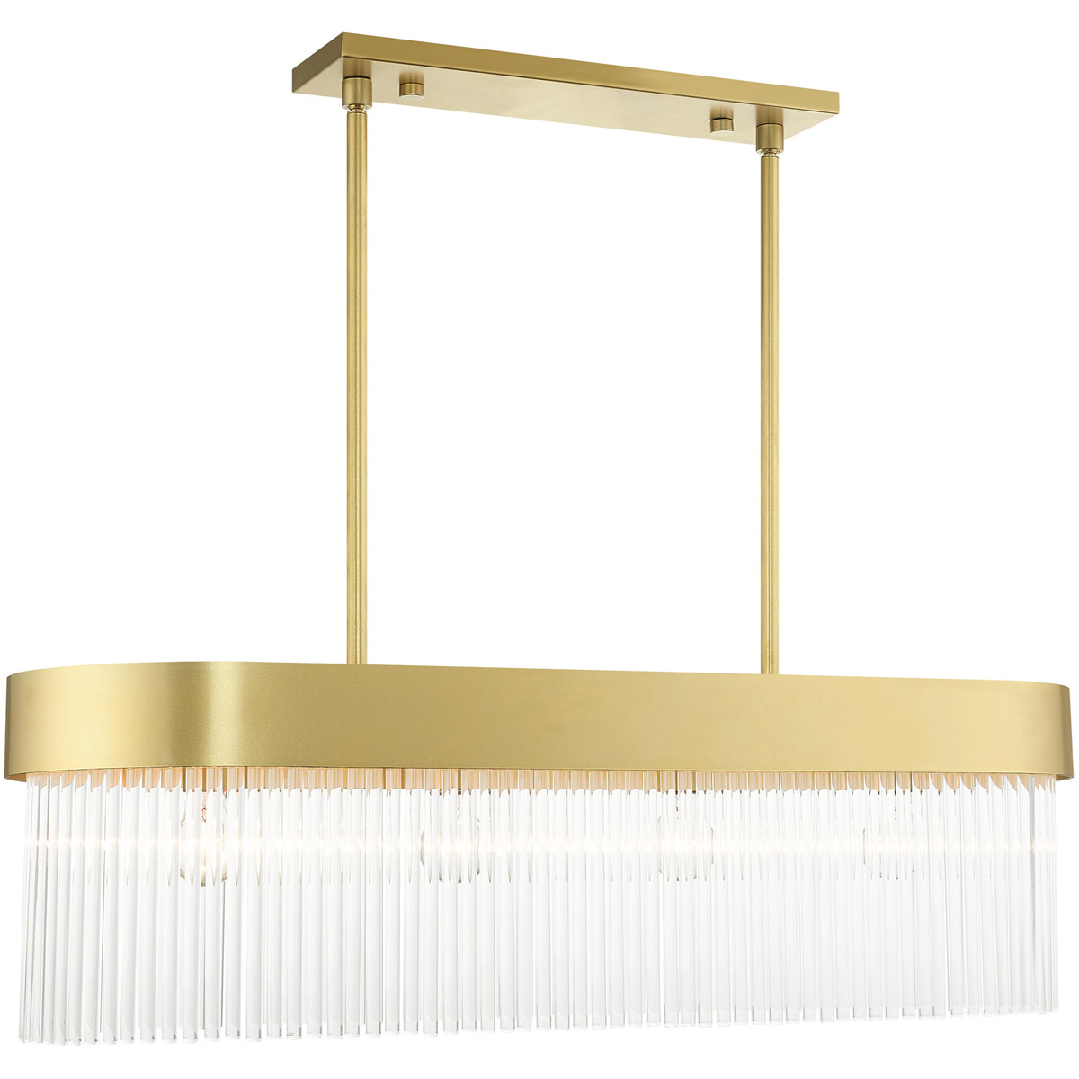 The Norwich four-light linear crystal chandelier will become an attention-grabbing feature in your modern home decor. The soft gold finish graces the design with elegance and charm, providing a timeless and glamorous quality to any interior. The clear crystal rods give the sconce a sleek and attractive appearance.