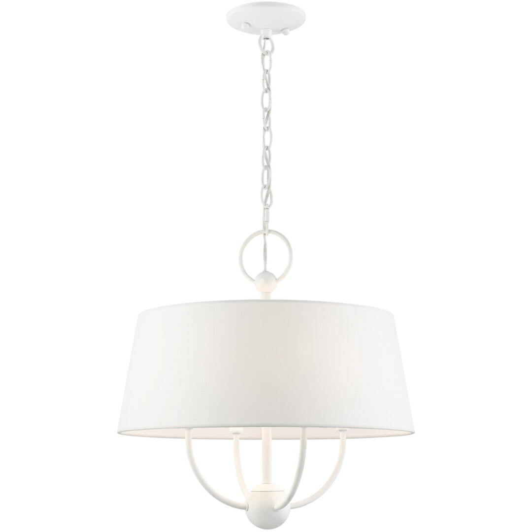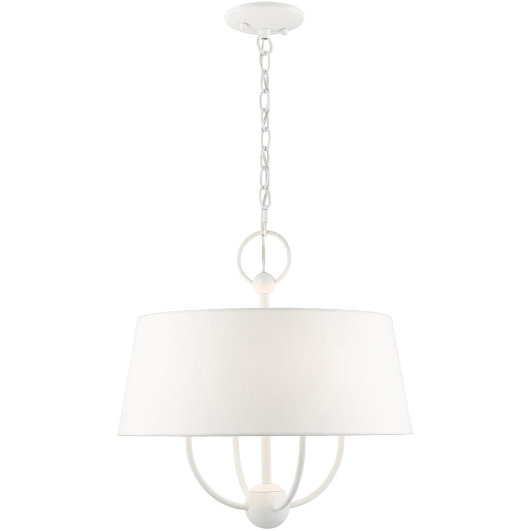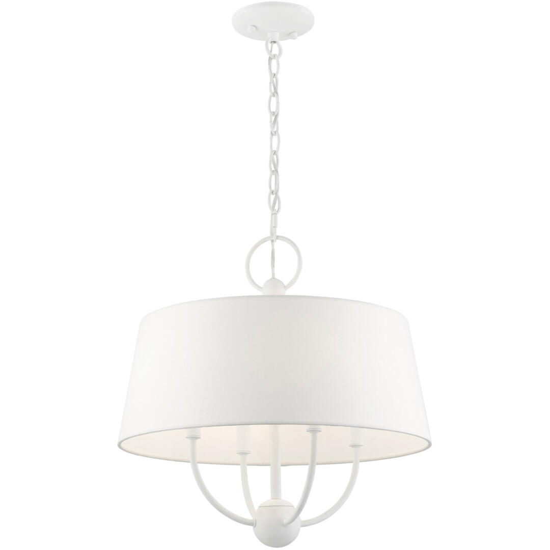 Updated traditional elegance and casual style defines the Ridgecrest collection. The curvilinear steel frame and accented ball is offset by a hand crafted off-white fabric hardback shade. The essence of this collection amplifies today’s approach to transitional style interior. This white finish four-light chandelier will add a casual flare to your bedroom, living room, dining room or kitchen.