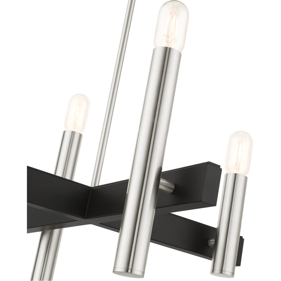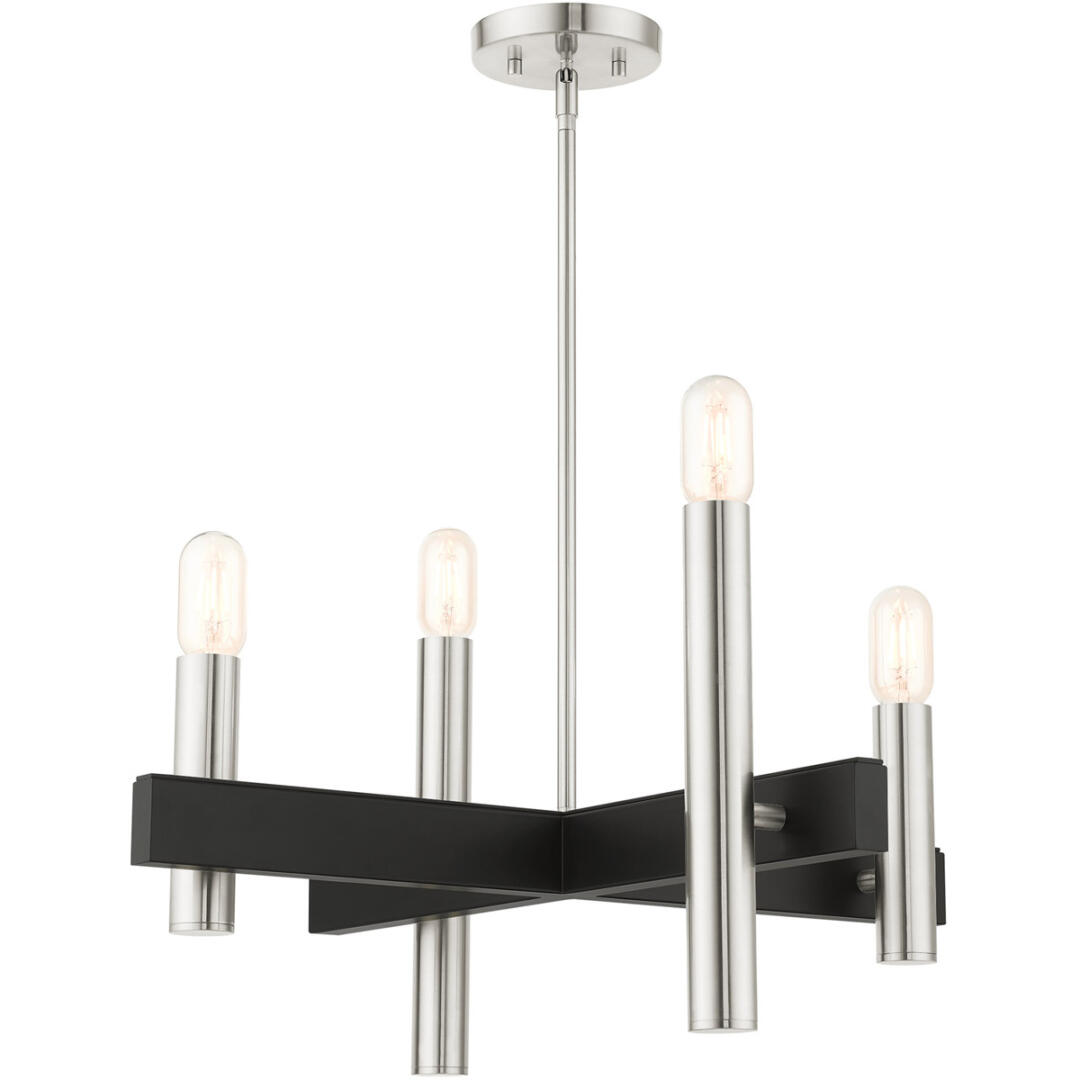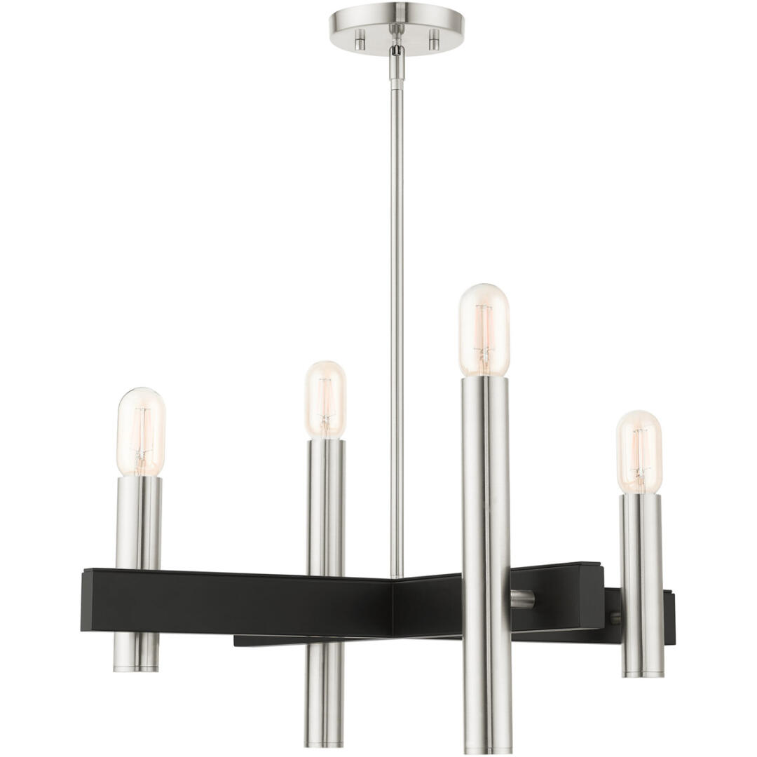 The dramatic lines of the Helsinki collection remind of early modern Scandinavian style. The massive candles rise on the contrasting bar at different heights dynamically emulating the shape of a city skyline. This four-light exposed bulb chandelier comes in a brushed nickel finish accented with black finish bars. Great for any space where dramatic statement is needed such as a kitchen, dining room, living room or a bedroom.